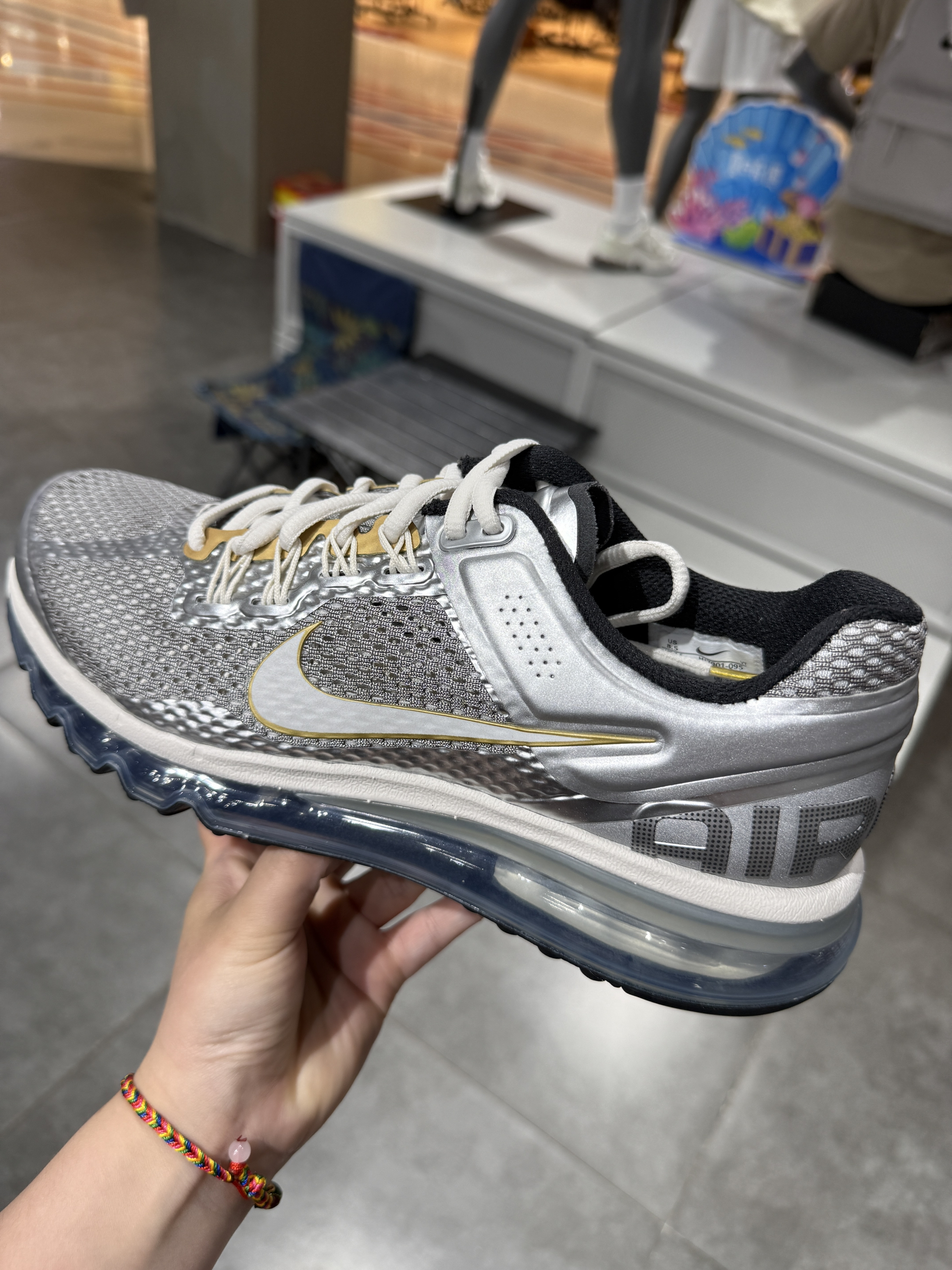 复古银色 air max可视气垫 爆发力强 时尚感拉满 鞋身整体 大网眼 达到一定的透气效果 刚上脚的时候可能会有一点点硬 正常哒 可能体重比较瘦 Max 最大的优点就是越踩中低回弹反馈越好 so一定要穿几天磨合呦