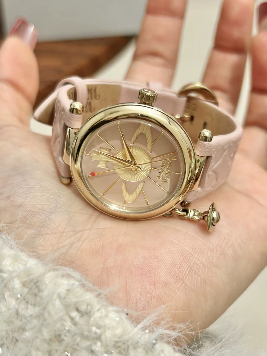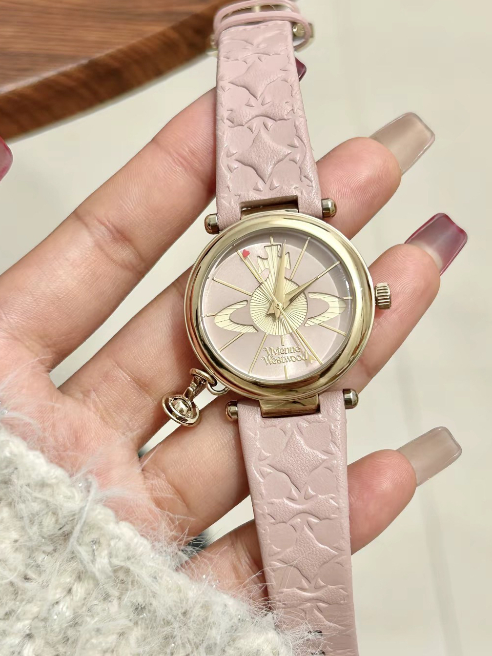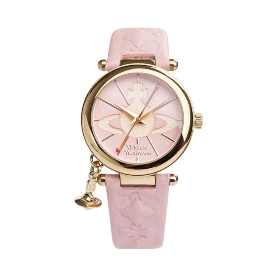 哪个女孩子可以拒绝介个粉色腕表哎~ 就是介个vivienne westwood/维维安·韦斯特伍德 的石英表~ 粉粉的皮质表带好适合女孩子哦 粉色表盘上有土星logo 侧面还有一个土星小吊坠 细节蛮不错呢 秒针上有一颗小爱心 我觉得戴在手腕上有种温温柔柔的感觉 日常搭配白色或者红色毛衣 衬衣都不错