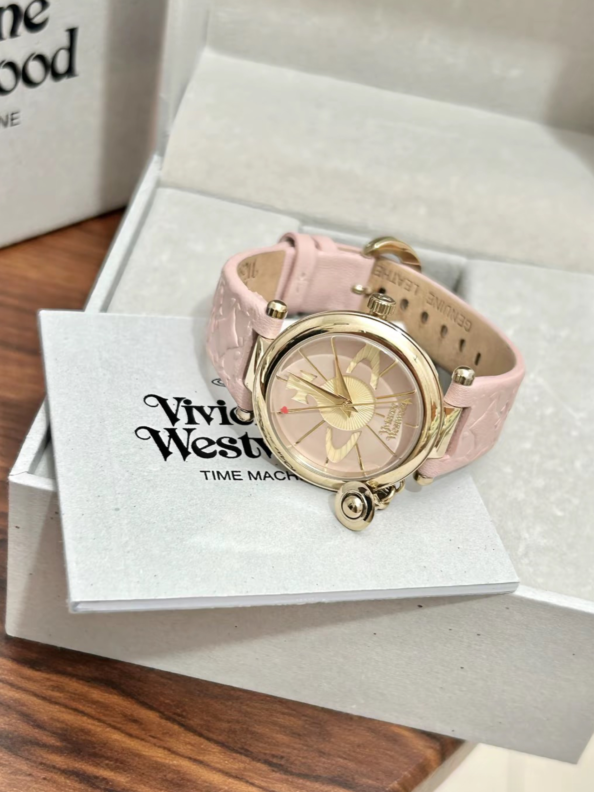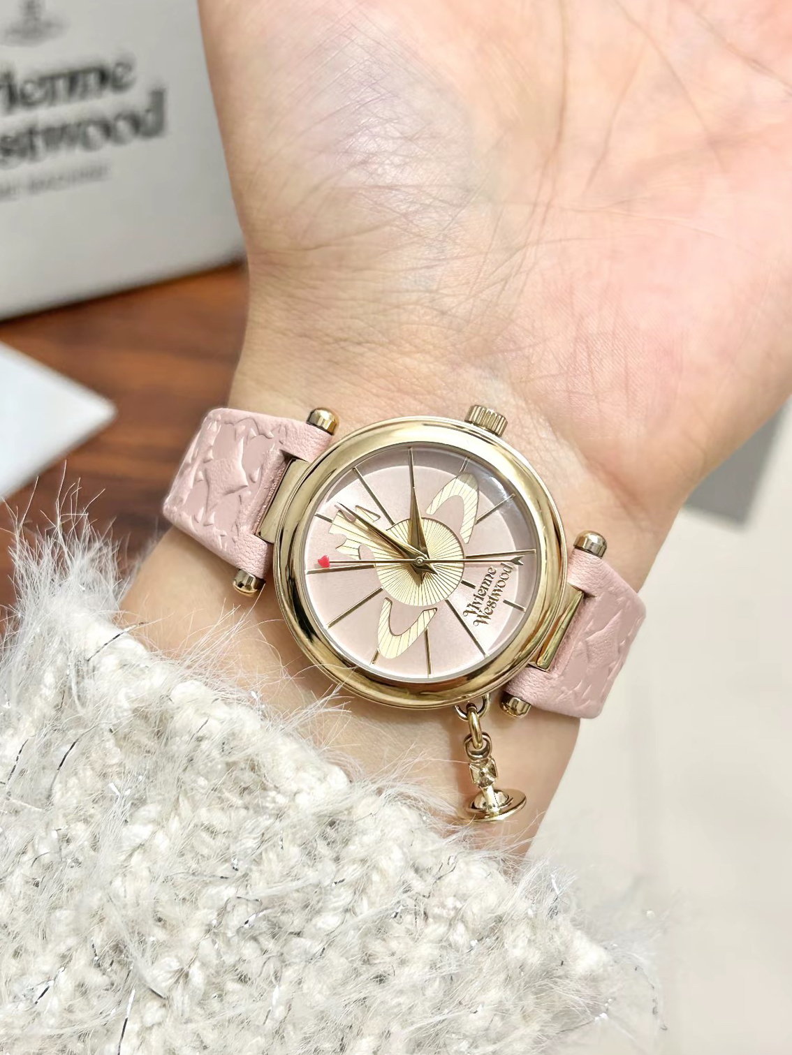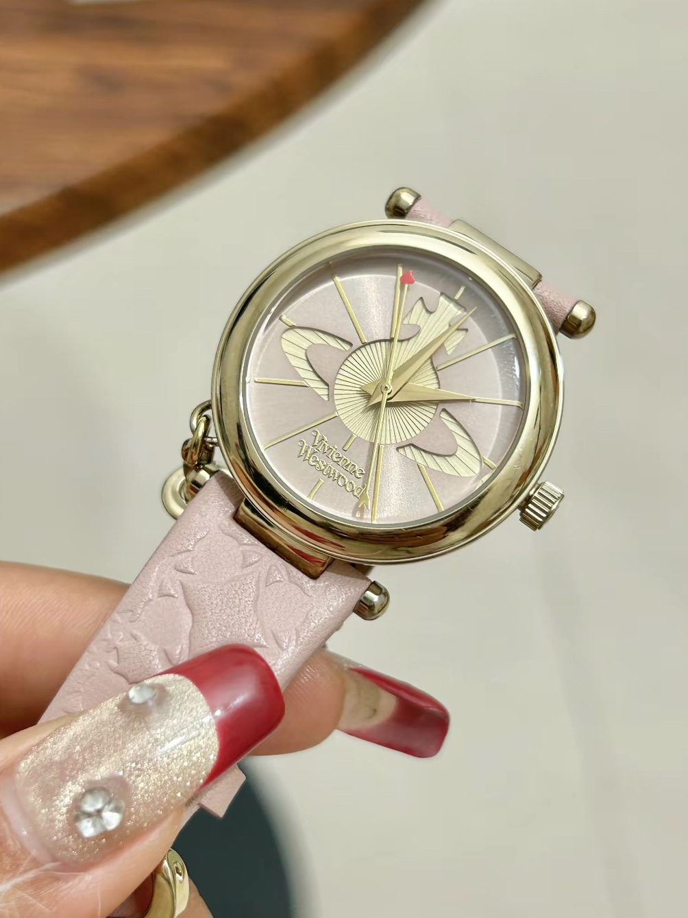 哪个女孩子可以拒绝介个粉色腕表哎~ 就是介个vivienne westwood/维维安·韦斯特伍德 的石英表~ 粉粉的皮质表带好适合女孩子哦 粉色表盘上有土星logo 侧面还有一个土星小吊坠 细节蛮不错呢 秒针上有一颗小爱心 我觉得戴在手腕上有种温温柔柔的感觉 日常搭配白色或者红色毛衣 衬衣都不错