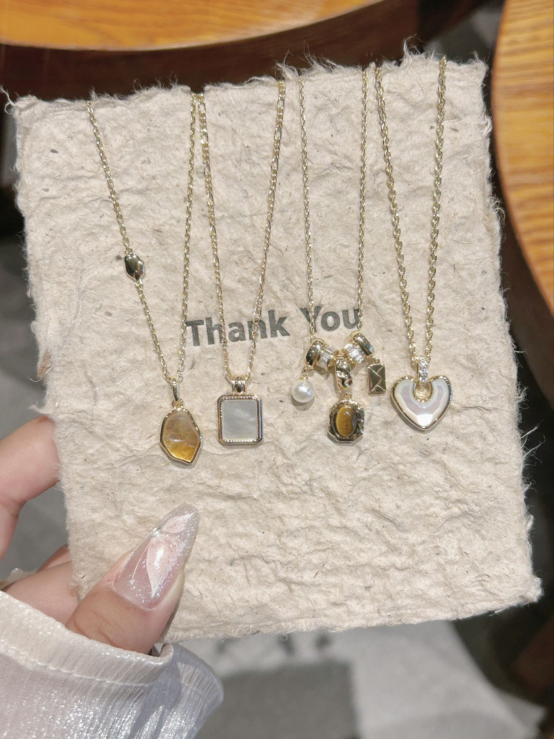 浅分享一下我囤了一学期的轻奢感项链吧 都是介个Amber Lollipop 家不同风格的配饰 金色系列的好有复古感 有贝母的 珍珠的 黄水晶和赭石的搭配上有质感的金色链条 戴在脖子上还蛮有贵气感呢 我觉得每一条都蛮独特呢 日常的时候搭配上我的牛仔裙还是比较精致贵气滴