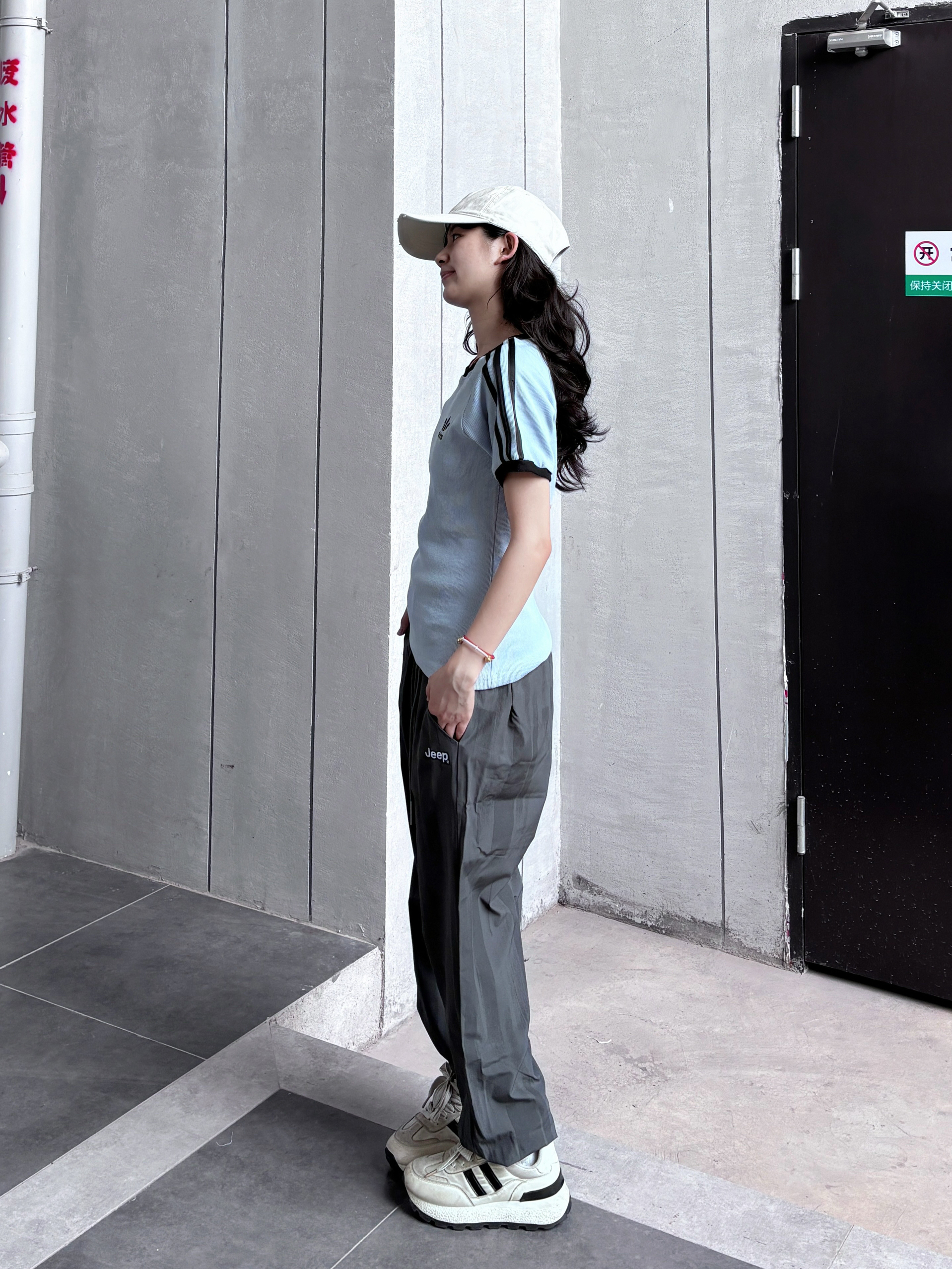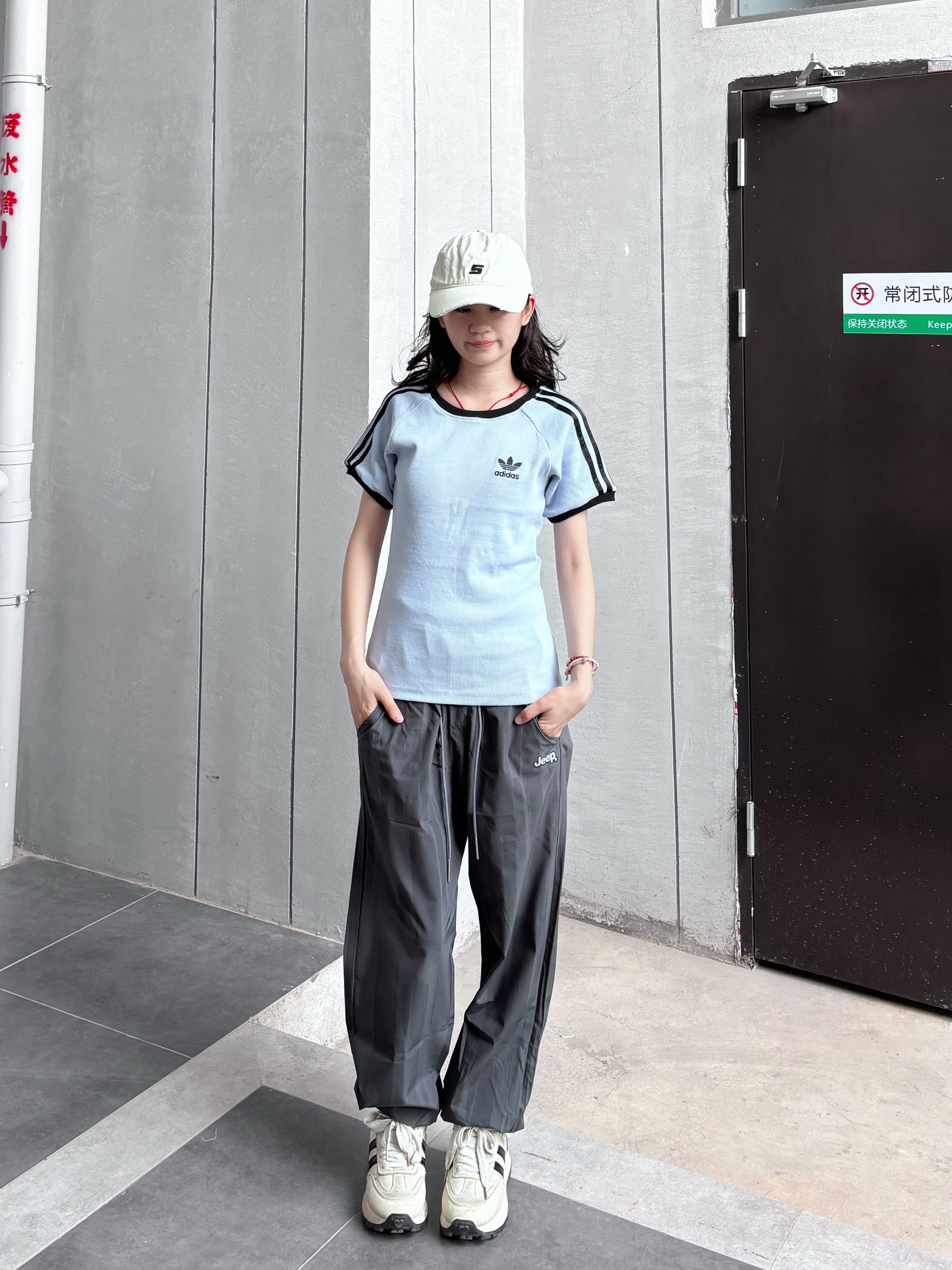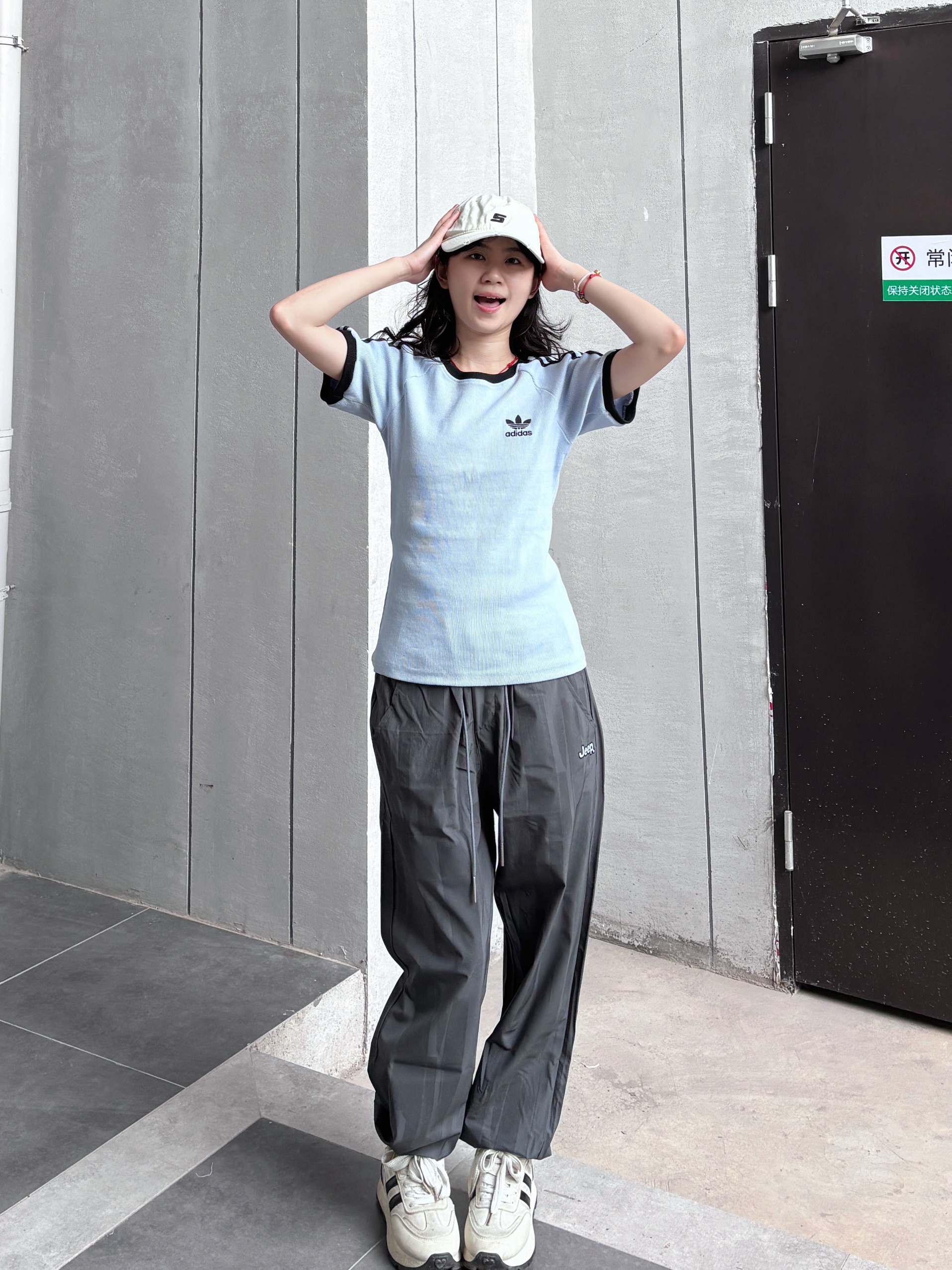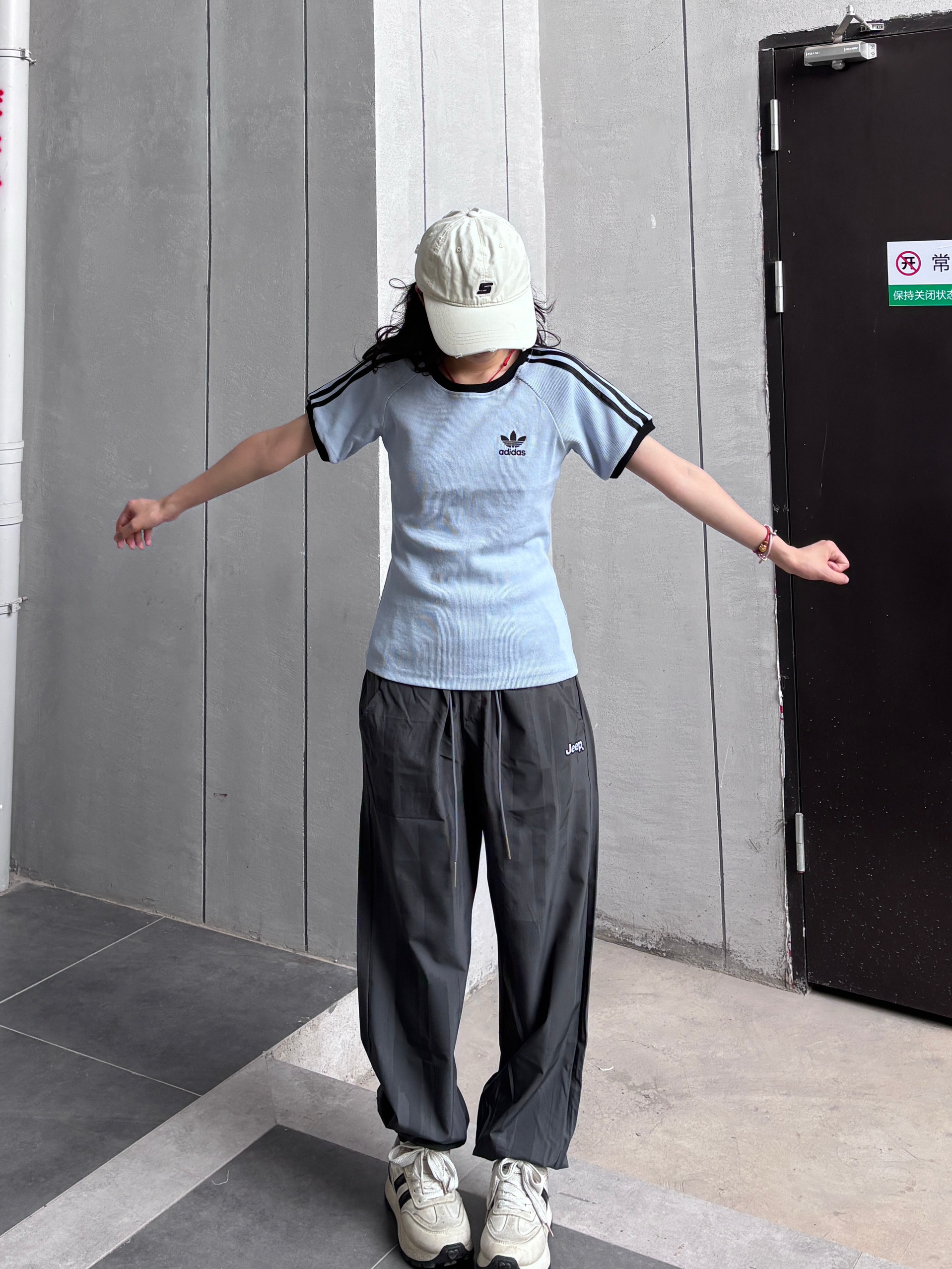 今天分享超舒服的休闲穿搭!浅蓝阿迪短袖,复古三道杠+小标,简约又有辨识度,面料透气不闷汗。搭配深灰束脚裤,再踩双复古运动鞋,日常出街、运动都超合适,轻松拿捏松弛感~版型也不错哦😌质量还是挺ok的呀可以哦