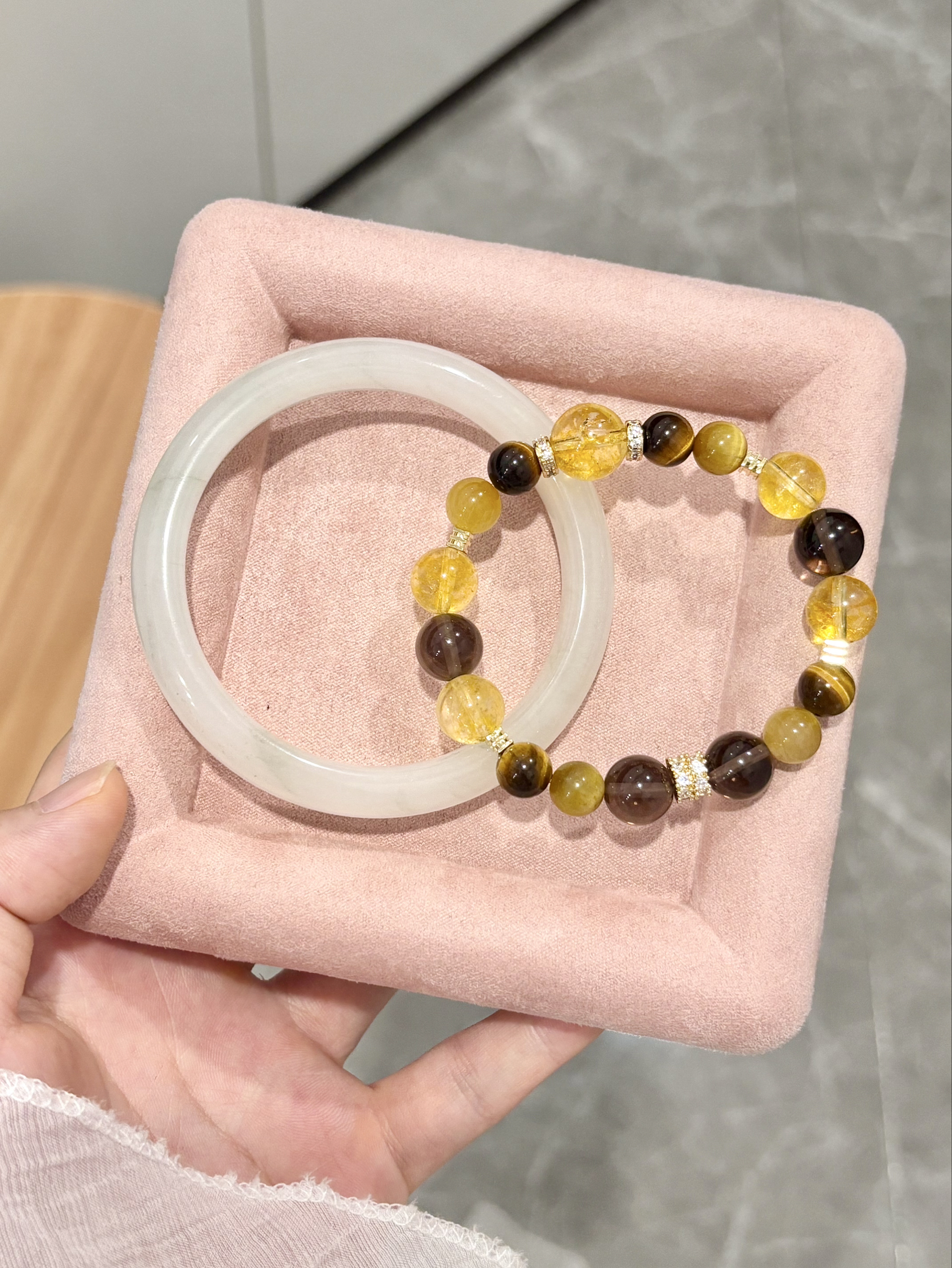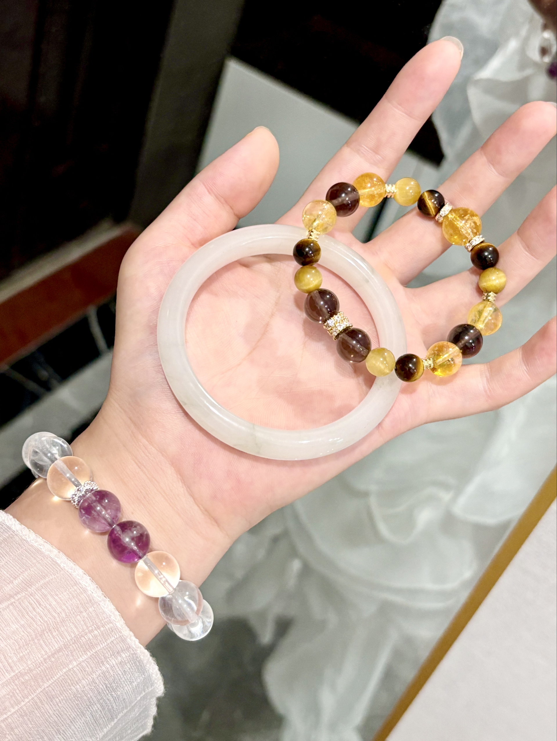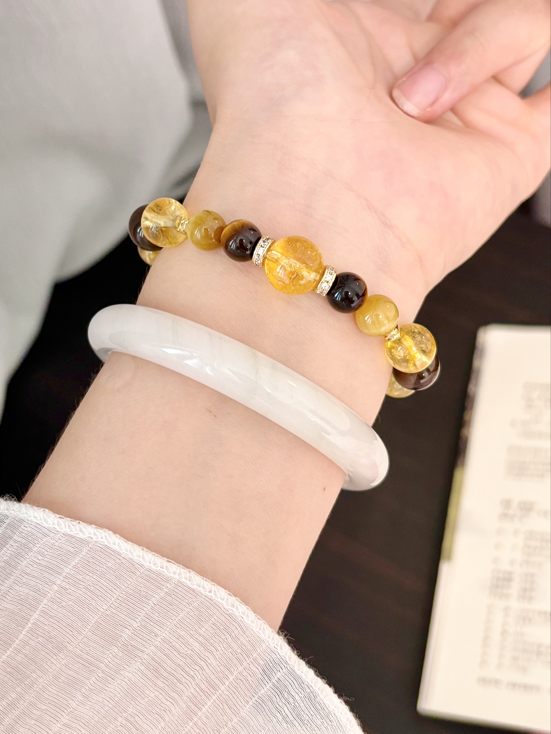 无意中get到了新的叠戴组合 就是新中式玉镯搭水晶手串啦 我觉得和黄水晶叠戴会显得贵气 和白水晶搭让人感觉很清冷气质哦 戴在手上还叮当响吼吼看啊 我平时穿旗袍/小裙子戴着都挺适合的~