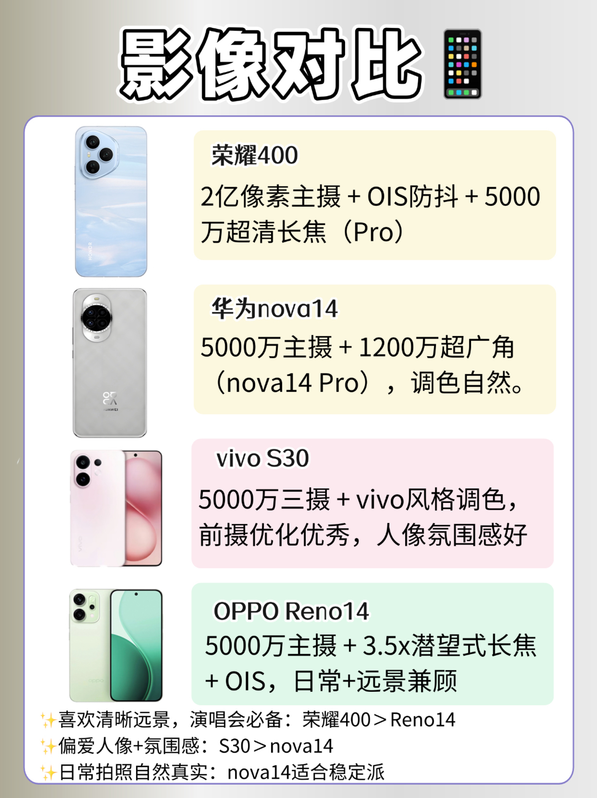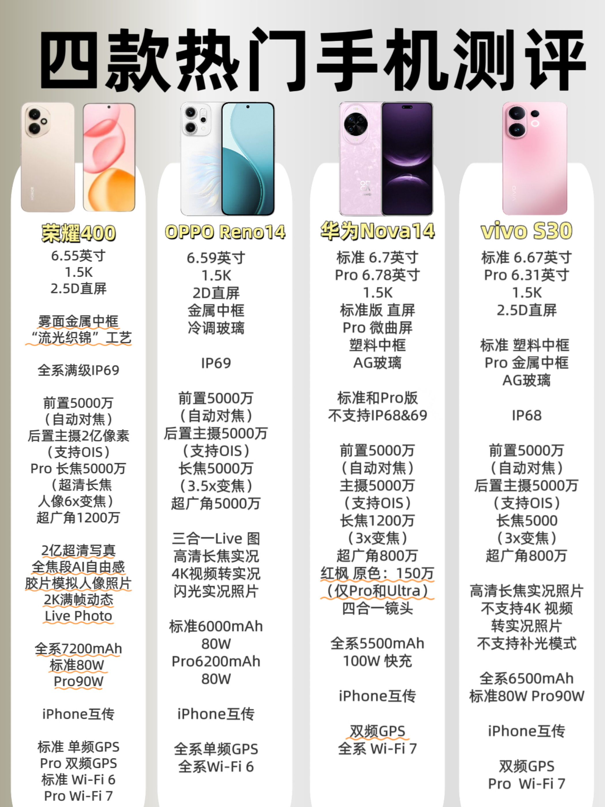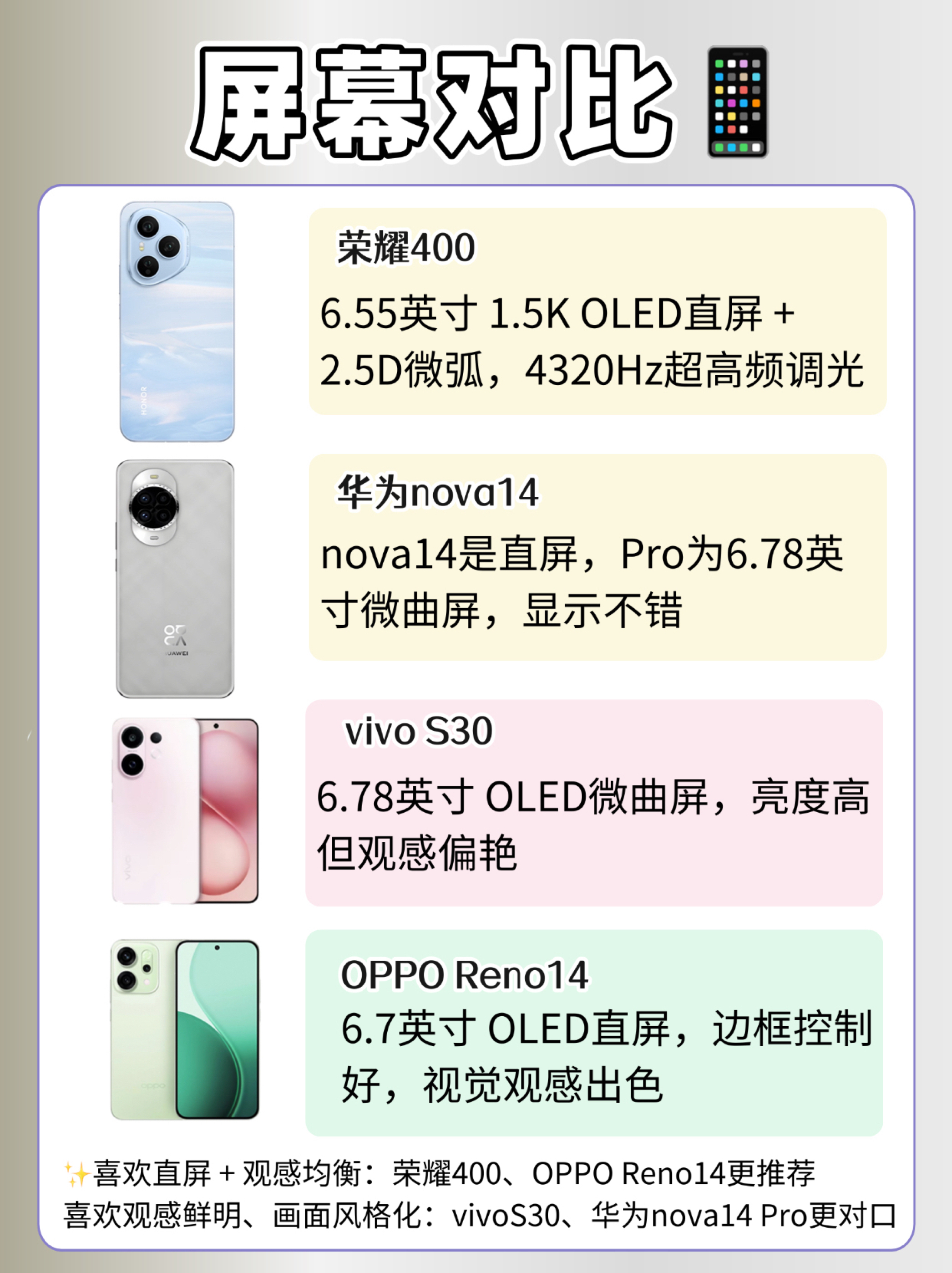 荣耀400 / OPPO Reno14 / 华为nova14 / vivo S30 配置都看着不错,但你到底在意的是屏幕?拍照?续航? 别盲选,看完这篇拆解,直接对号入座! 【屏幕对比】 荣耀400:6.55英寸 1.5K OLED直屏 + 2.5D微弧,清晰度、护眼都照顾到了 OPPO Reno14:6.7英寸 OLED直屏,边框控制好,视觉观感出色 华为nova14:nova14是直屏,Pro...
