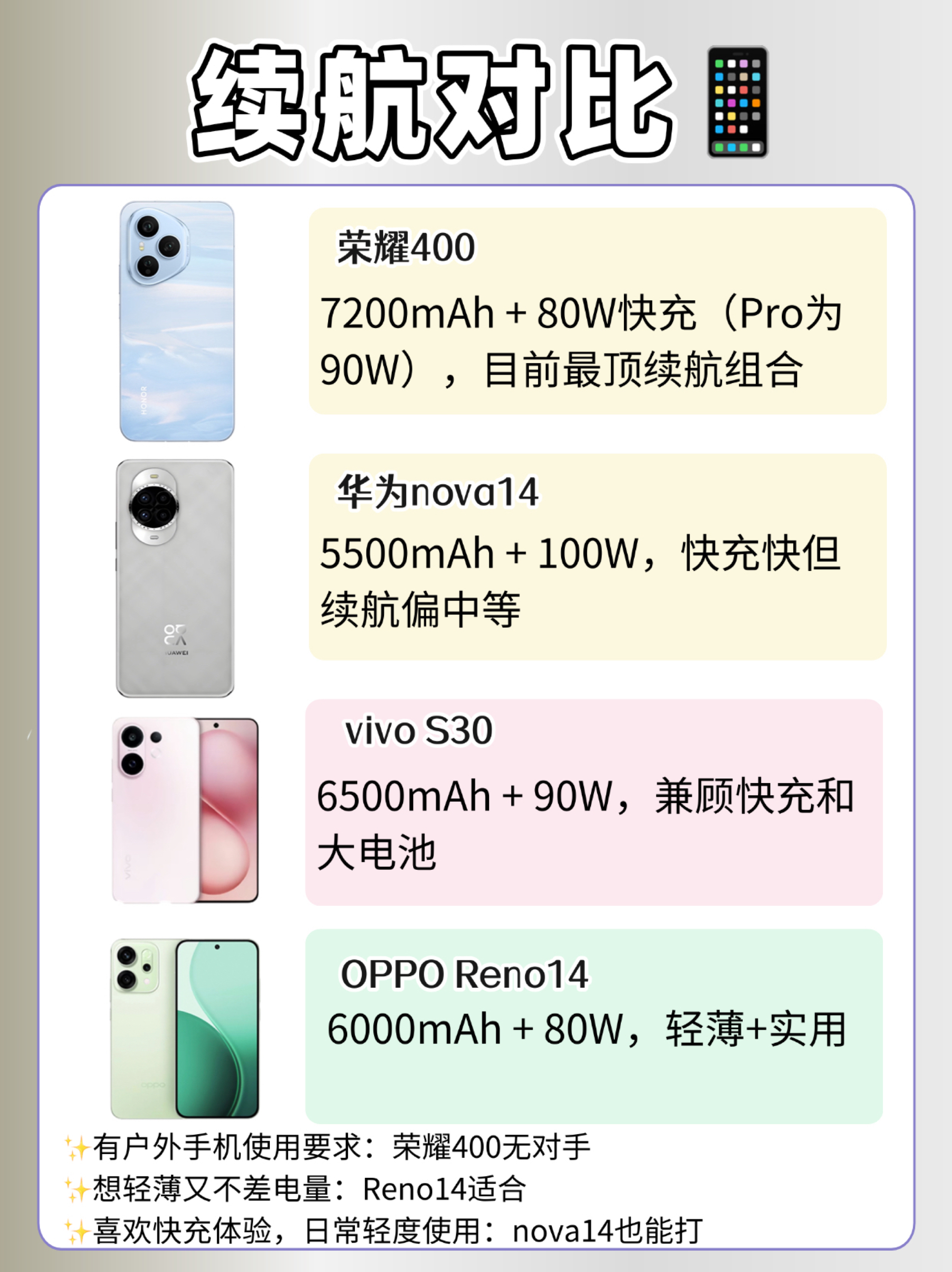 本篇笔记关联了vivo S30 5G 手机 多彩小直屏 超级潜望长焦 全网通 长续航 标配版 闪充 旗舰芯片 备用 大电池 双卡 大内存 高刷 桃桃粉、【AI质感人像】HUAWEI/华为 nova14 5G 手机 后置多焦段质感 鸿蒙AI 100W超级快充 鸿蒙智能 全网通 双卡 昆仑玻璃 直面屏 大电池 北斗卫星图片消息 凝霜白、HONOR/荣耀 400 5G 手机 2亿超清写真人像 大电池 全网通 质感 快充 长续航 双卡 揽月银等商品,为用户提供真实的使用体验和购买参考。