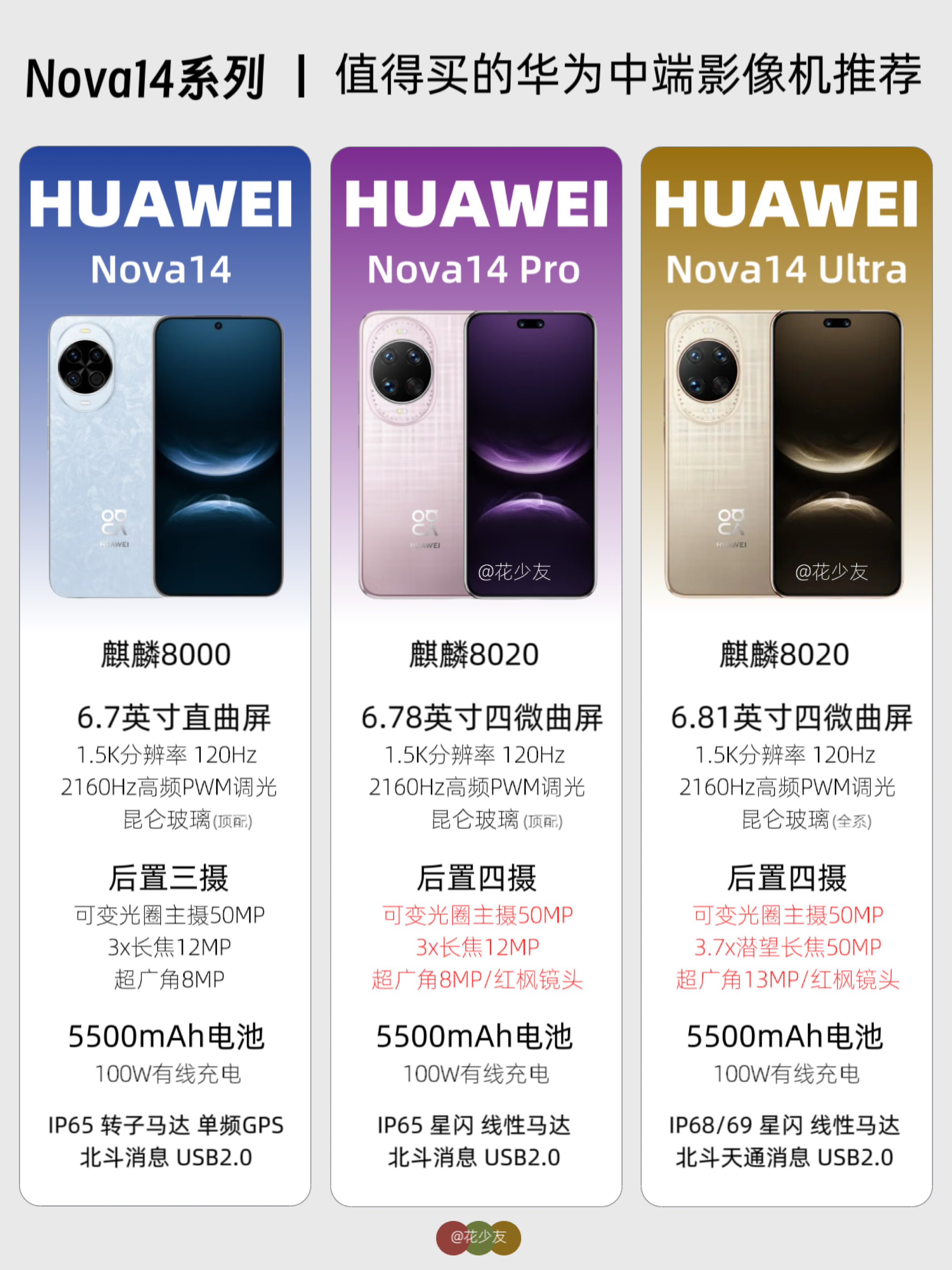 很多想买华为手机的朋友会感到疑惑,同样主打影像,为何Pura和Nova系列的价格差距这么大。今天给大家简单科普一下这两个系列手机的区别。 简单概括:华为Pura 80系列是影像旗舰机型,定位高端;Nova 14系列则主打中端线下市场。 • 性能方面:Pura 80系列搭载麒麟9020处理器。Nova 14标准版采用麒麟8000处理器,Pro和Ultra版是麒麟8020处理器,整体性能稍逊于...