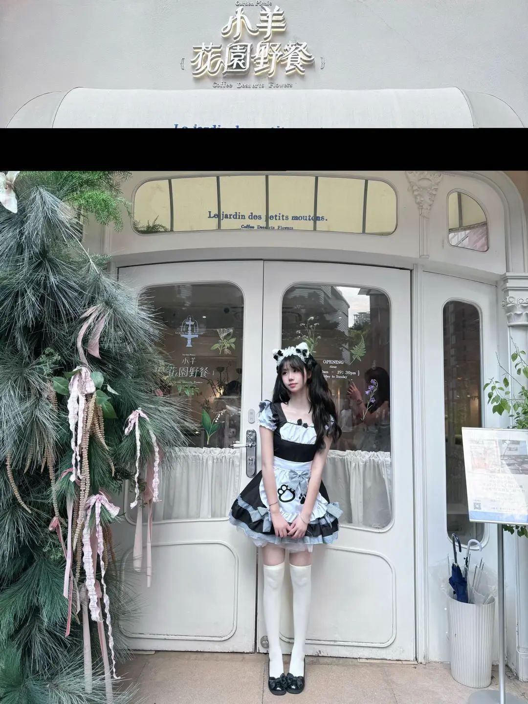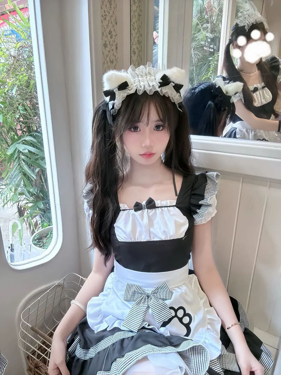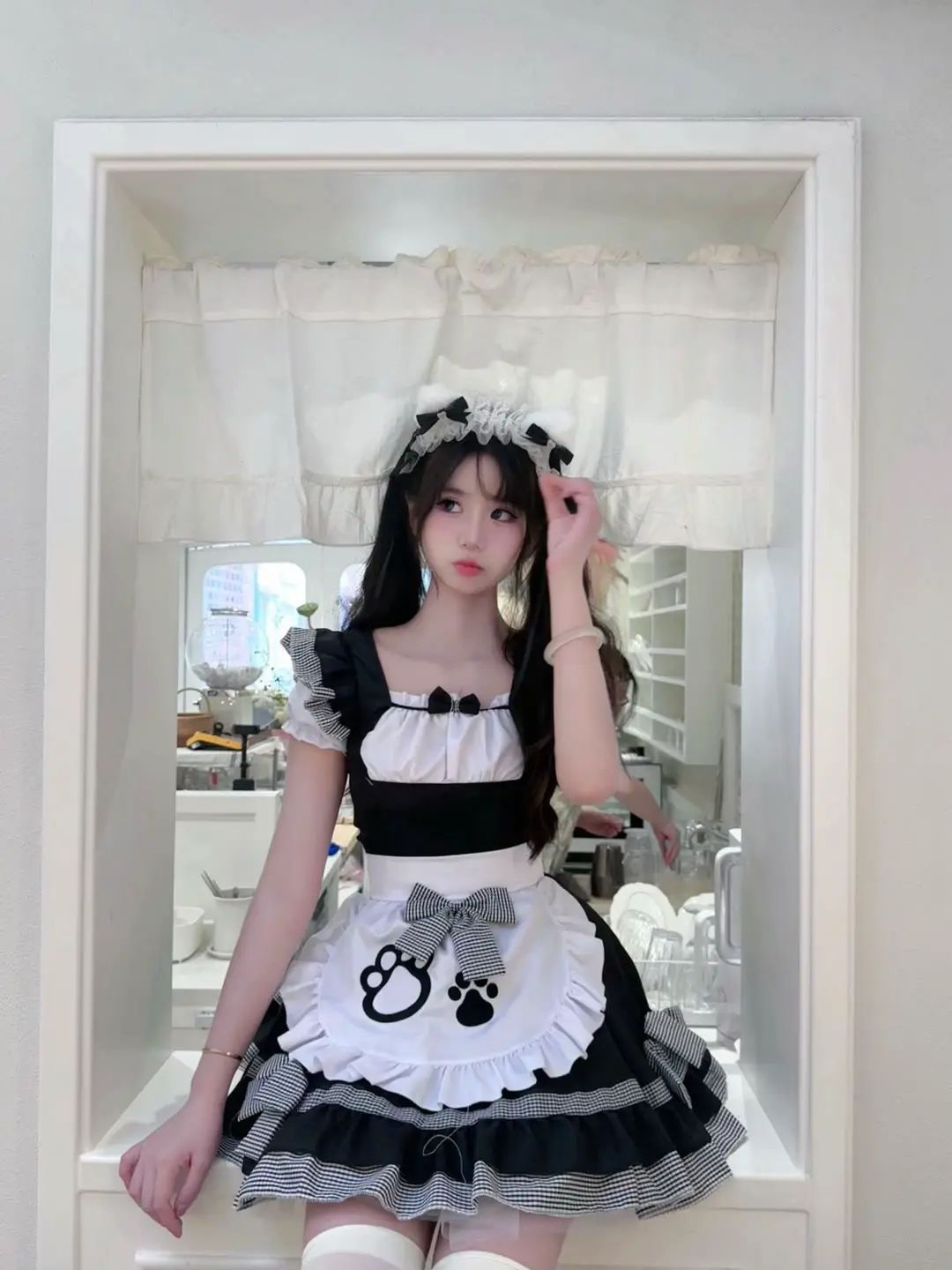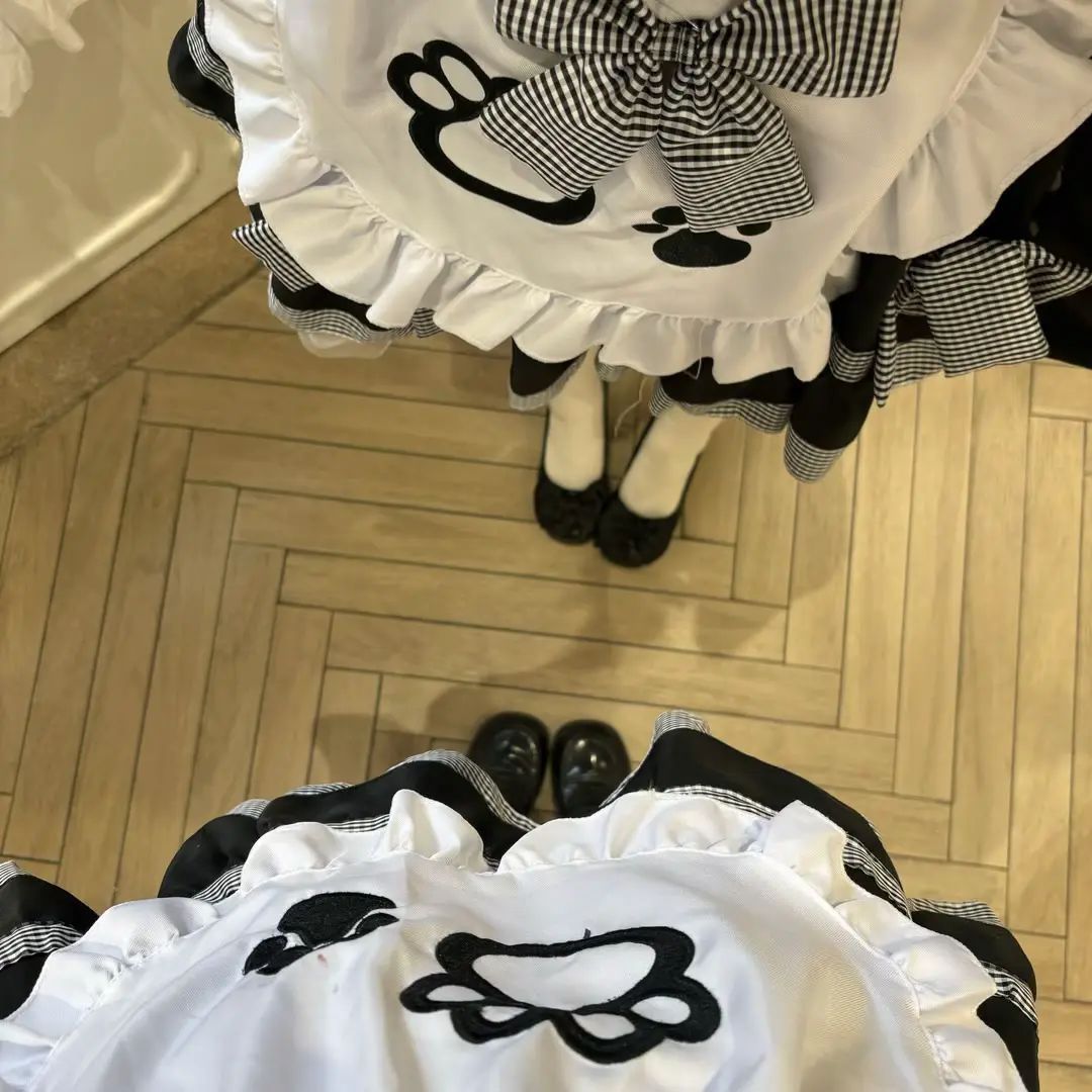 最吸睛的当属那件带有可爱猫爪图案的白色围裙啦!黑白色调的猫爪图案,萌趣十足,仿佛在诉说着猫咪的俏皮与可爱 。围裙上的蝴蝶结装饰,不仅增加了整体的甜美感,还能巧妙地修饰腰身,凸显出少女的玲珑曲线。再加上裙摆处层层叠叠的荷叶边,走路的时候轻轻摇曳,每一步都带着满满的元气,让人忍不住多看几眼。