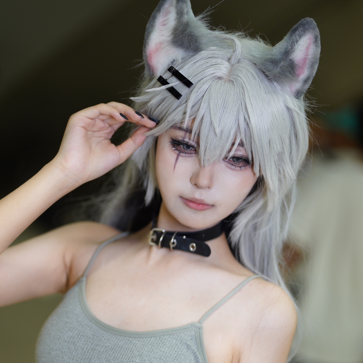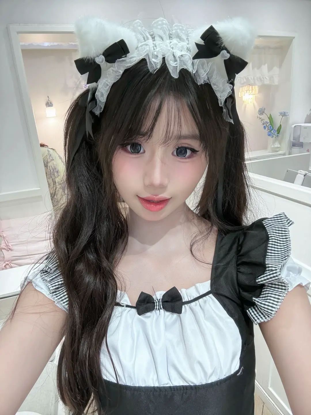 搭配的头饰也超级精致!白色的发箍上装饰着毛绒绒的猫耳和黑白格纹的蝴蝶结,可爱值直接爆表 。戴上这个头饰,仿佛真的化身成了一只灵动的小猫咪,俏皮又可爱。它和女仆装的风格完美呼应,整体造型更加协调统一,拍照的时候氛围感直接拉满,分分钟就能拍出超美的cos照片。