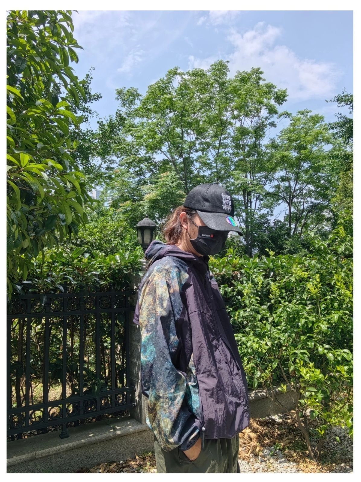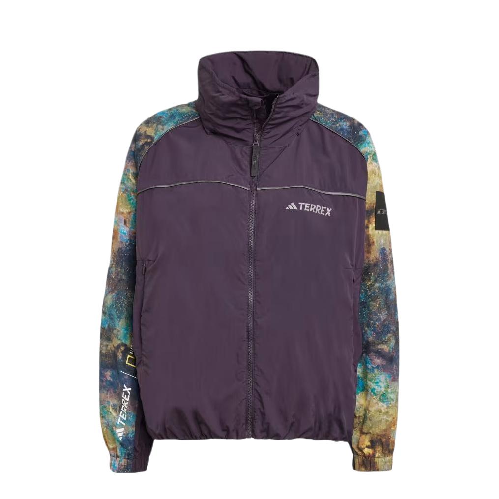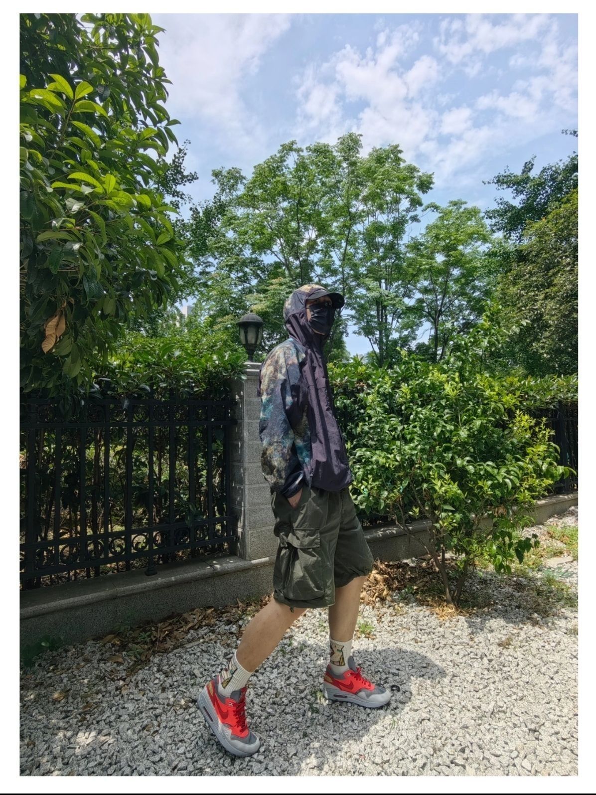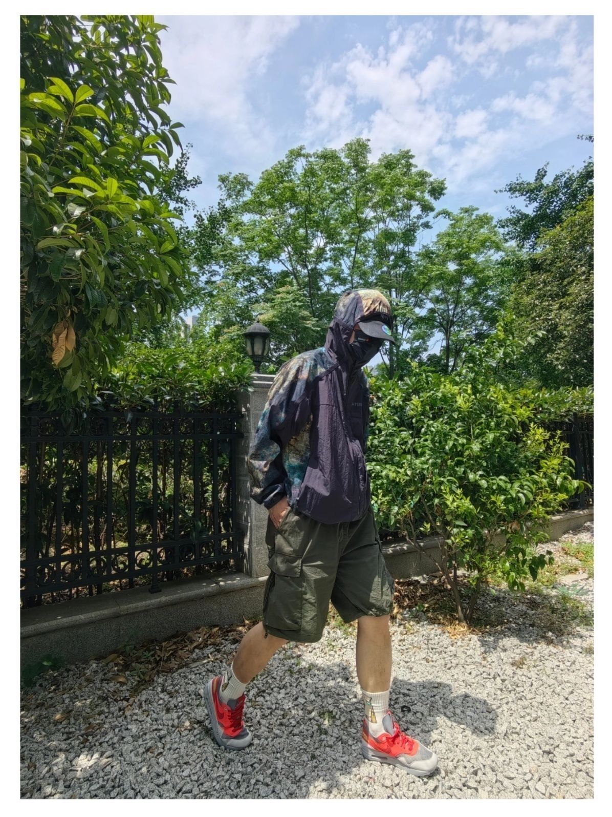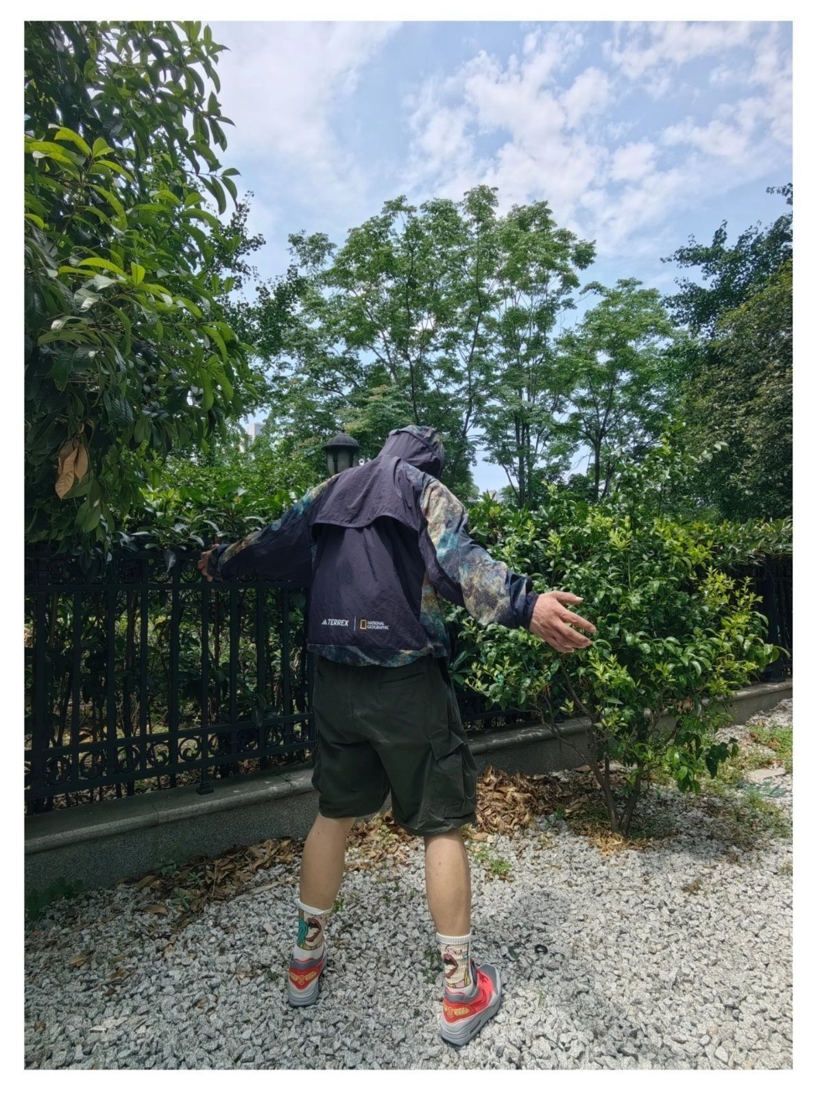 夏日户外出游的机能风穿搭分享 阿迪达斯 联名 国家地理 户外星空印花logo轻皮肤衣防晒服,连帽设计机能风满满 出游搭配。多口袋户外工装短裤,透气复古跑鞋是真不错