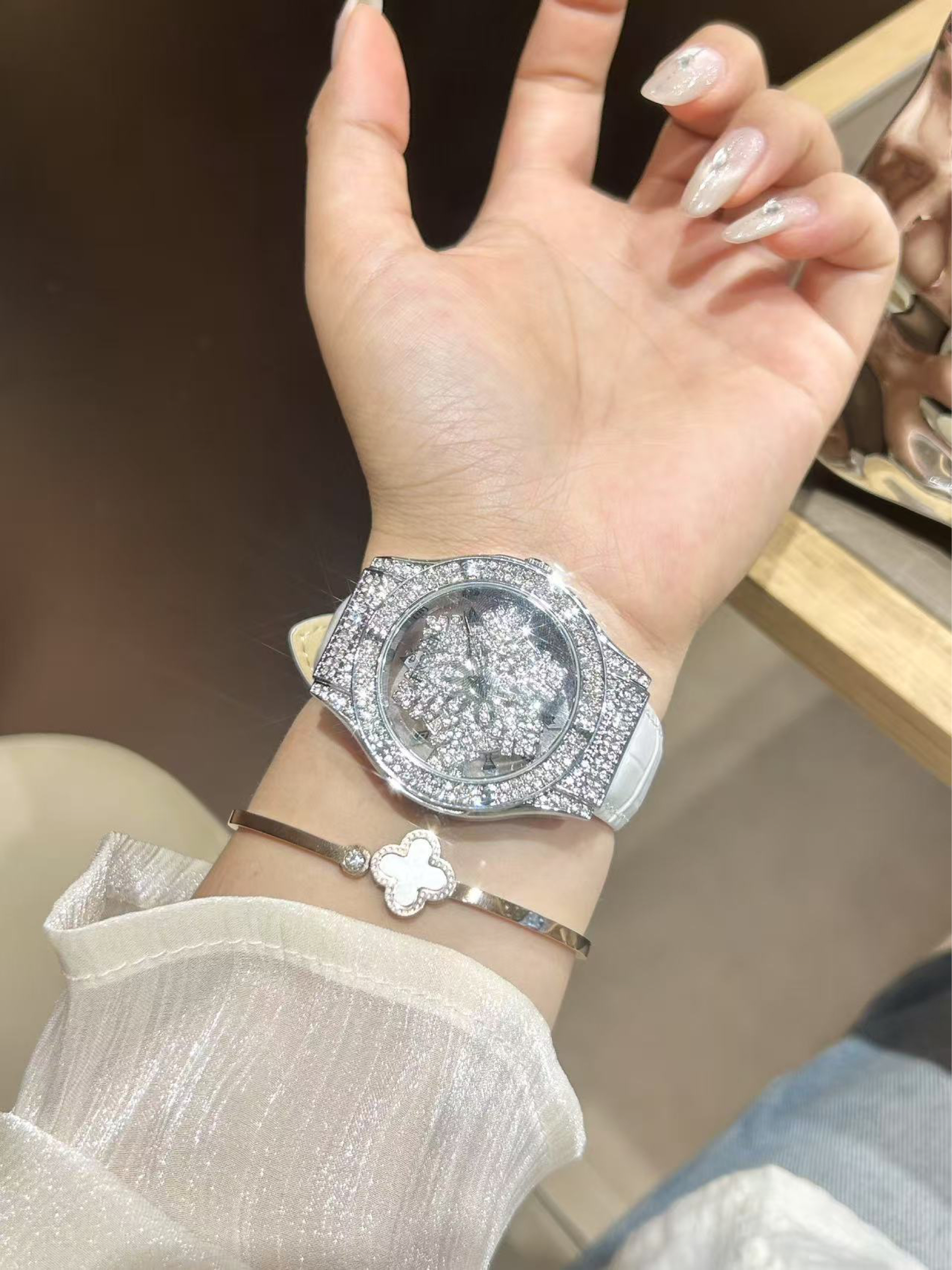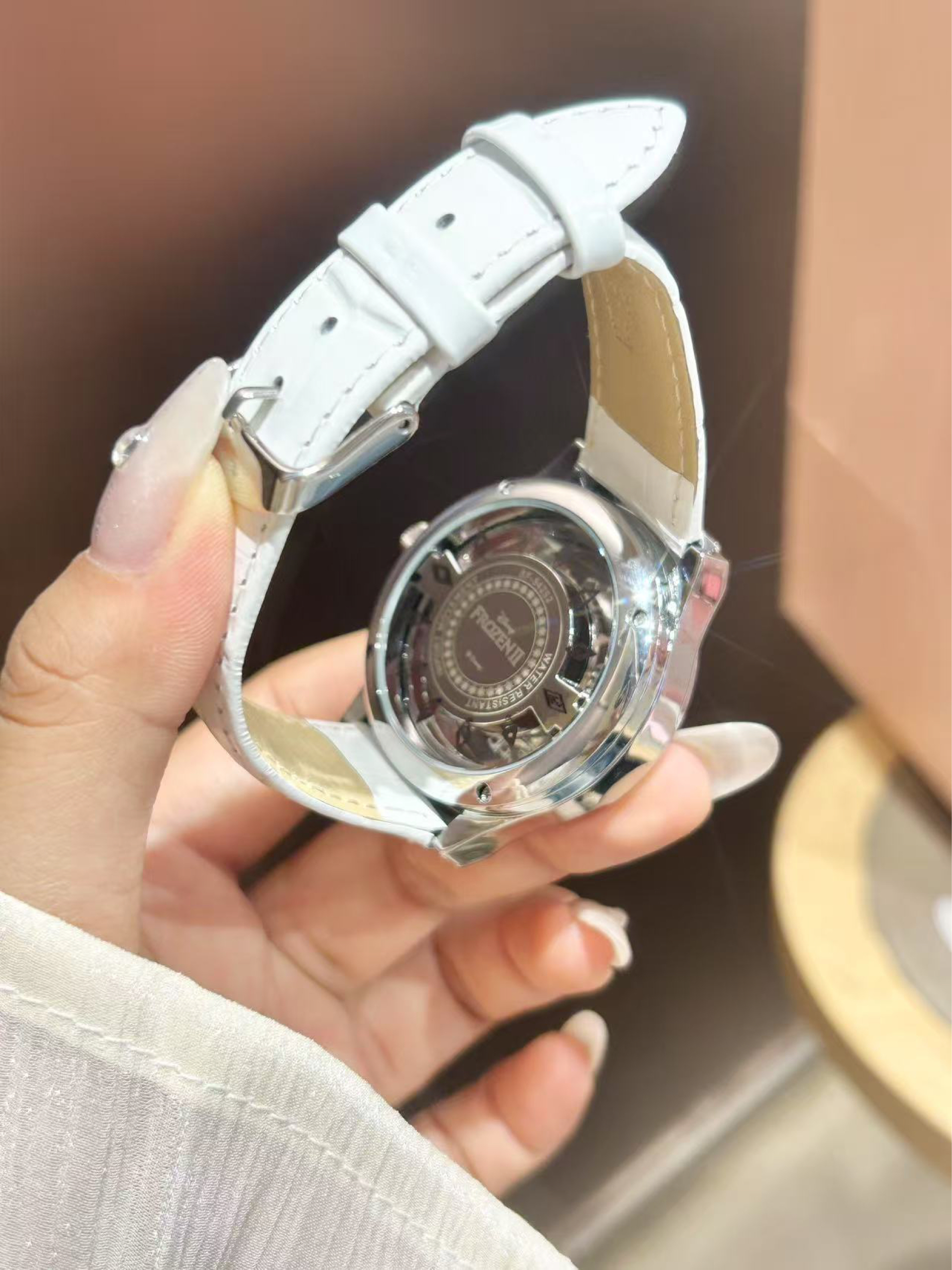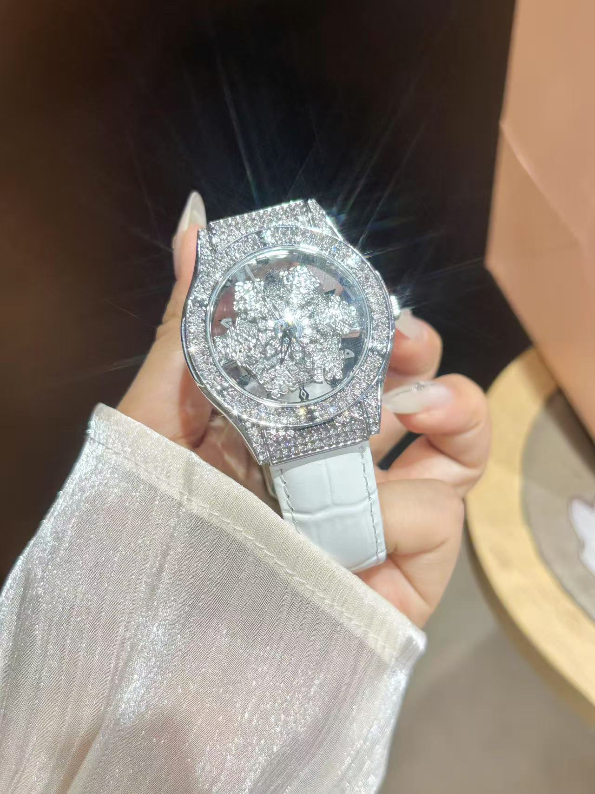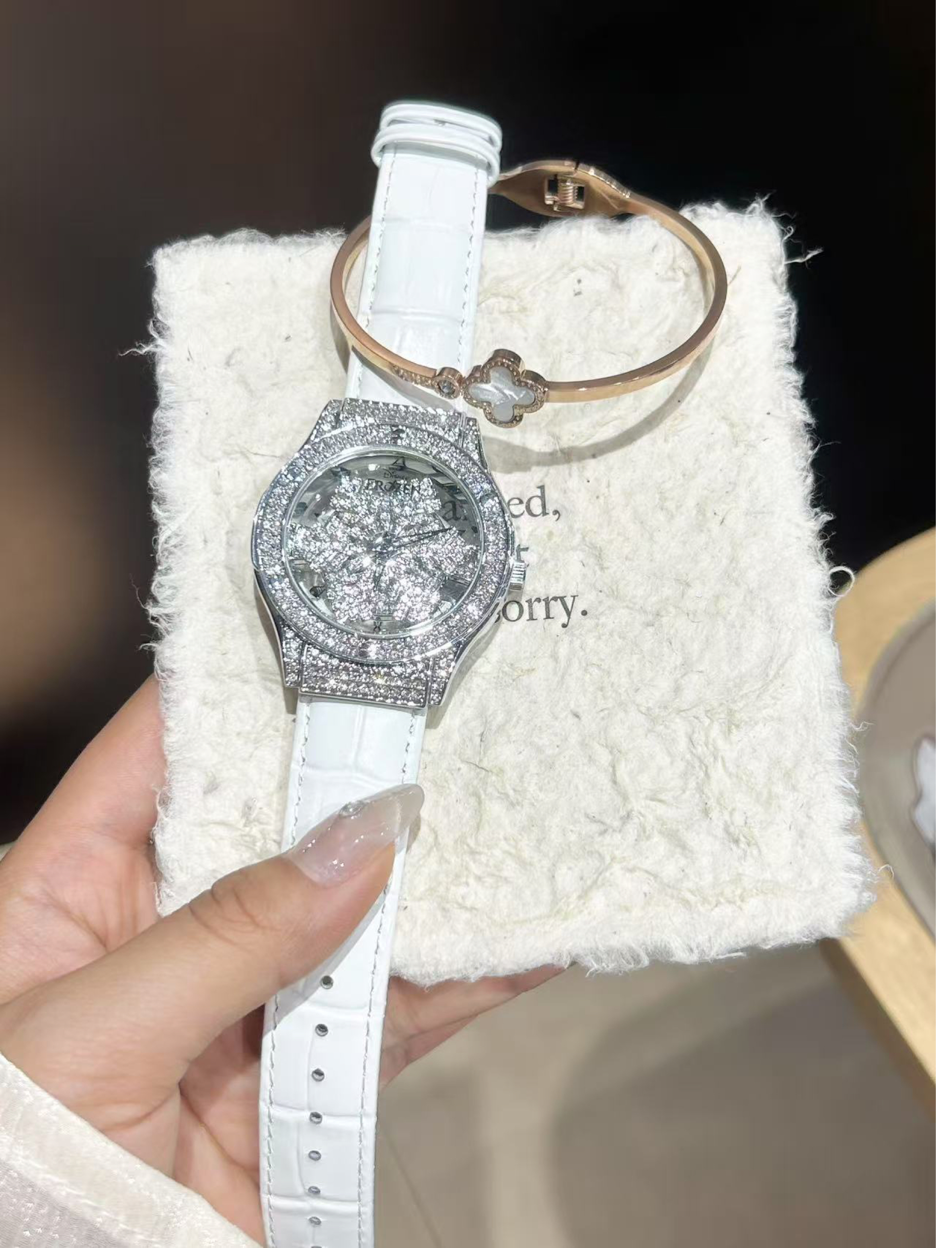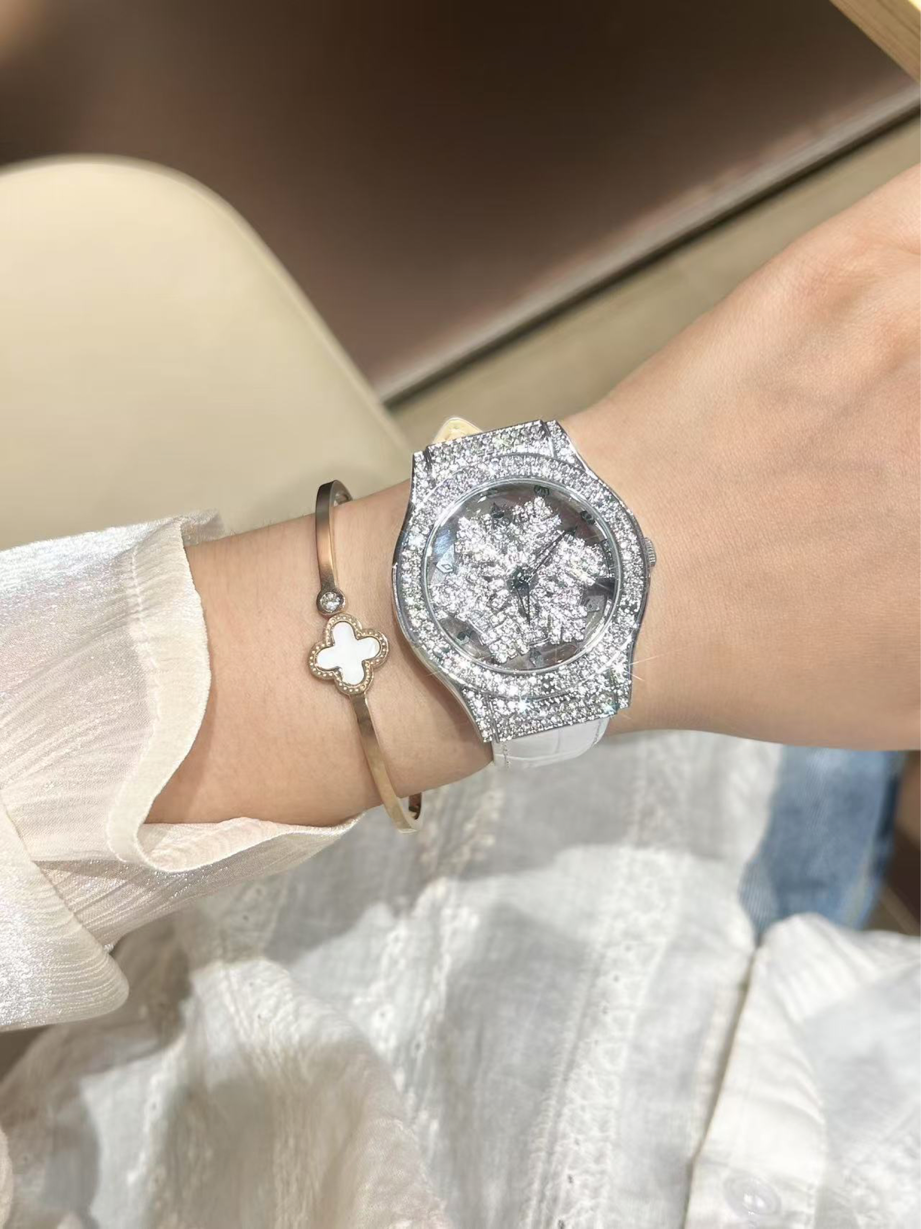 就是介个Disney/迪士尼的雪花表 简约又不失设计感 bling bling的 白色皮质表带搭配上镶钻的小雪花 温温柔柔的 我感觉还蛮精致呢 中间的小雪花还可以随之转动 戴在手腕上妥妥的富家千金即视感呢