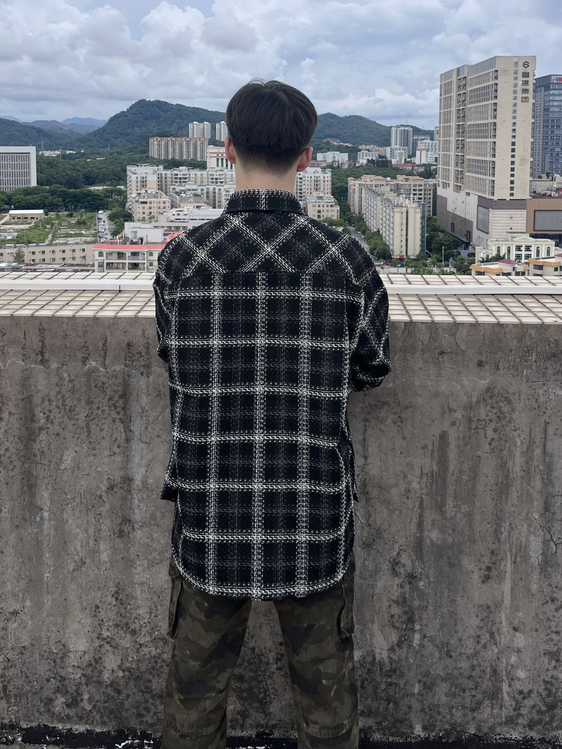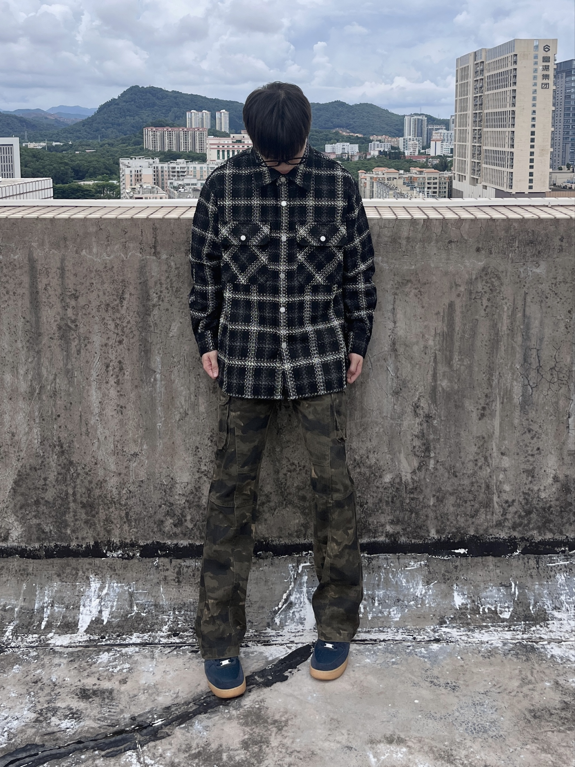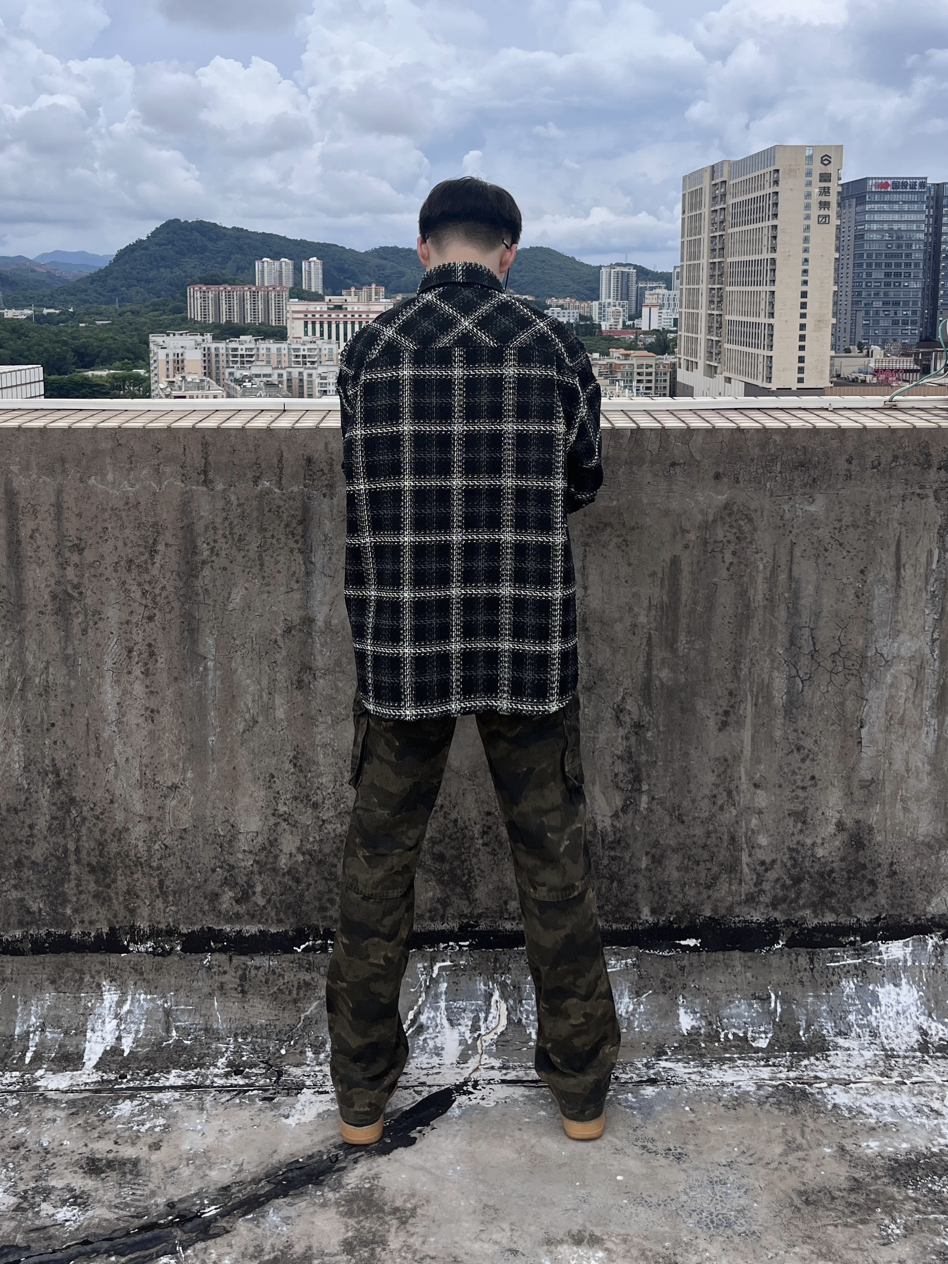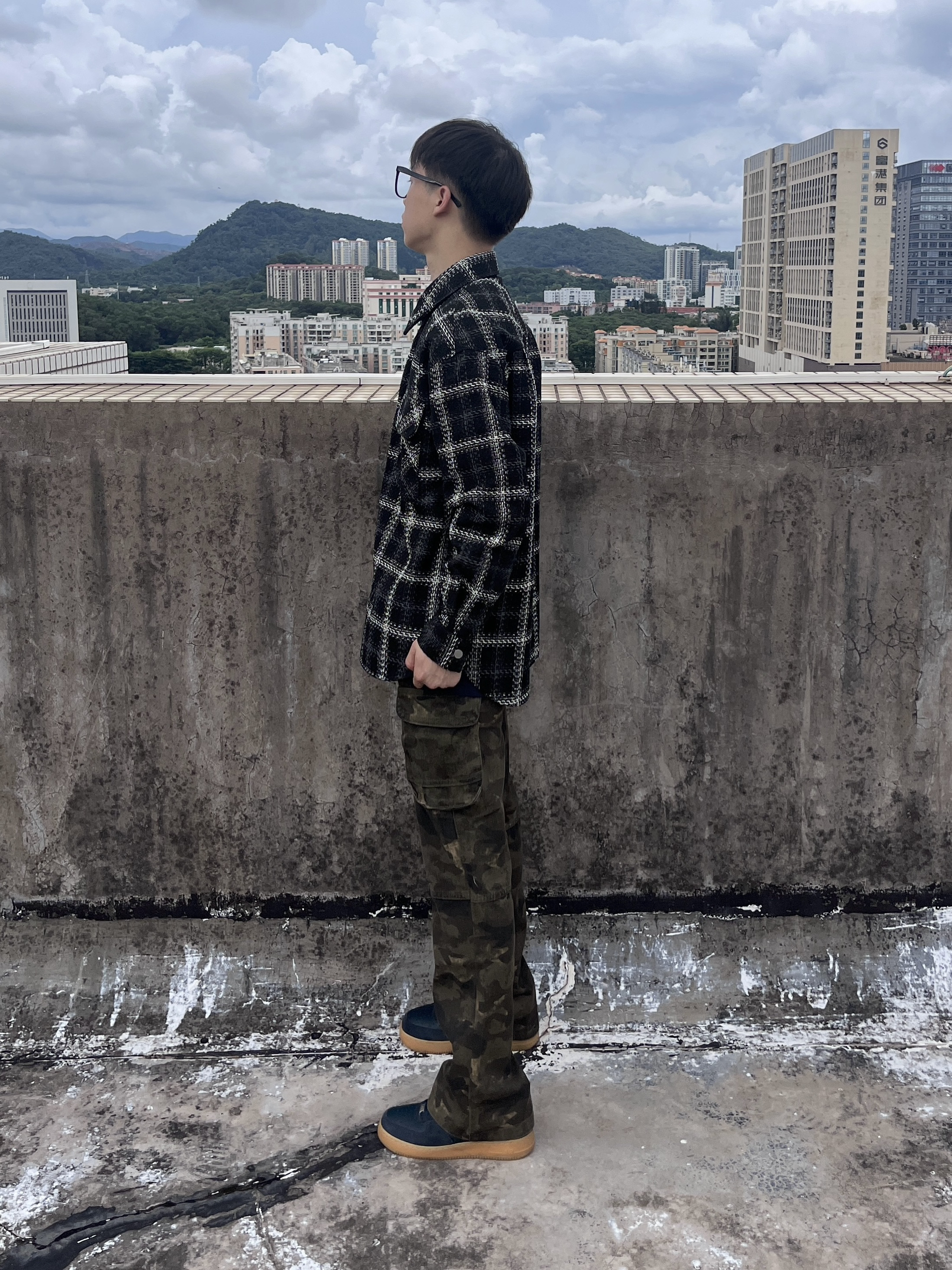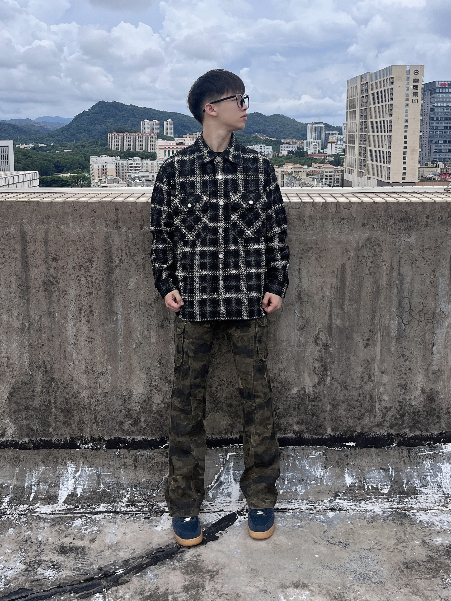 今日份穿搭分享look👀 衣服是 GXG 家的黑色小香风外套👔 条纹纽扣设计气质感拉满🔥 版型也很正 再搭配一条美式迷彩微喇裤修饰腿型👖 一套搭配下来 夏天出街简直不要太帅