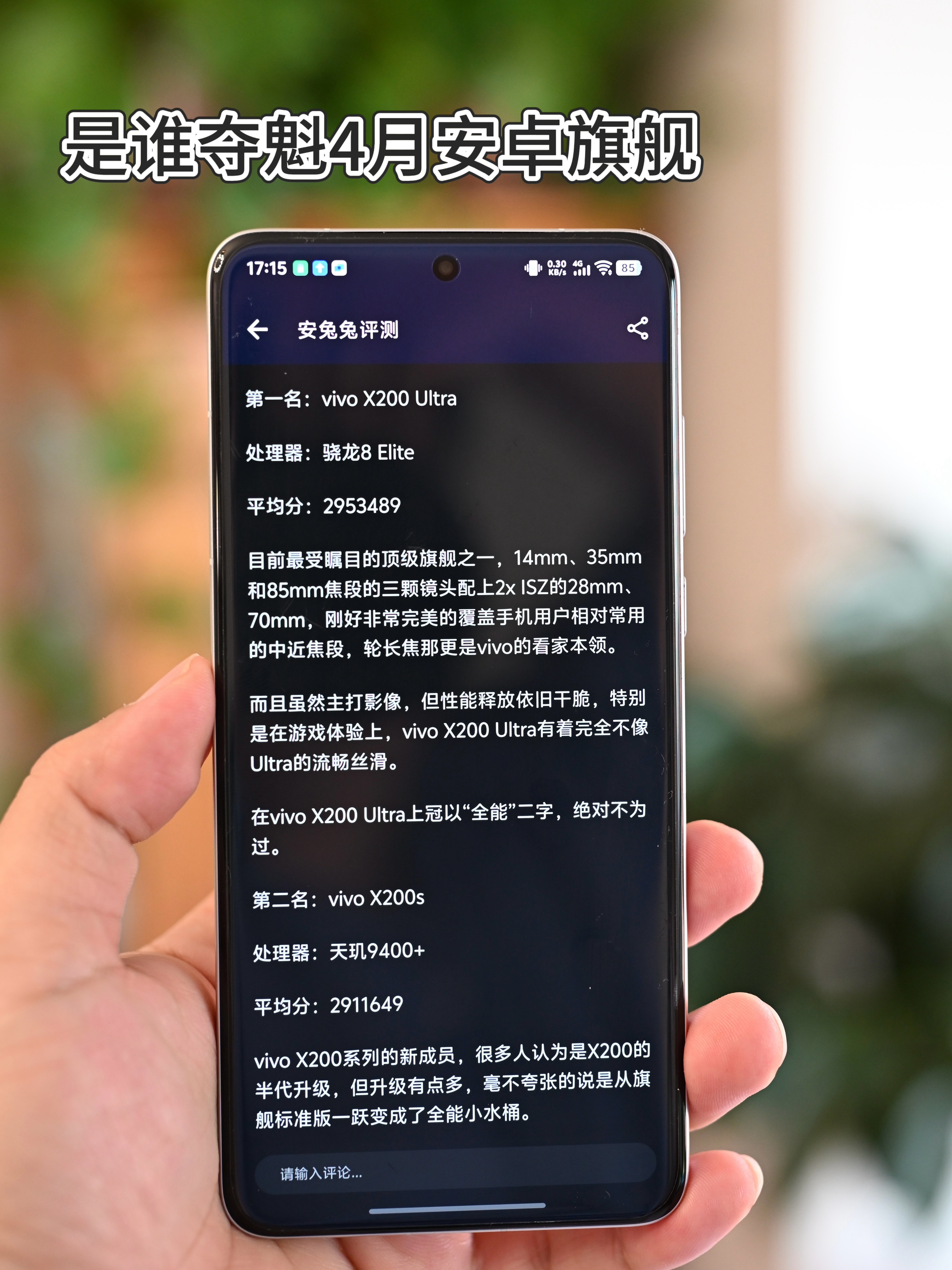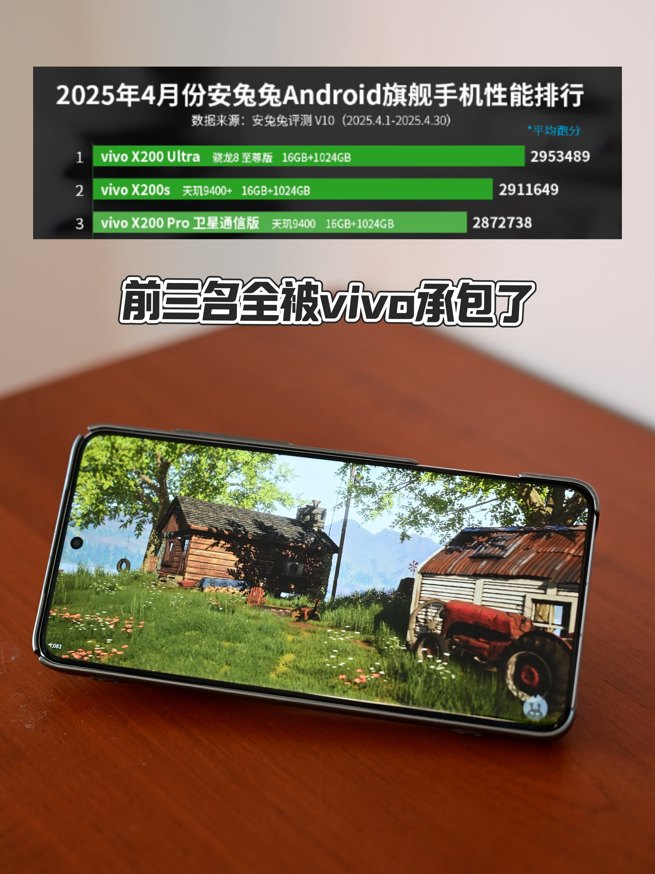 是谁一大早刷到了手里的vivo X200 Ultra 霸榜安兔兔4月安卓手机榜,已经用了一段时间,X200 Ultra给我的感觉就是影像,性能两不误,而且vivo很霸道的3款手机全部挤进了前三名,真的是强的不讲理!