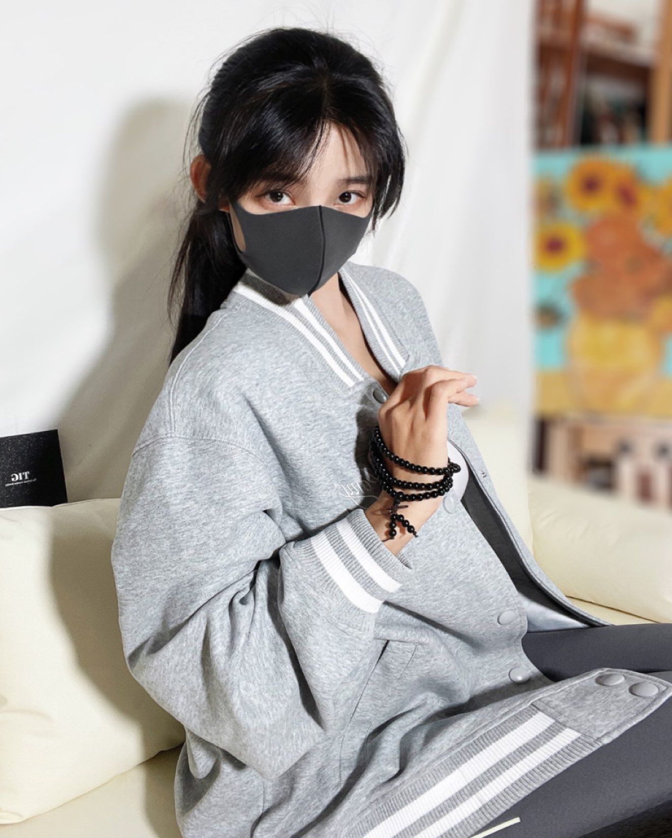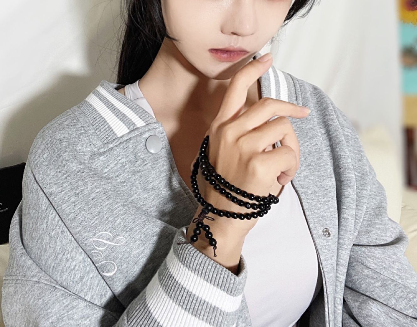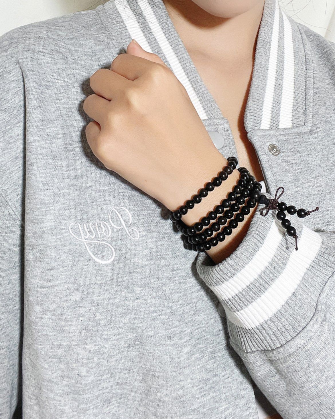 最近的天气不冷热的,又到了穿棒球服的季节啦~ 选了一件PONY灰色学院风外套👀带点美式复古的感觉,搭配我的灰色瑜伽裤就很好看~ 手腕上戴了TIG酷酷的黑檀木手串,108颗黑曜石我戴四圈刚刚好😎自带淡淡的木香真的好好闻! 搭配衣服有种新中式的清冷感好爱🥰 今天是酷飒姐姐风!