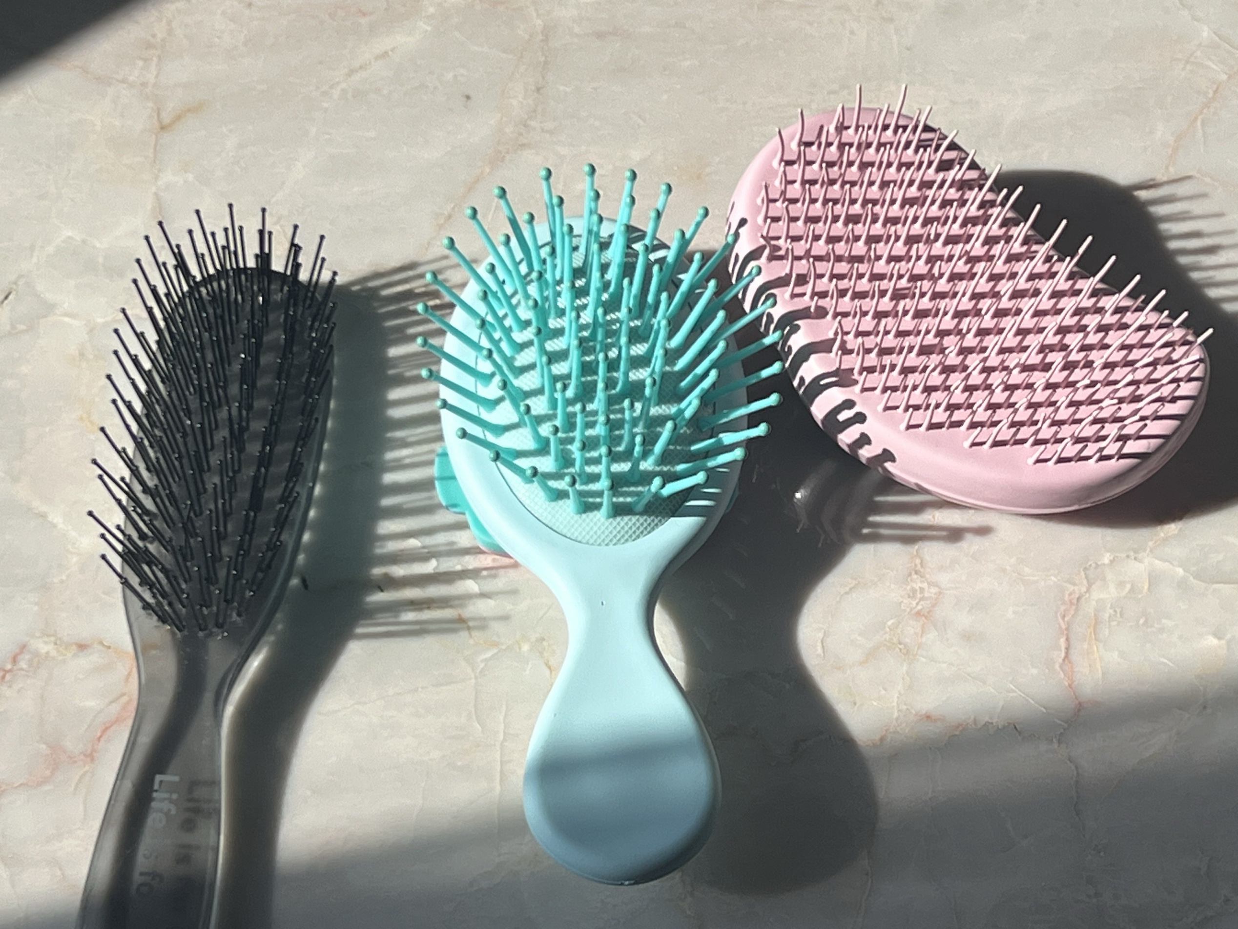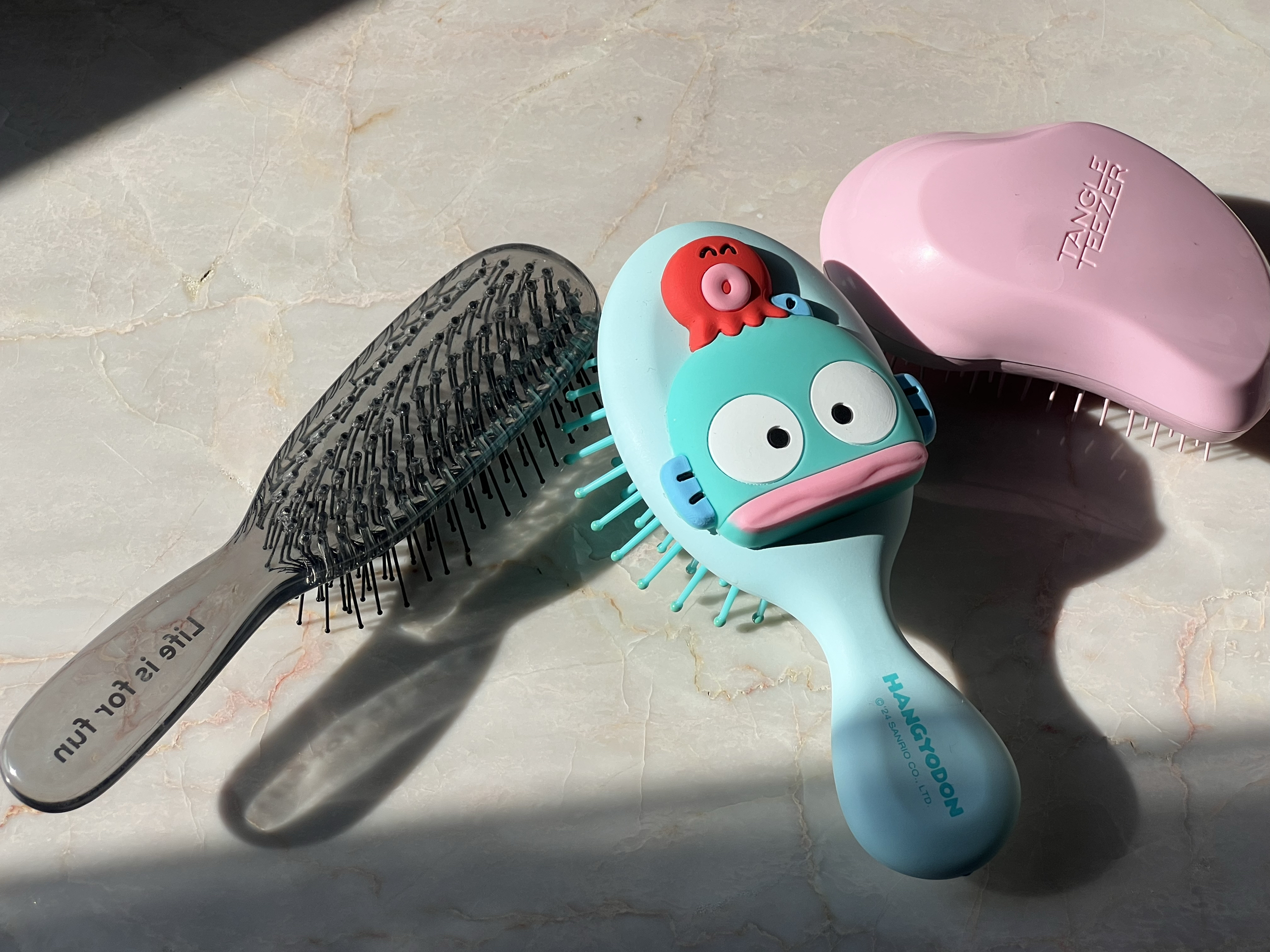 先唠唠左边透明那把 ,看着普普通通,梳头发还挺顺,齿比较密也比较长,长发妹子梳开打结的地方,多梳几下就好了,不过要是头发特别毛躁,扯的时候会有点小痛 。 中间这把小丑鱼造型的梳子是我近期的最爱!它的齿比较软,梳头皮还挺舒服,像给脑袋做按摩~ 右边粉色的Tangle Teezer ,之前风超大!确实有两把刷子,梳头发基本不打结,不管是刚洗完头湿着梳,还是干发整理,都很顺滑,就是这小巧的size ...