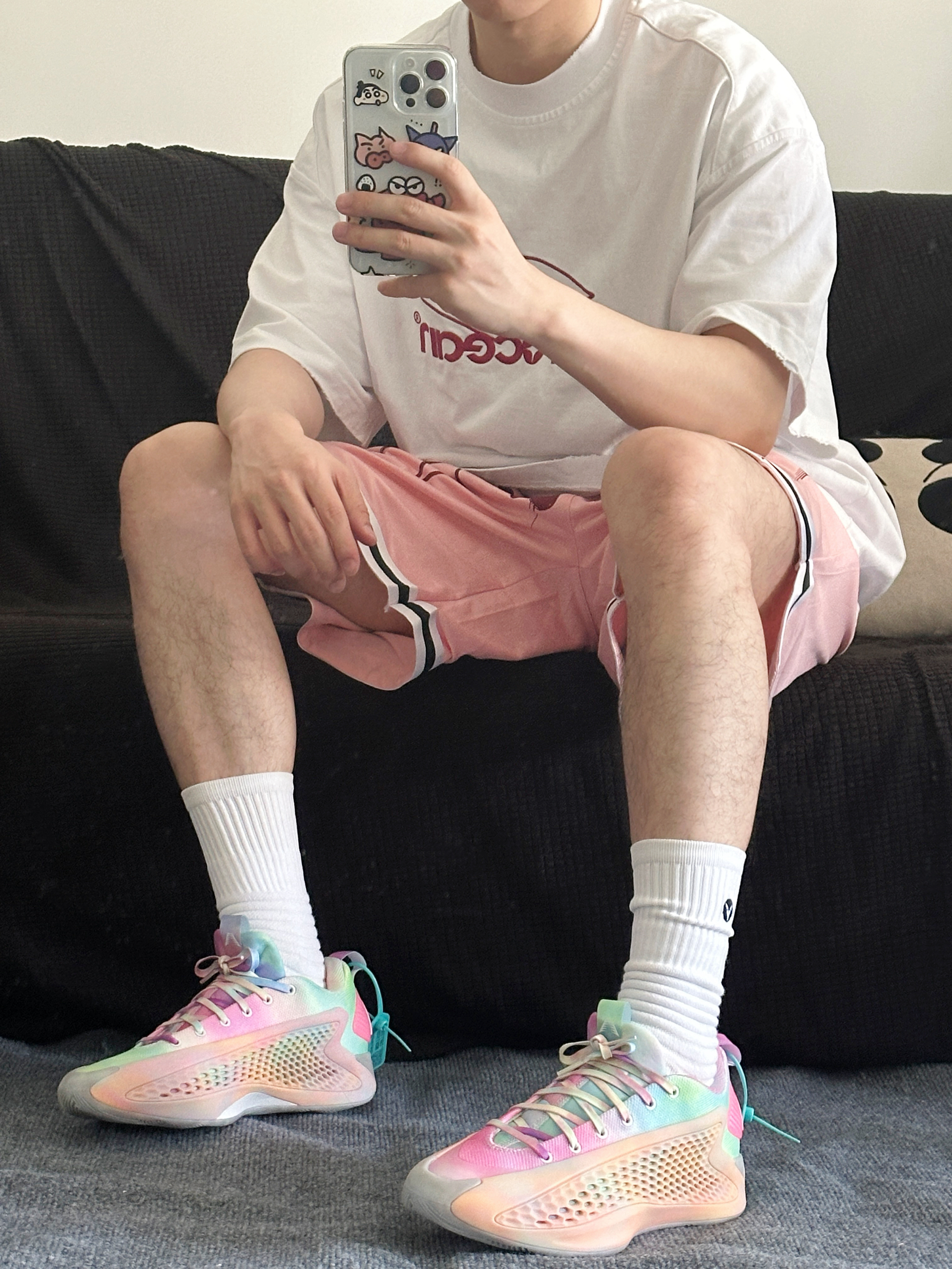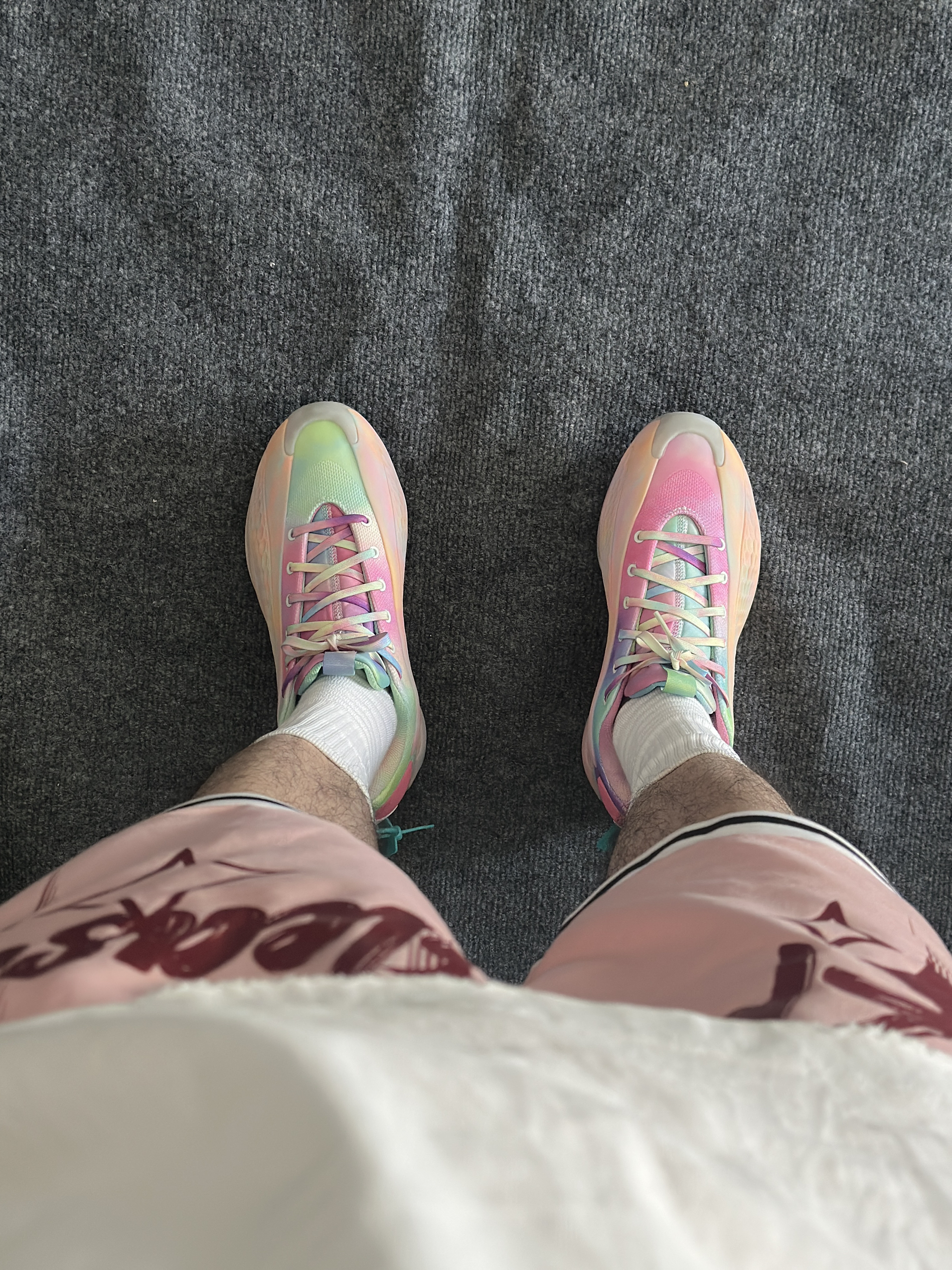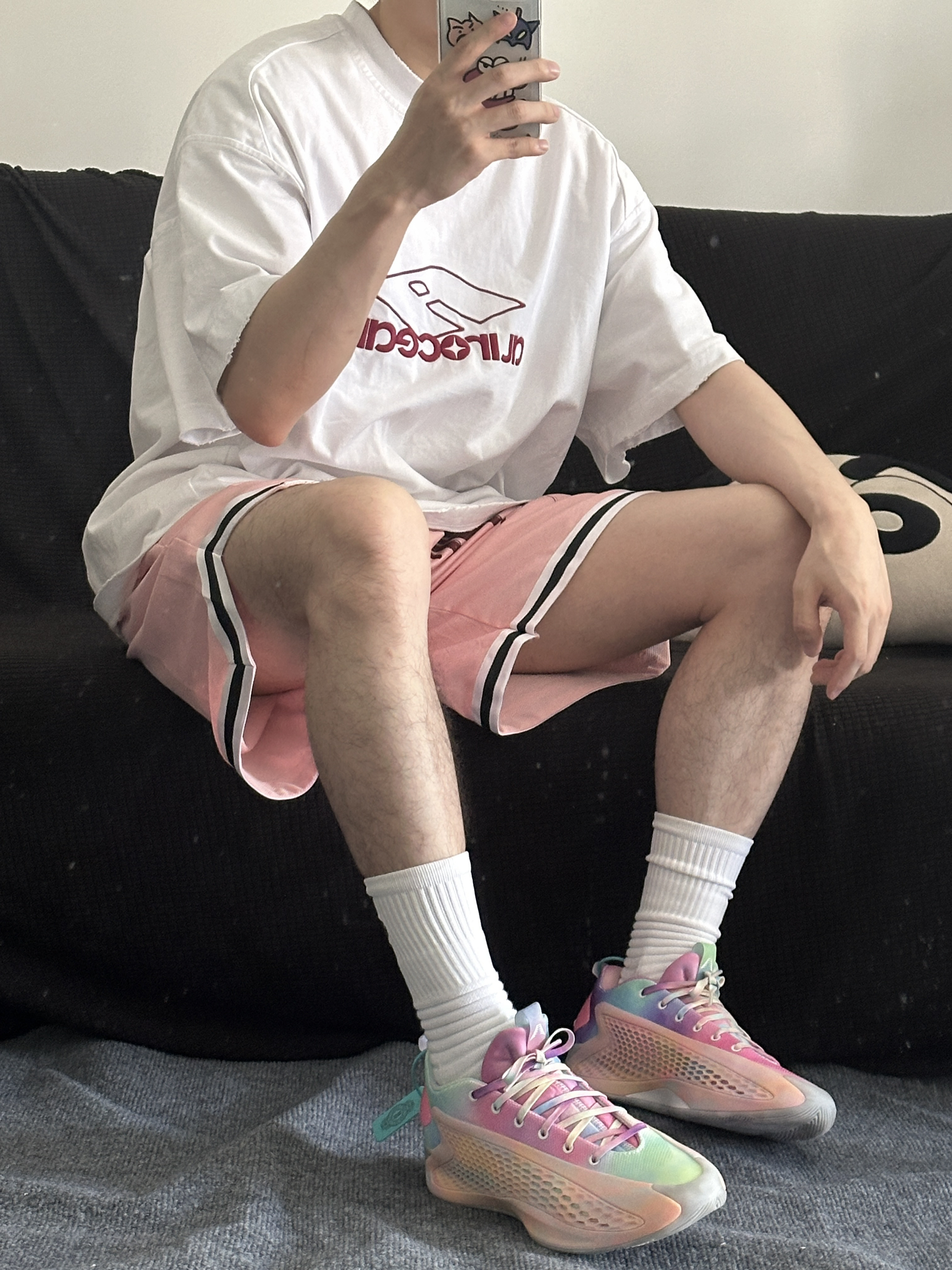 今天上脚分享华子一代 被这个配色种草了 粉色搭配彩色点缀 特适合夏天外场穿搭 低帮的设计上脚也很显瘦 上脚包裹性很强 中底的boost调教的刚好不会太软 唯一不足的是鞋带有点短 搭配上一条简单的白T恤 粉色球裤