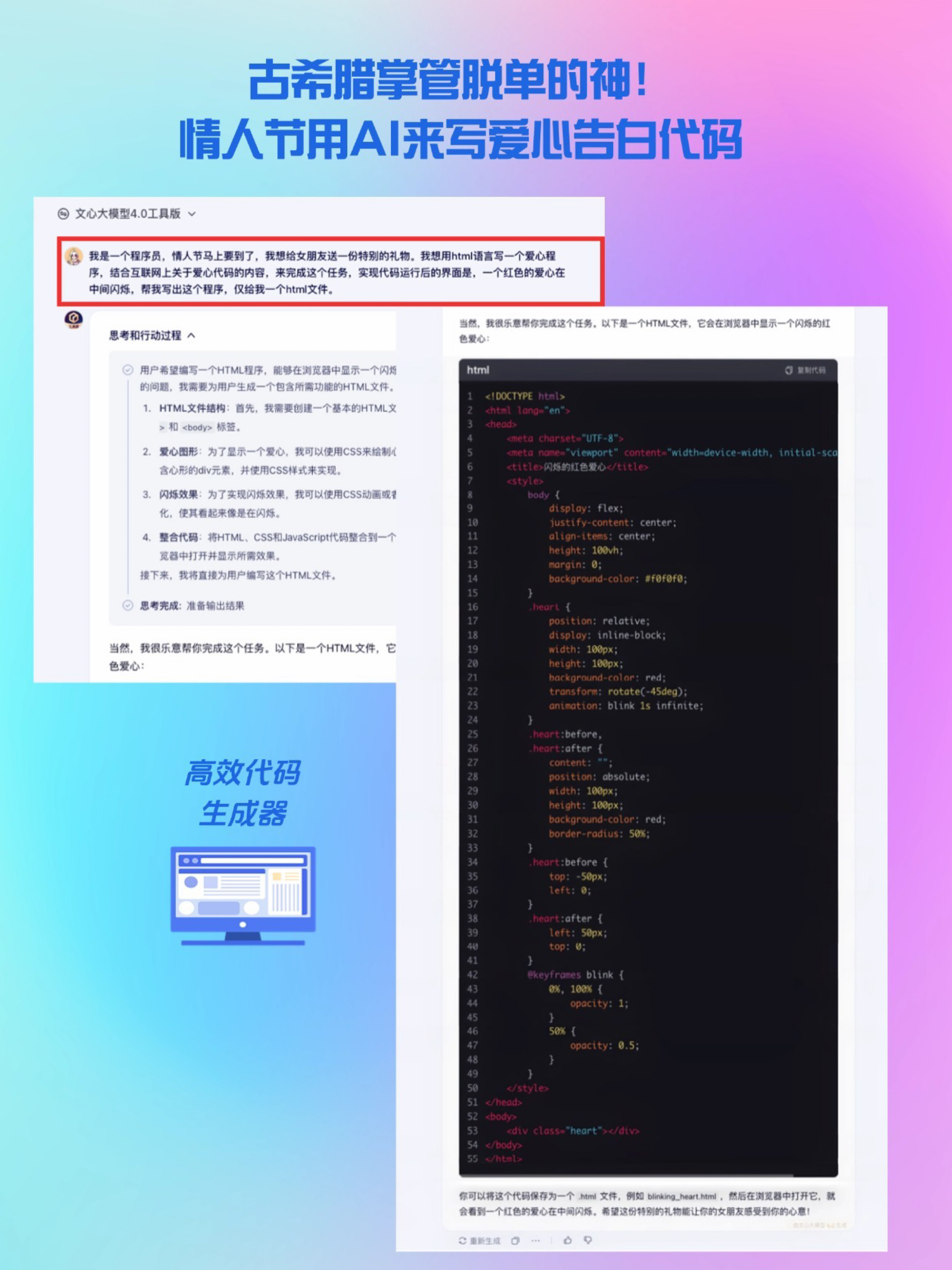 代码生成功能也很得我心。情人节的时候,有粉丝想给另一半准备个特别的礼物,让我帮忙写个爱心告白代码。我找文心一言,它用HTML语言迅速生成了一段代码,实现了红色爱心闪烁的效果,浪漫又有创意。