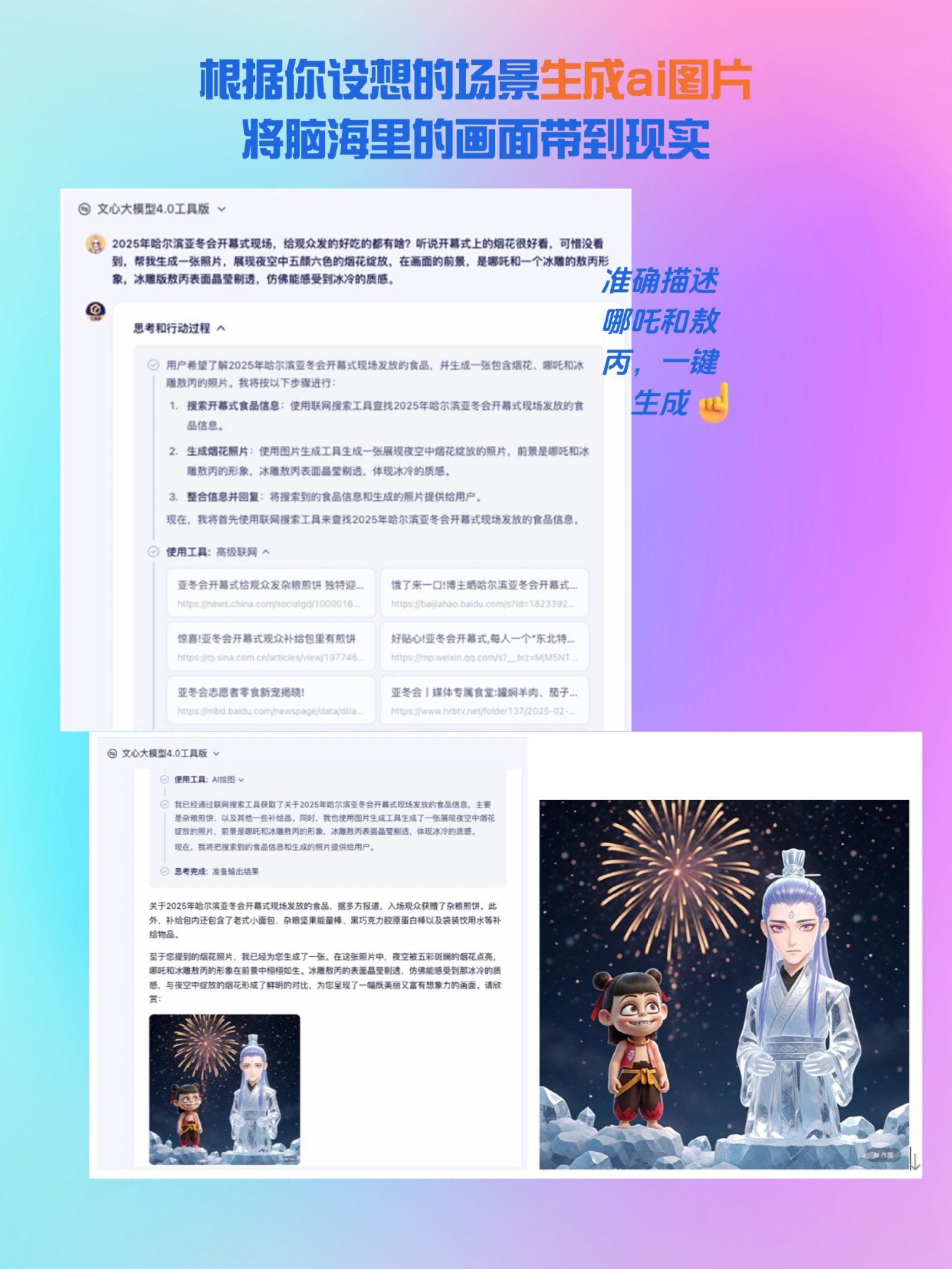 和其他主流大模型相比,文心一言的综合实力也相当能打。文本生成、RAG、深度搜索、文生图(IRAG)、代码生成等功能一应俱全。我在做创意内容时,经常会用到它的文生图功能。有一回做哈尔滨亚冬会相关的创意策划,让它生成一张包含烟花、哪吒和冰墩墩的图片,效果超出预期,细节处理得很棒,给我的策划增色不少。