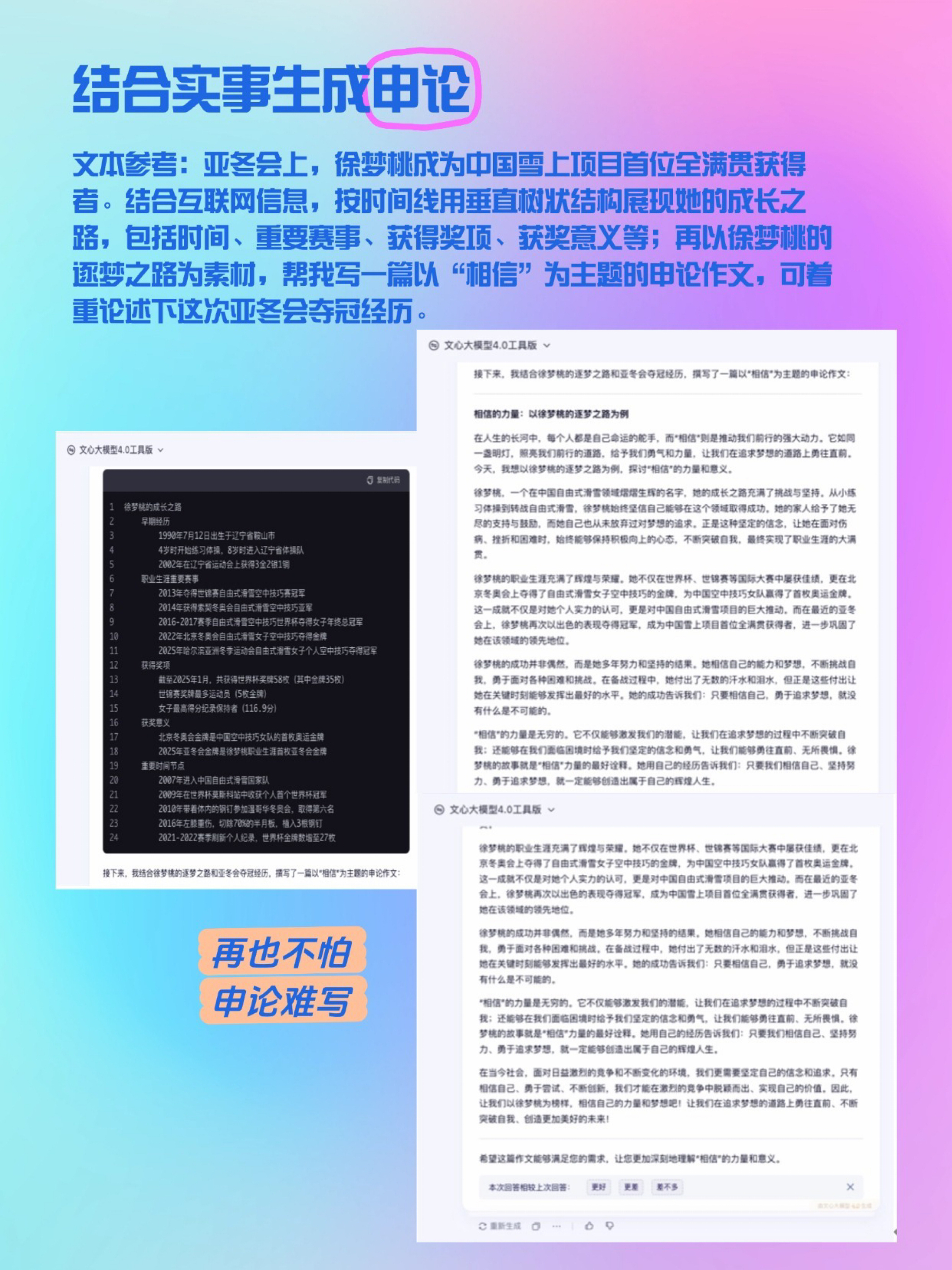 对于有文字创作需求的朋友,文心一言的申论写作功能也堪称“小能手”。结合实事,比如亚冬会徐梦桃夺冠的事迹,它不仅能按时间线梳理出徐梦桃的成长历程,还能围绕“相信”这类主题写出逻辑清晰、论据丰富的作文,对于提升文字功底很有帮助。