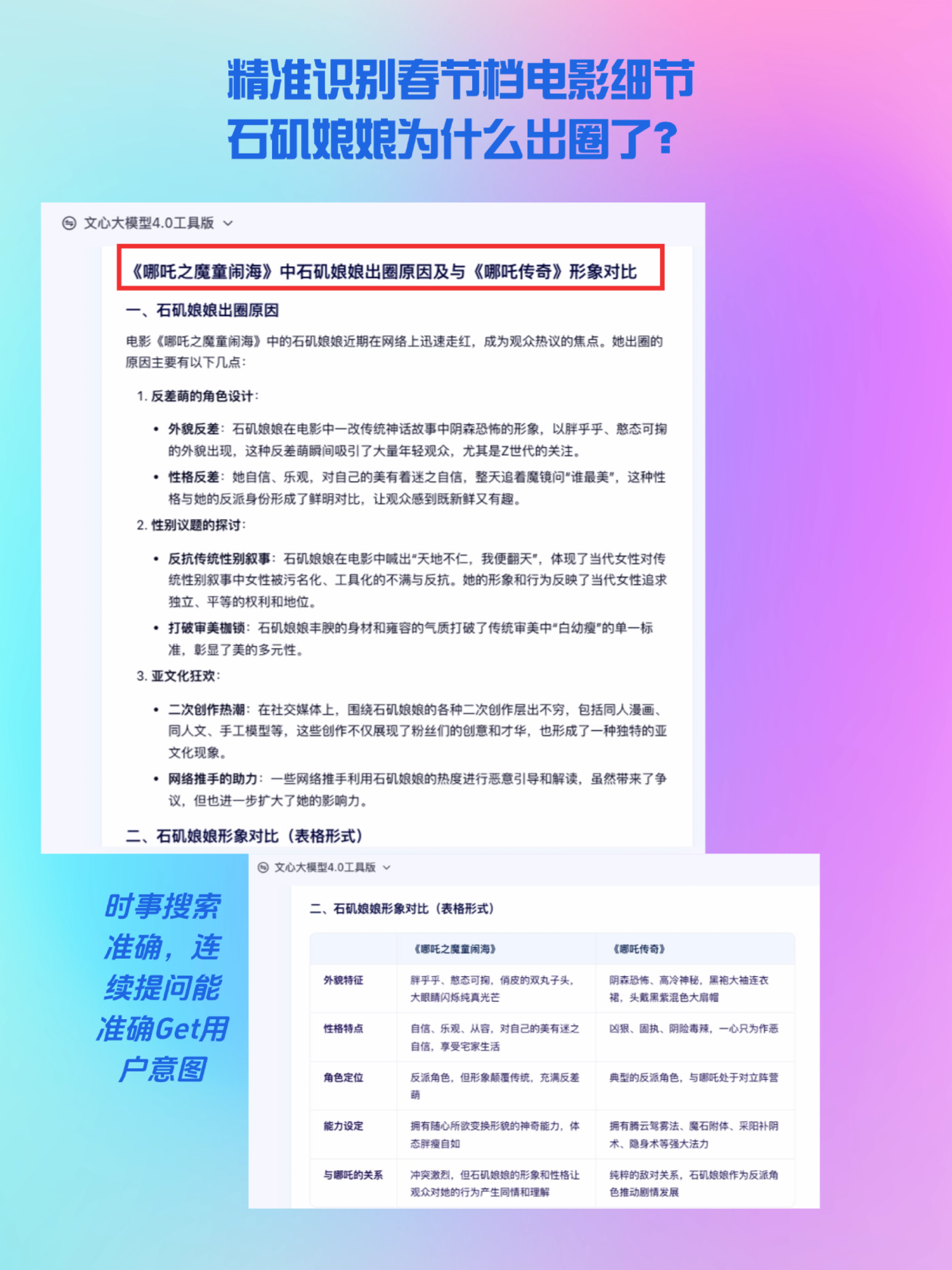 还有电影细节分析功能,分析《哪吒之魔童闹海》里石矶娘娘出圈的原因时,从角色的反差萌设计、性别议题探讨到亚文化狂欢等方面,都剖析得十分透彻,为影评创作提供了很多新颖的角度。