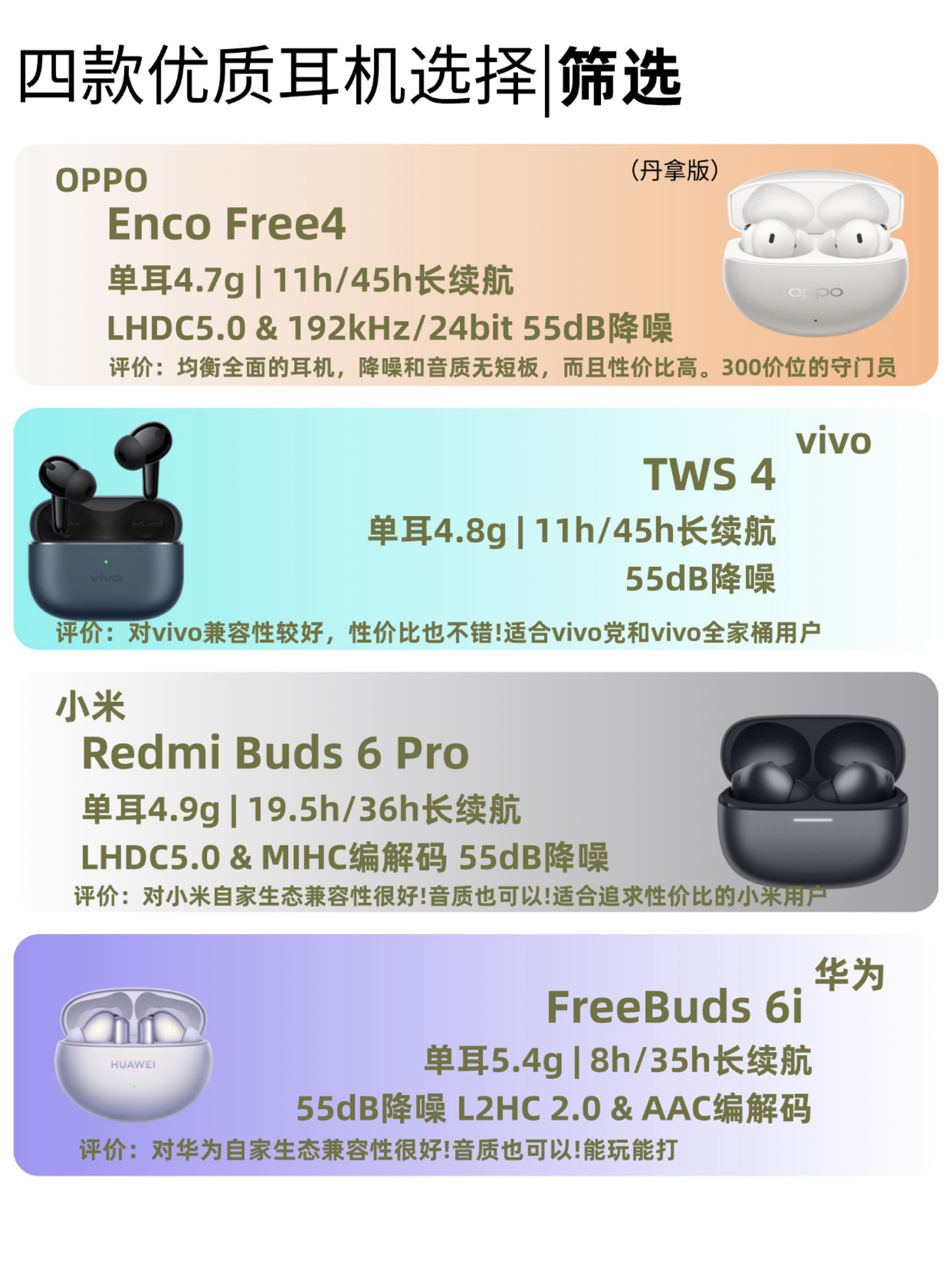 预算300 - 500元想买耳机的宝子看过来👇 整理4款热门机型,帮你按需选择,轻松拿捏心仪好物💪 1. OPPO Enco Free4(丹拿版) 🔍单耳4.7g | 续航11h/45h | LHDC5.0编码 OPPO Enco Free4(丹拿版)堪称全能选手!搭载11mm+6mm一体化同轴双单元,配合丹拿专业调音,三频均衡,人声细腻,无论是流行乐还是古典乐都能出色还原。55dB深度降噪+智能...
