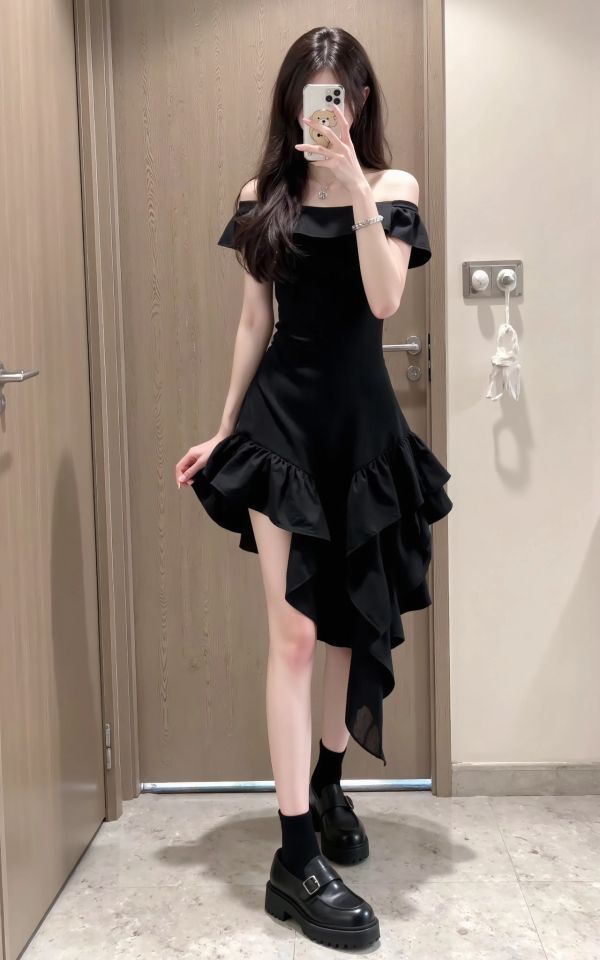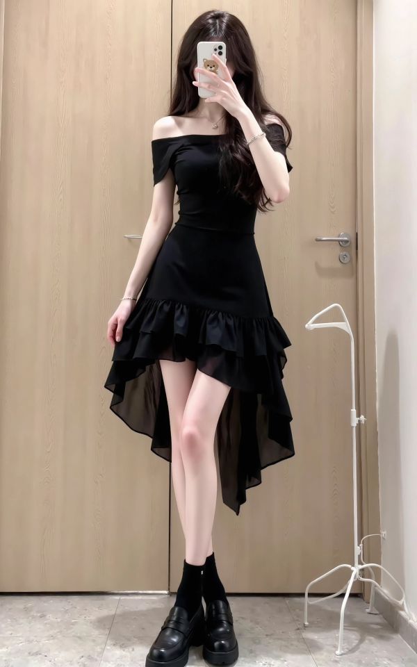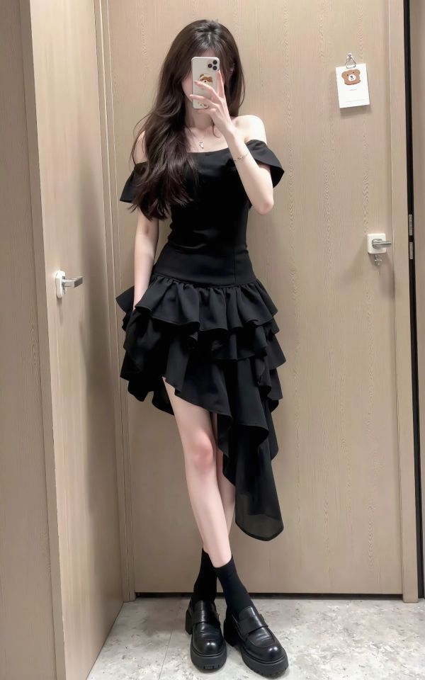 姐妹们!这条小黑裙真的太懂我的心了!🖤 露肩设计简直是锁骨杀,层层叠叠的裙摆,灵动又飘逸~搭配黑色袜子和厚底鞋,甜酷女孩就是我!💃 随便一拍都超出片,回头率💯!这条裙子必须拥有!💖 #小黑裙 #ootd #穿搭分享 #甜酷风 #夏季穿搭 #显瘦穿搭 #今日穿搭 #时尚穿搭