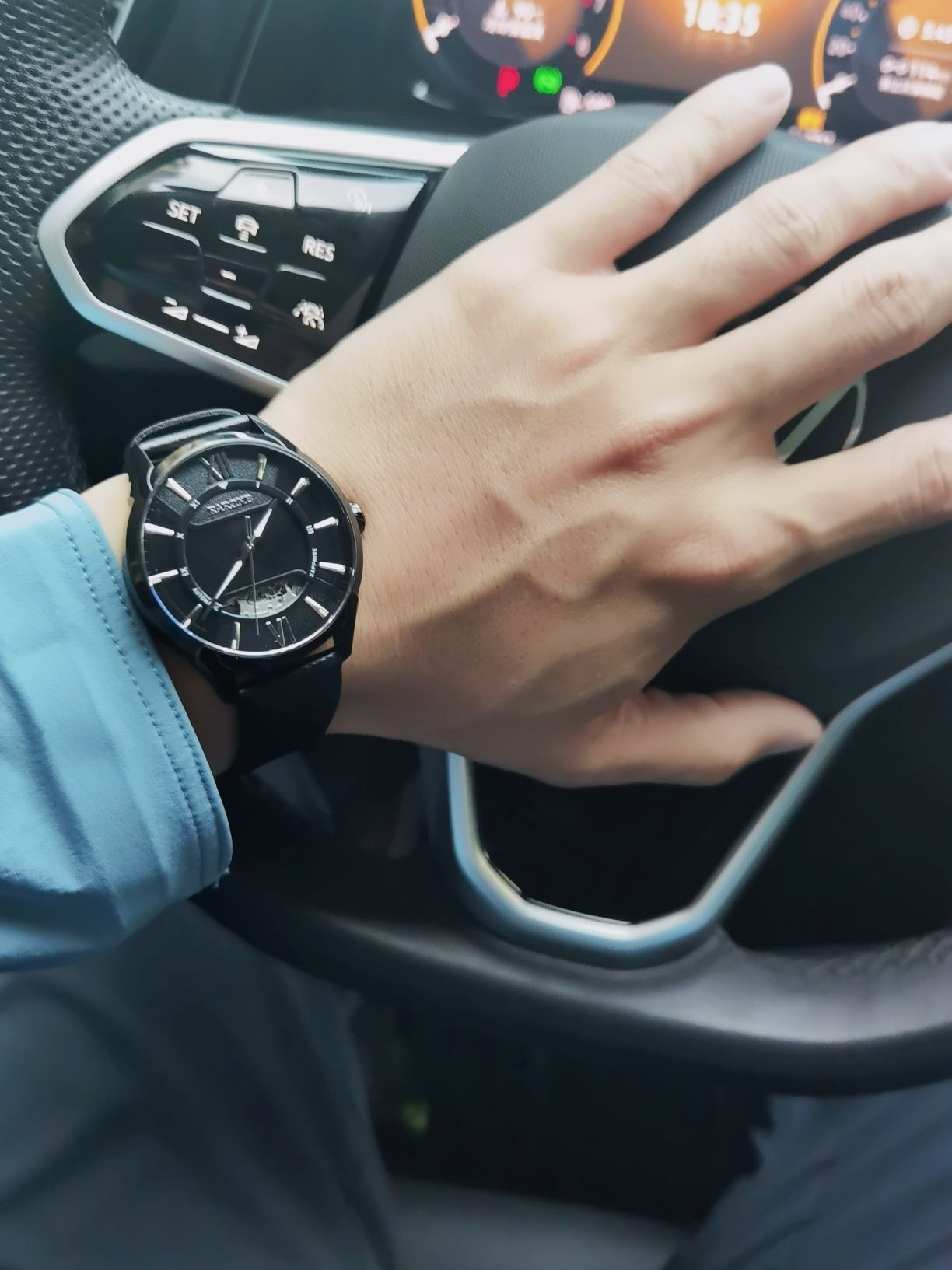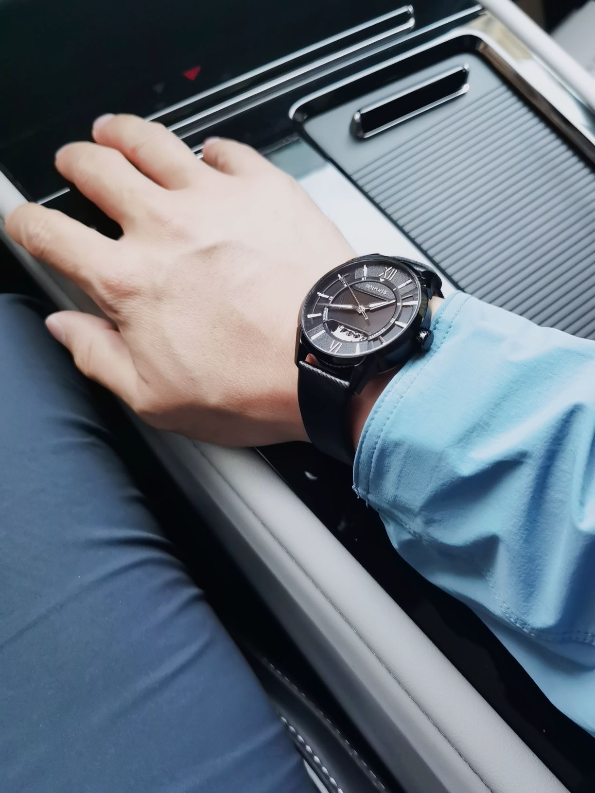 炎炎夏日配上这颜色就清爽了好多 这个颜色也是超显脸白的 整个人看上去就很阳光有活力 手上这块黑武士手表很搭配这件衣服 黑色镂空表盘有个性很有高级感 机械机芯走时精准误差小 皮质表带上手舒适性高 今天这身搭配宝子们喜欢嘛