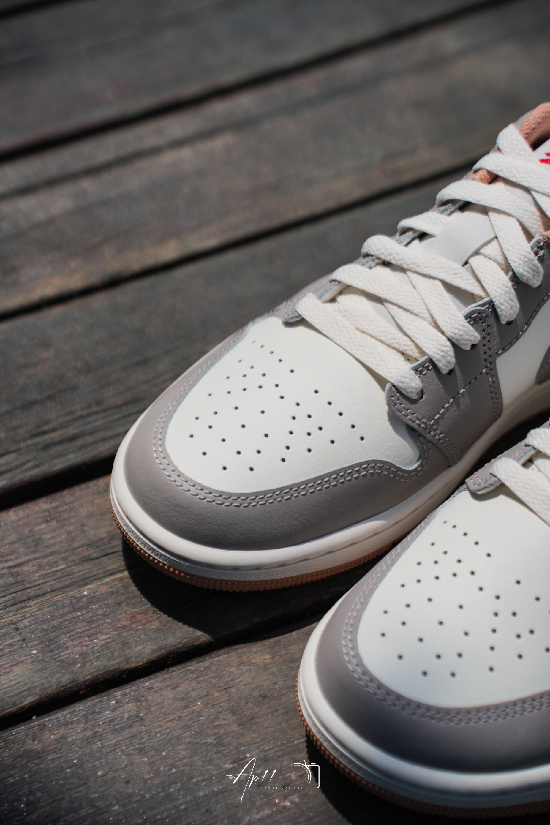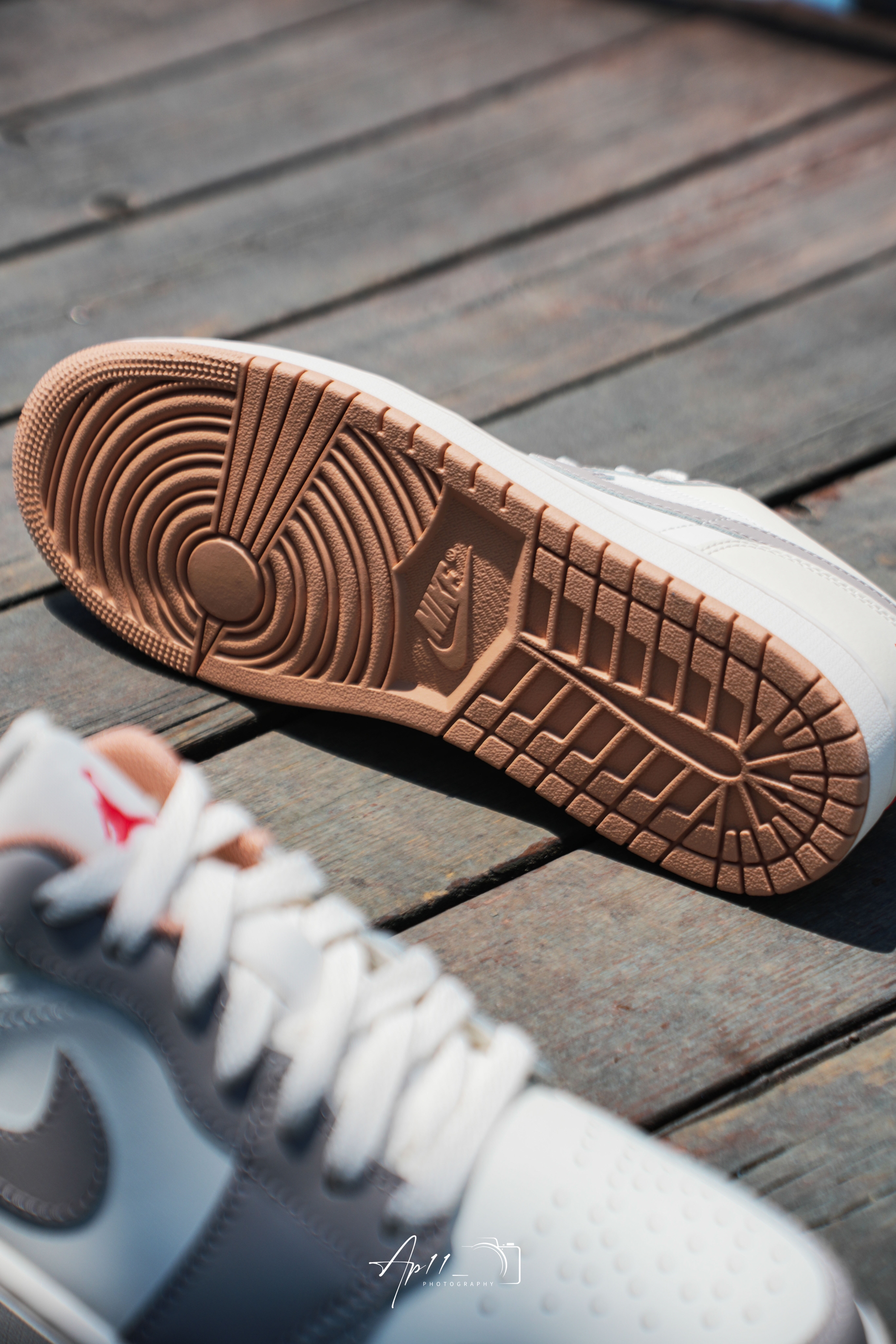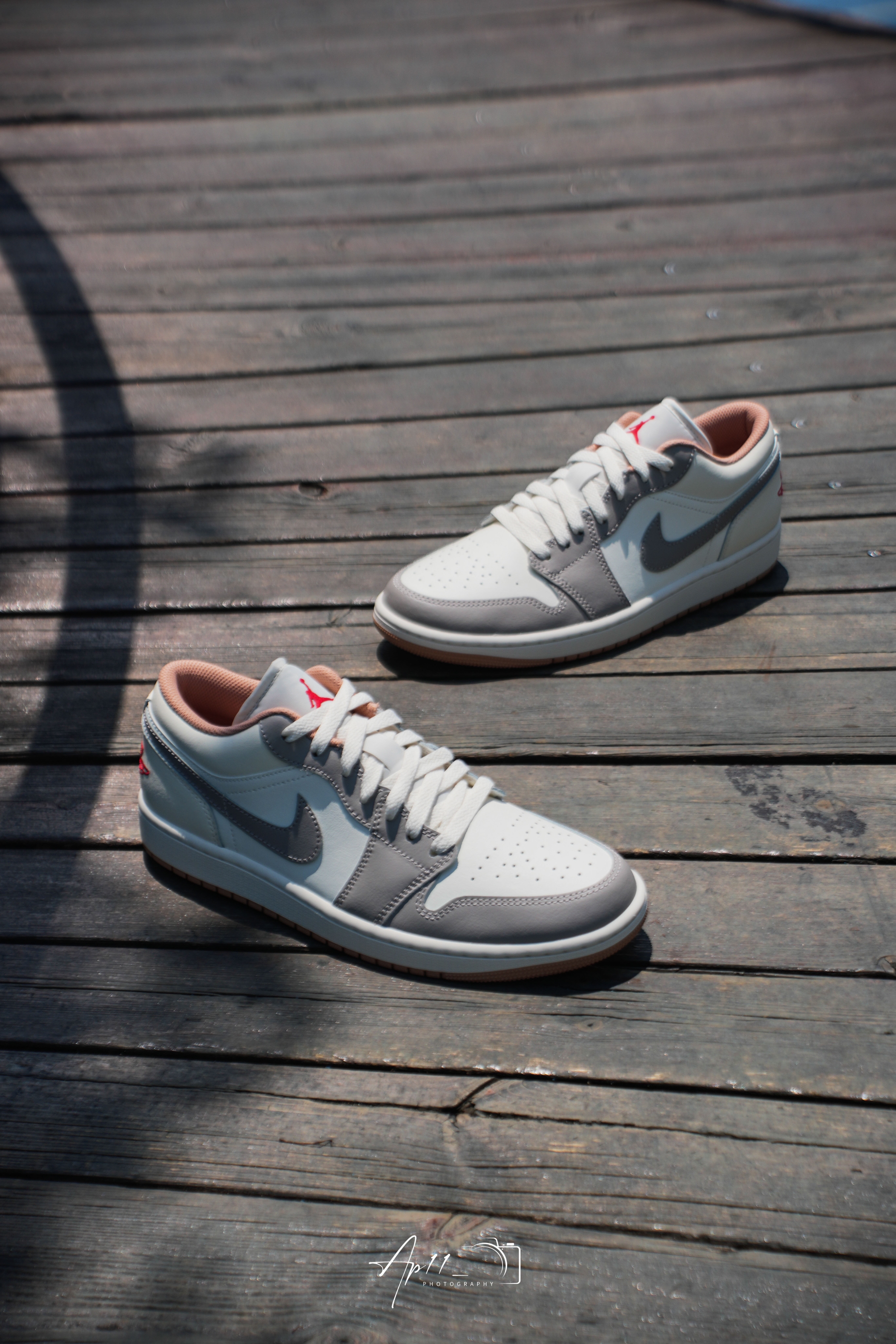 低帮的aj1鞋型果然还是深得我心,对短裤,或是休闲长裤的搭配来说都很百搭,米白跟灰色的搭配也蛮有高级感,橘色的内衬搭配也是点睛之笔。个人感觉日常的街头穿搭或是休闲搭配都很不错。