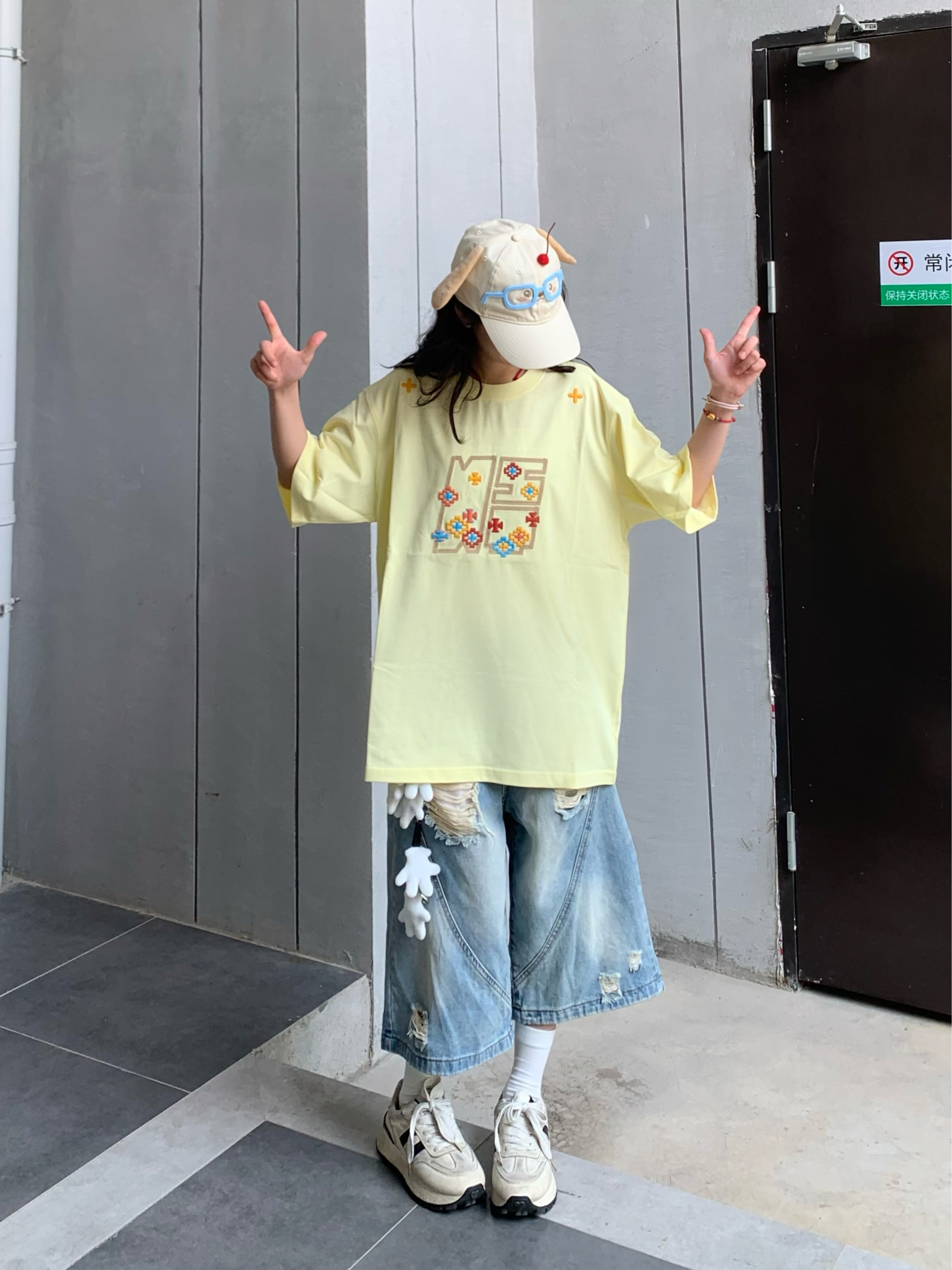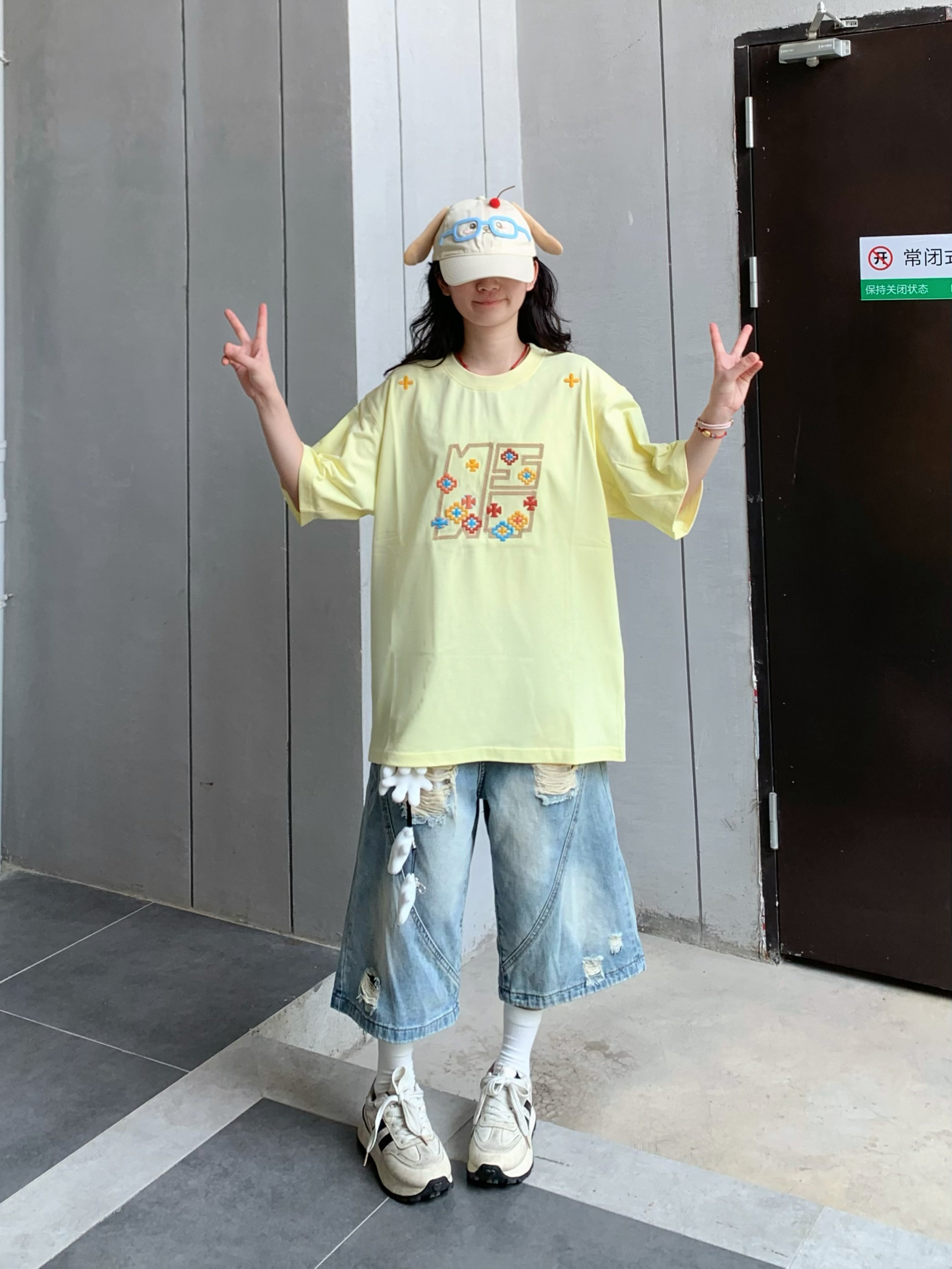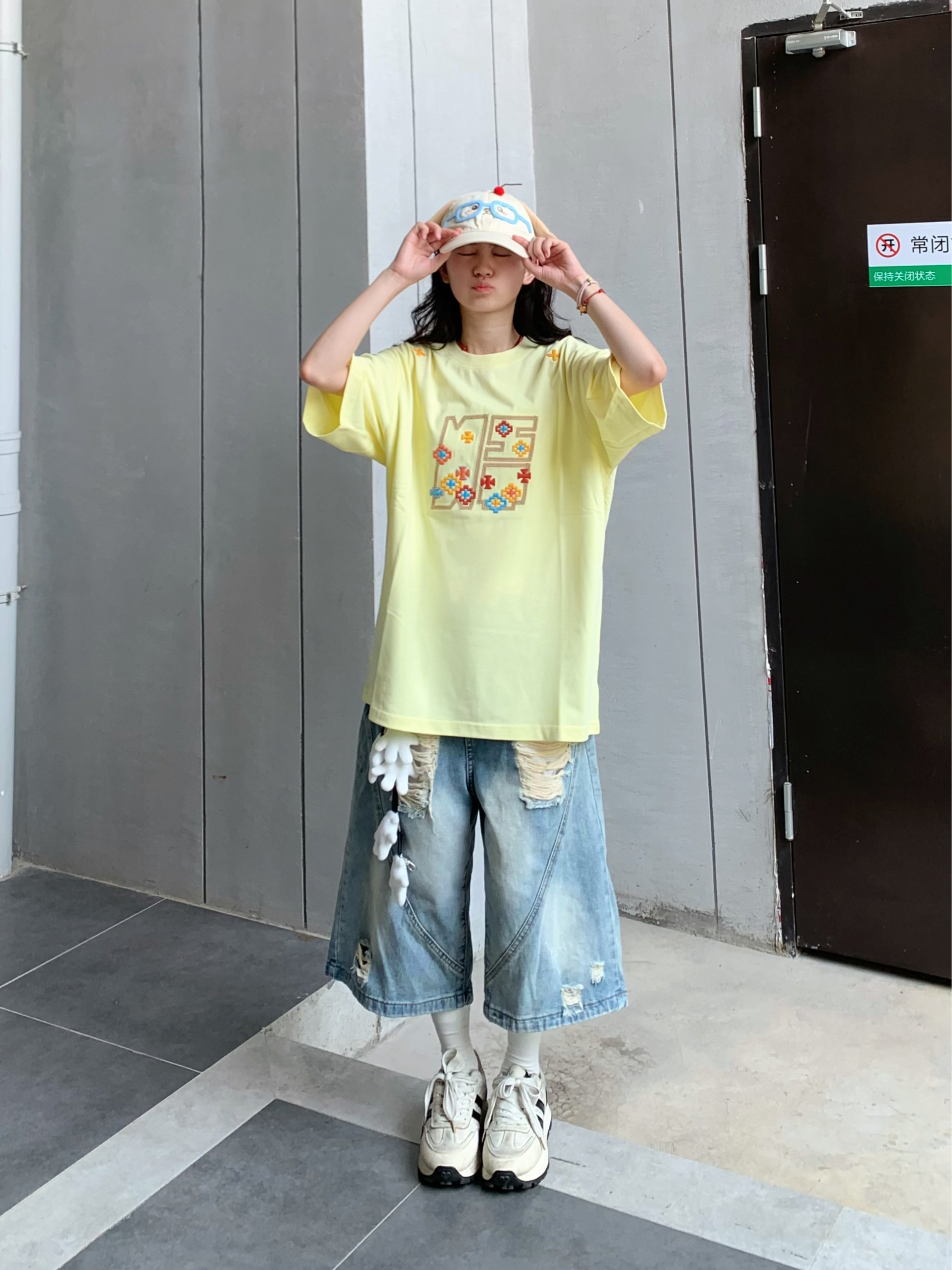今天穿超爱的奶油黄T恤!彩色刺绣图案超吸睛,宽松版型藏肉又舒适~搭配破洞牛仔七分裤,挂点小玩偶超可爱,再戴顶小狗帽,奶fufu的活力感拉满!这套日常又出片,逛街拍照都很绝,黄皮穿显白到发光✨不错不错版型也好看