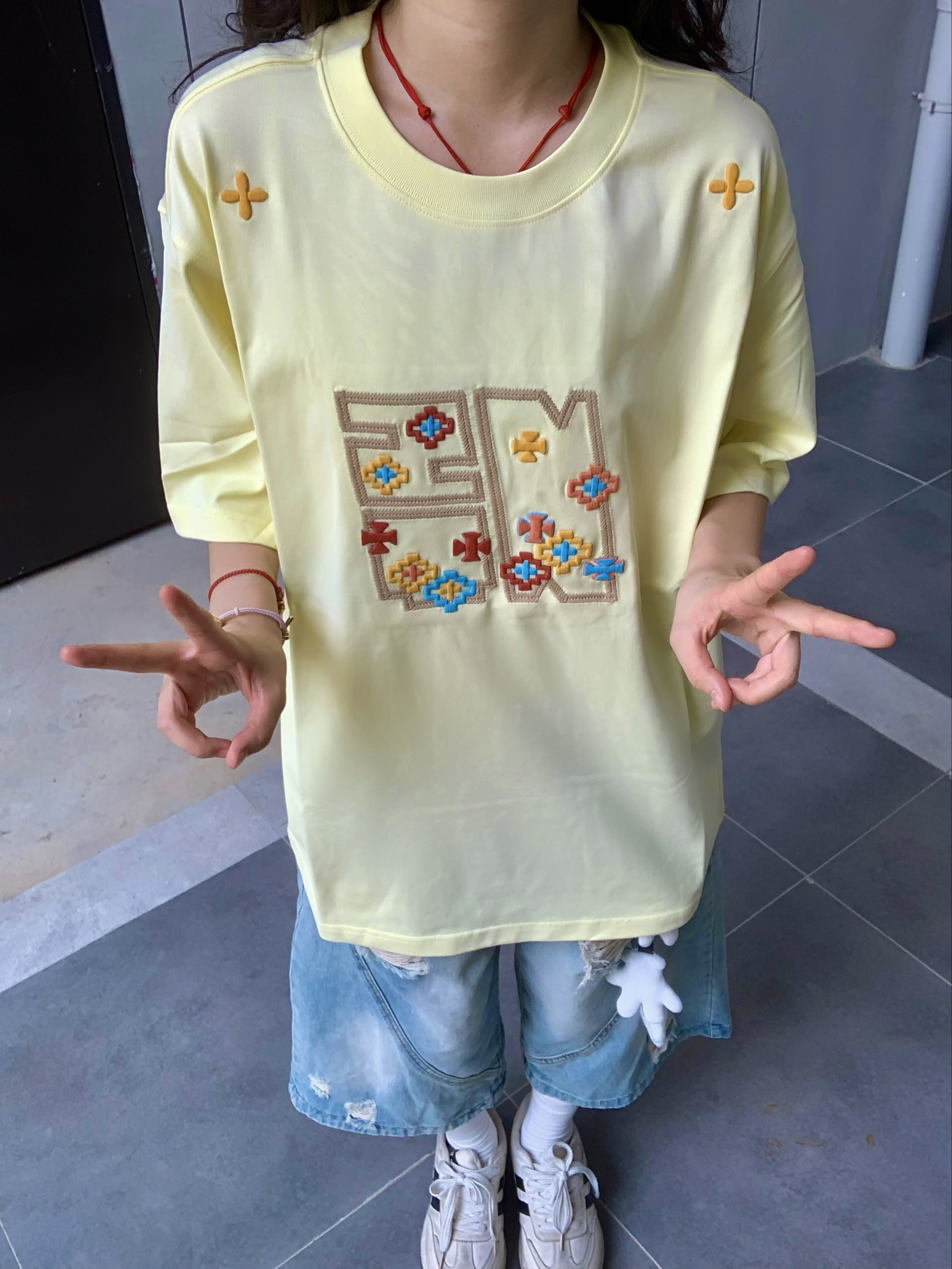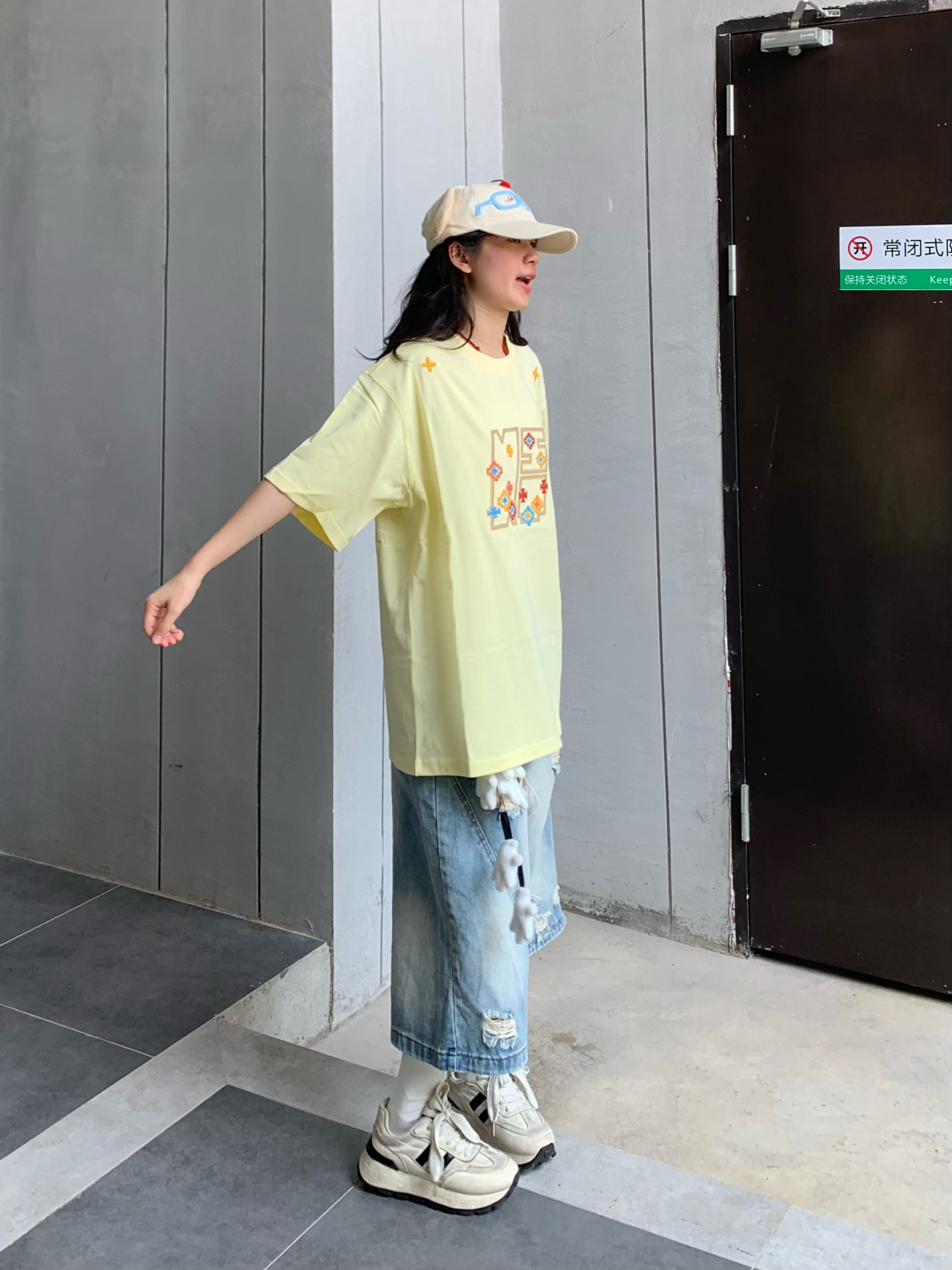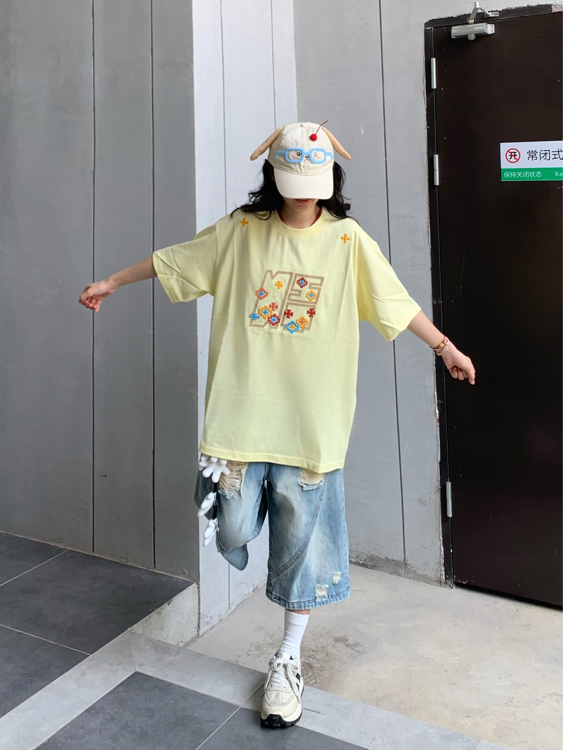 今天穿超爱的奶油黄T恤!彩色刺绣图案超吸睛,宽松版型藏肉又舒适~搭配破洞牛仔七分裤,挂点小玩偶超可爱,再戴顶小狗帽,奶fufu的活力感拉满!这套日常又出片,逛街拍照都很绝,黄皮穿显白到发光✨不错不错版型也好看