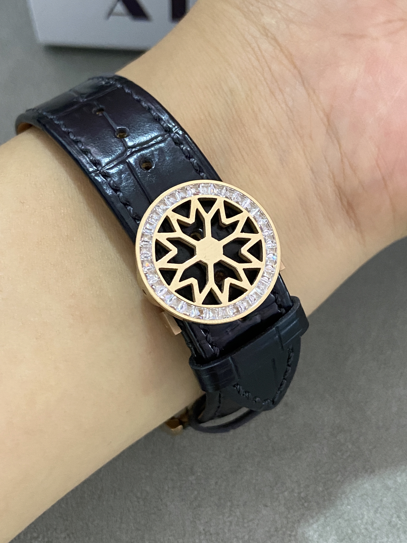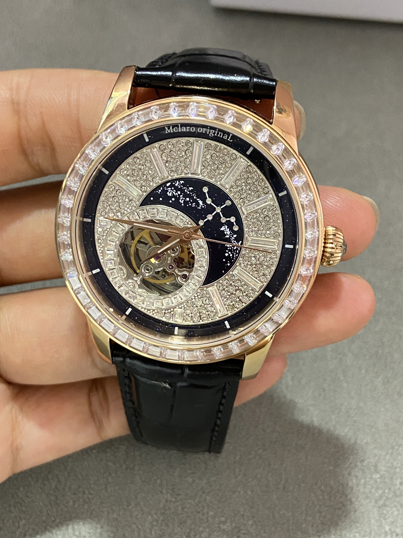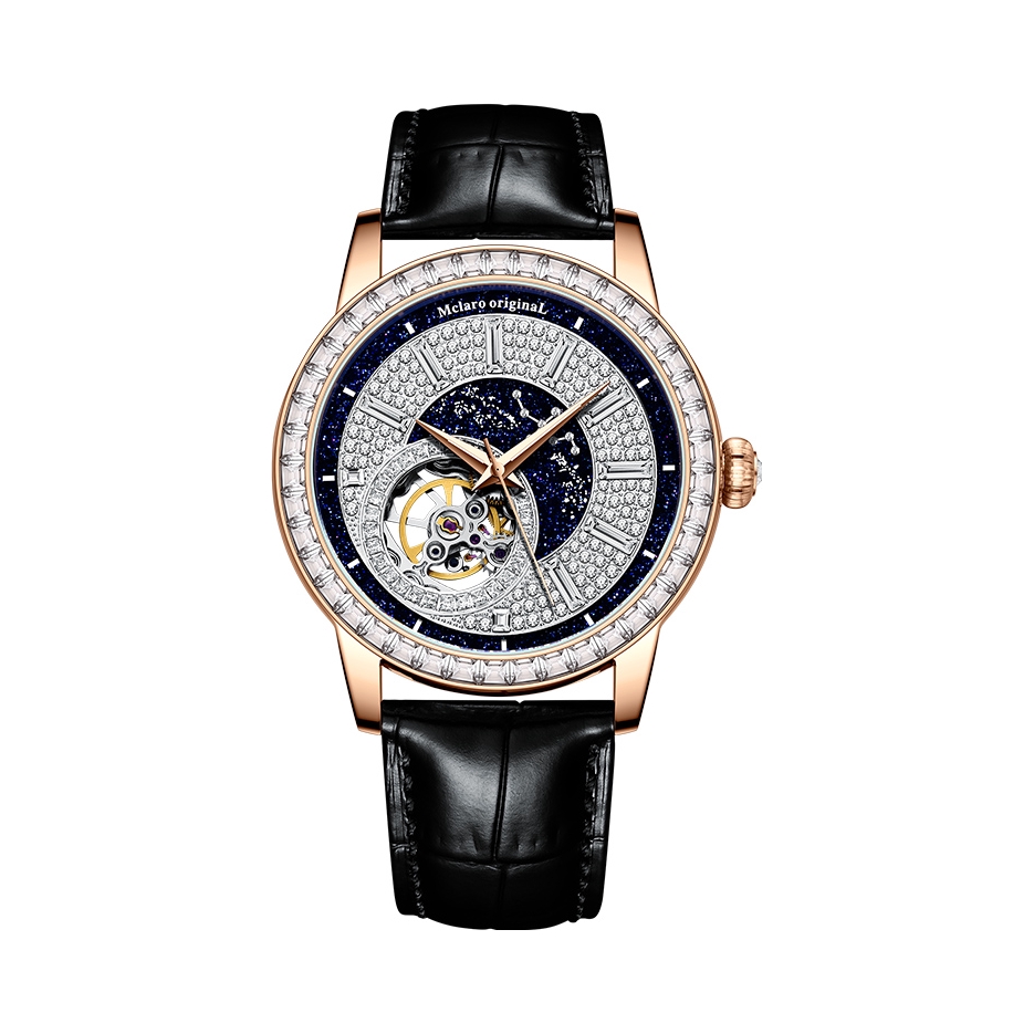这款表设计简约大气 表带材质是真皮制作 表盘正面是满钻装饰 搭配星空宇宙图案 背面是镂空机械 夏天戴出去气质感满满