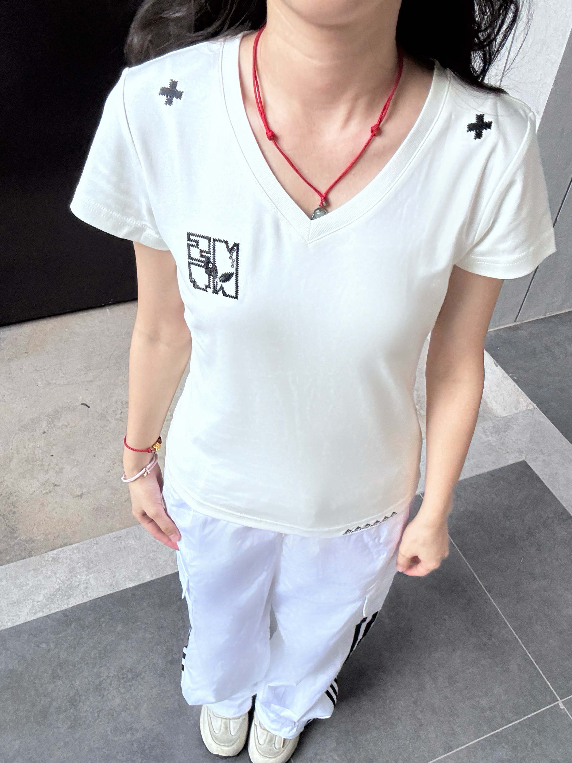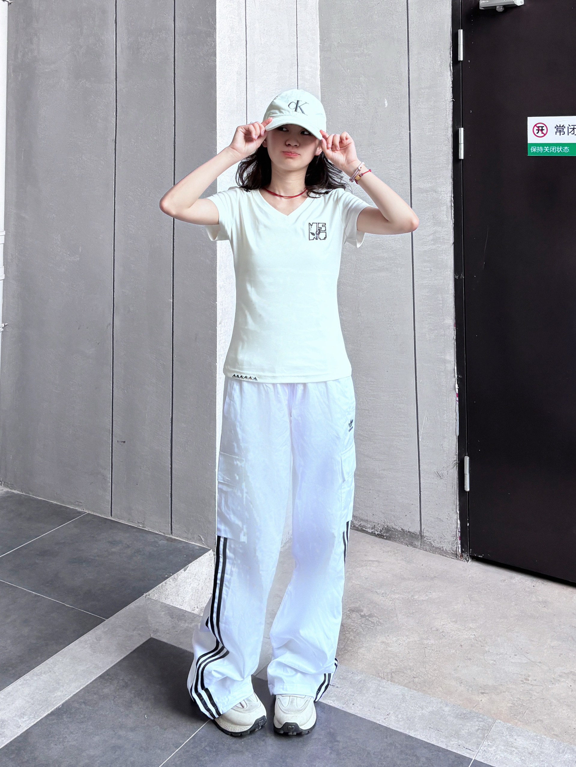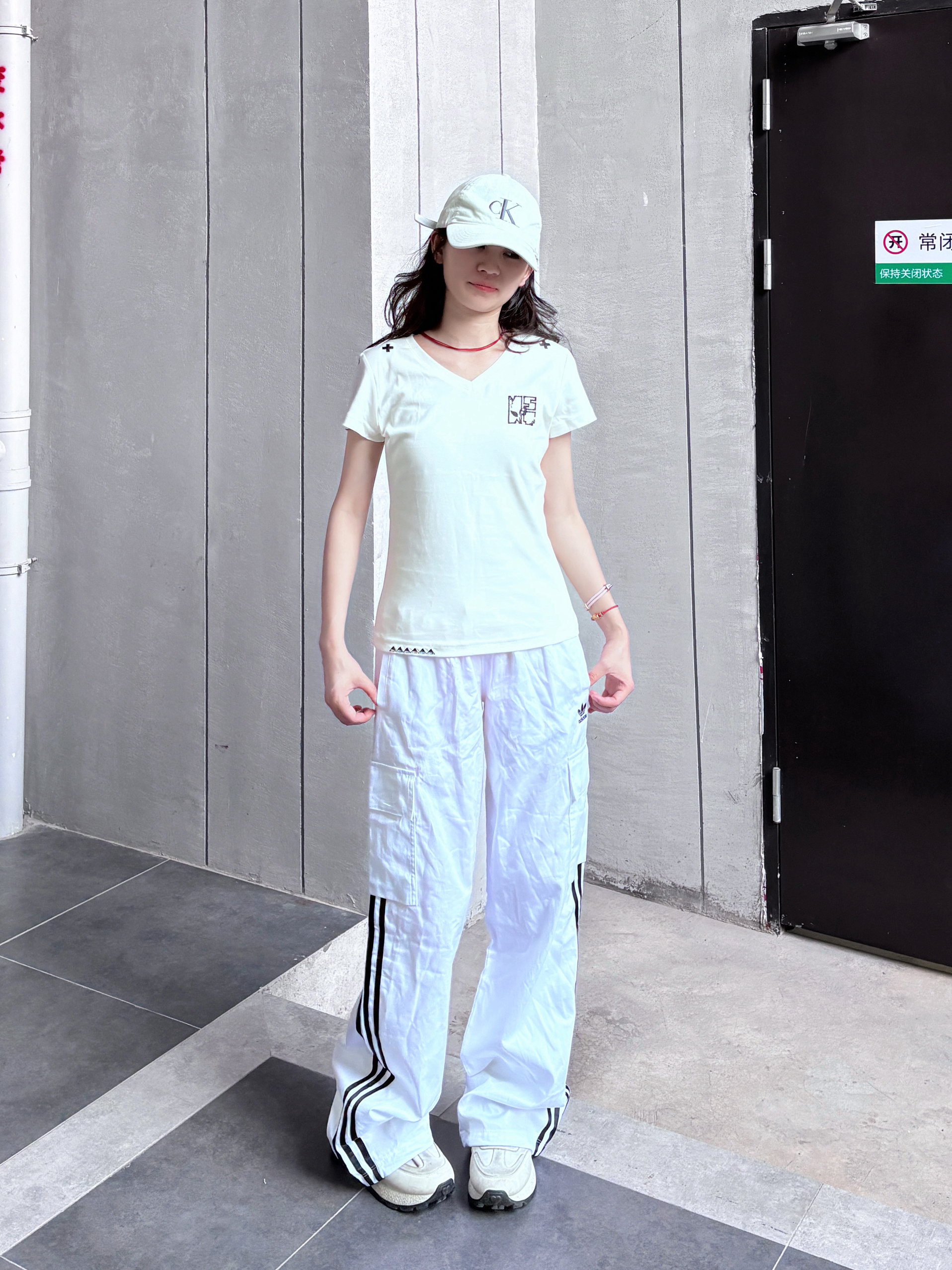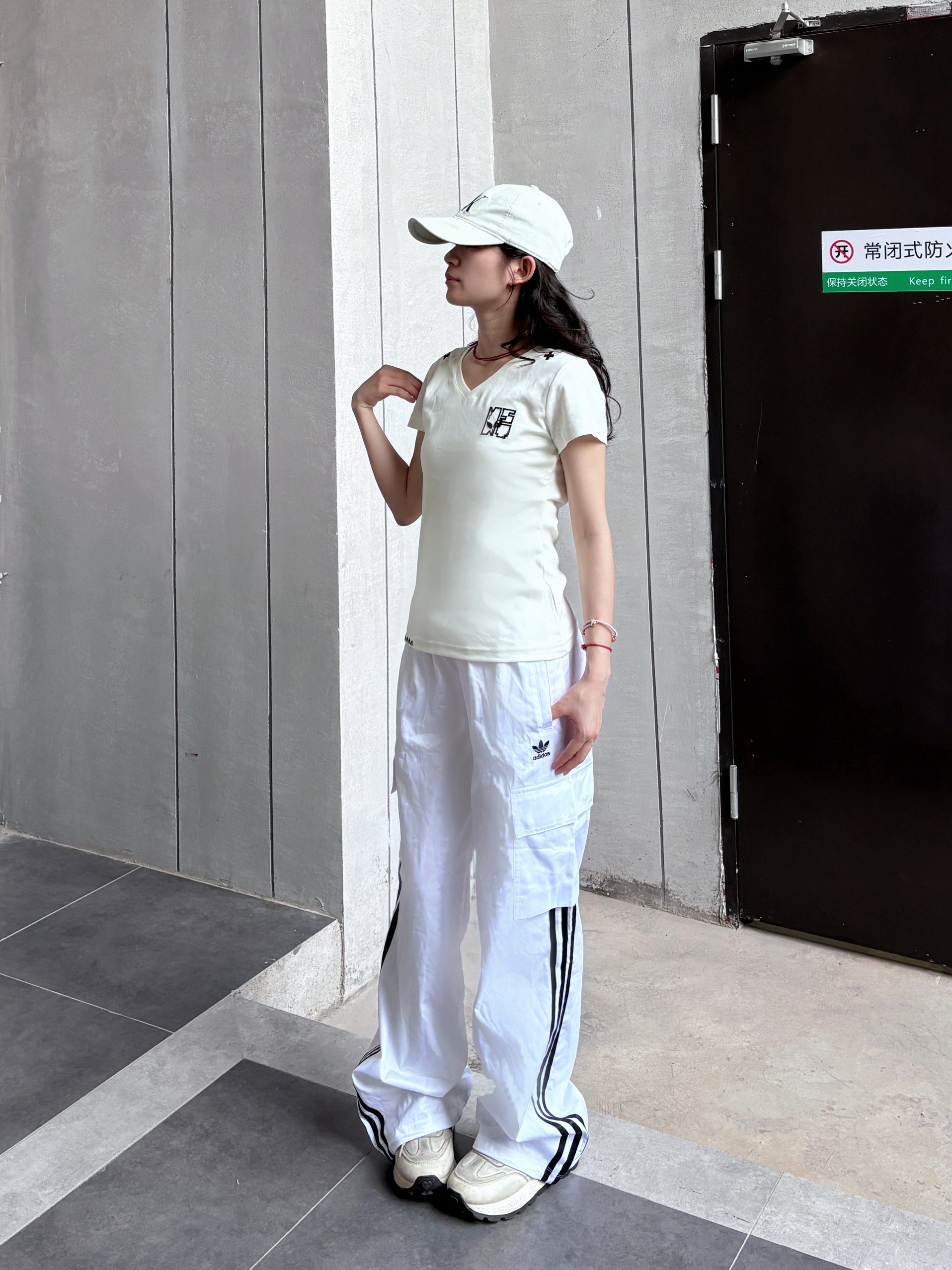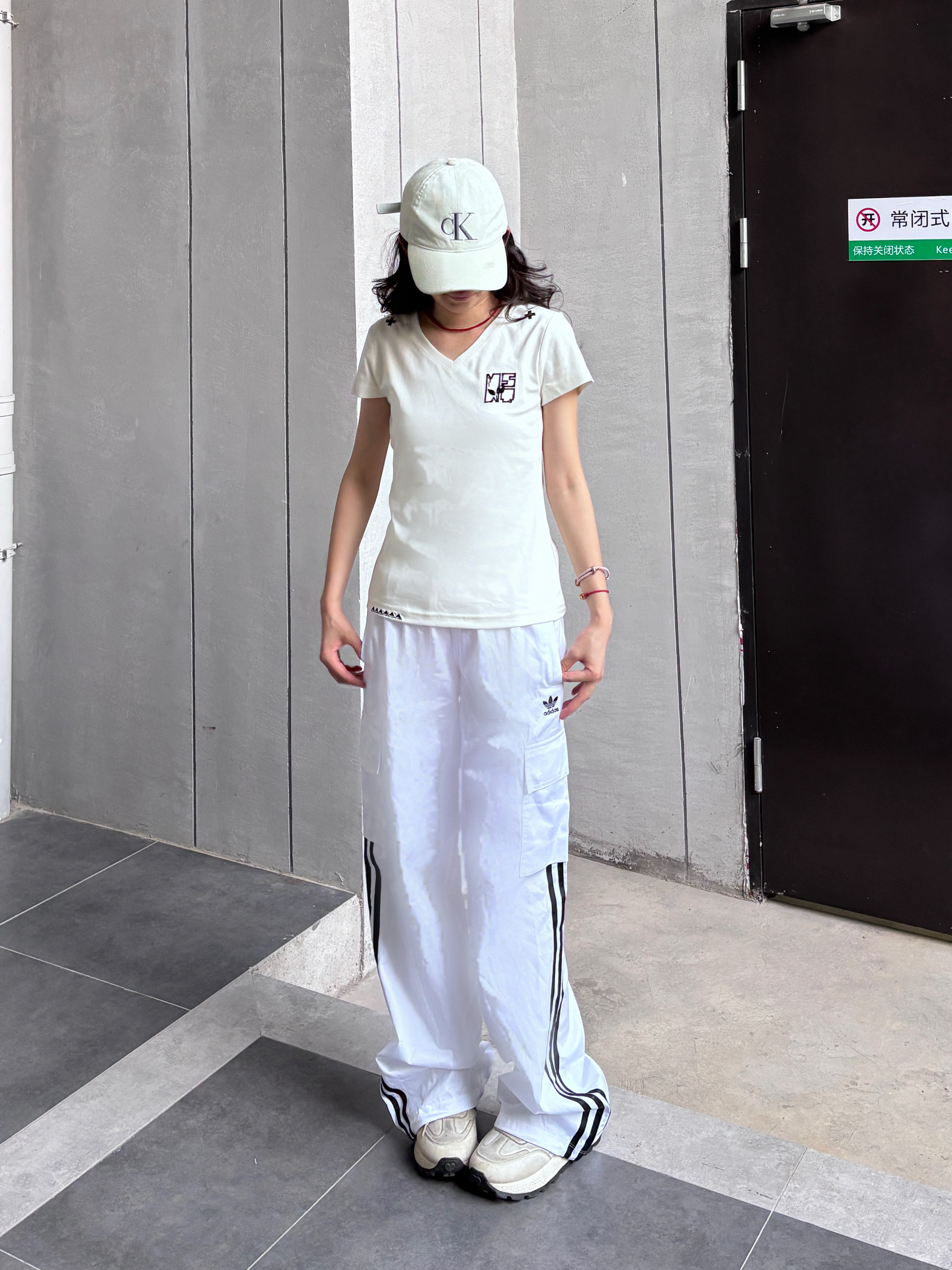 今天分享一身超舒服的look!白色V领短袖,领口和肩头的小设计很别致,简约又有细节,贴合身形但不紧身,超显气质~搭配同色系阔腿裤,透气又藏肉,再戴顶棒球帽,清爽随性,日常出街、运动都超合适,妥妥松弛感拿捏✨