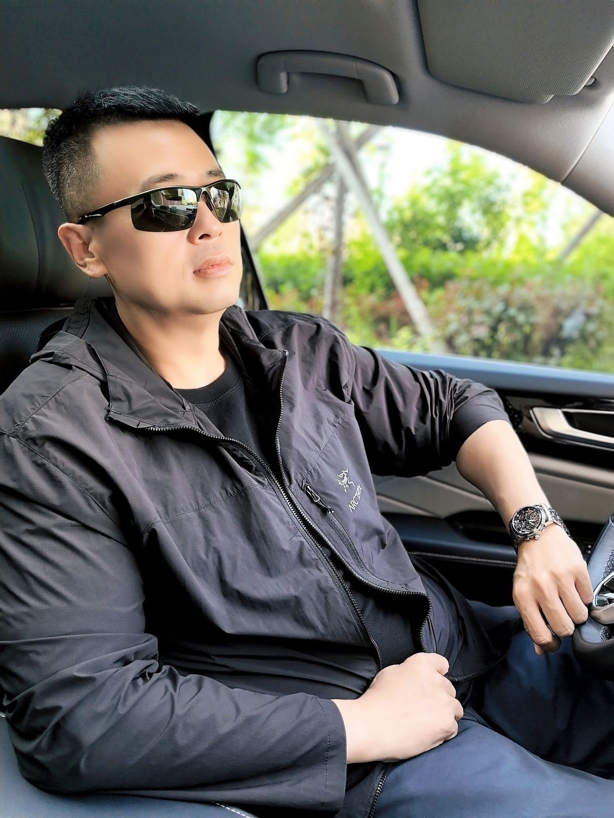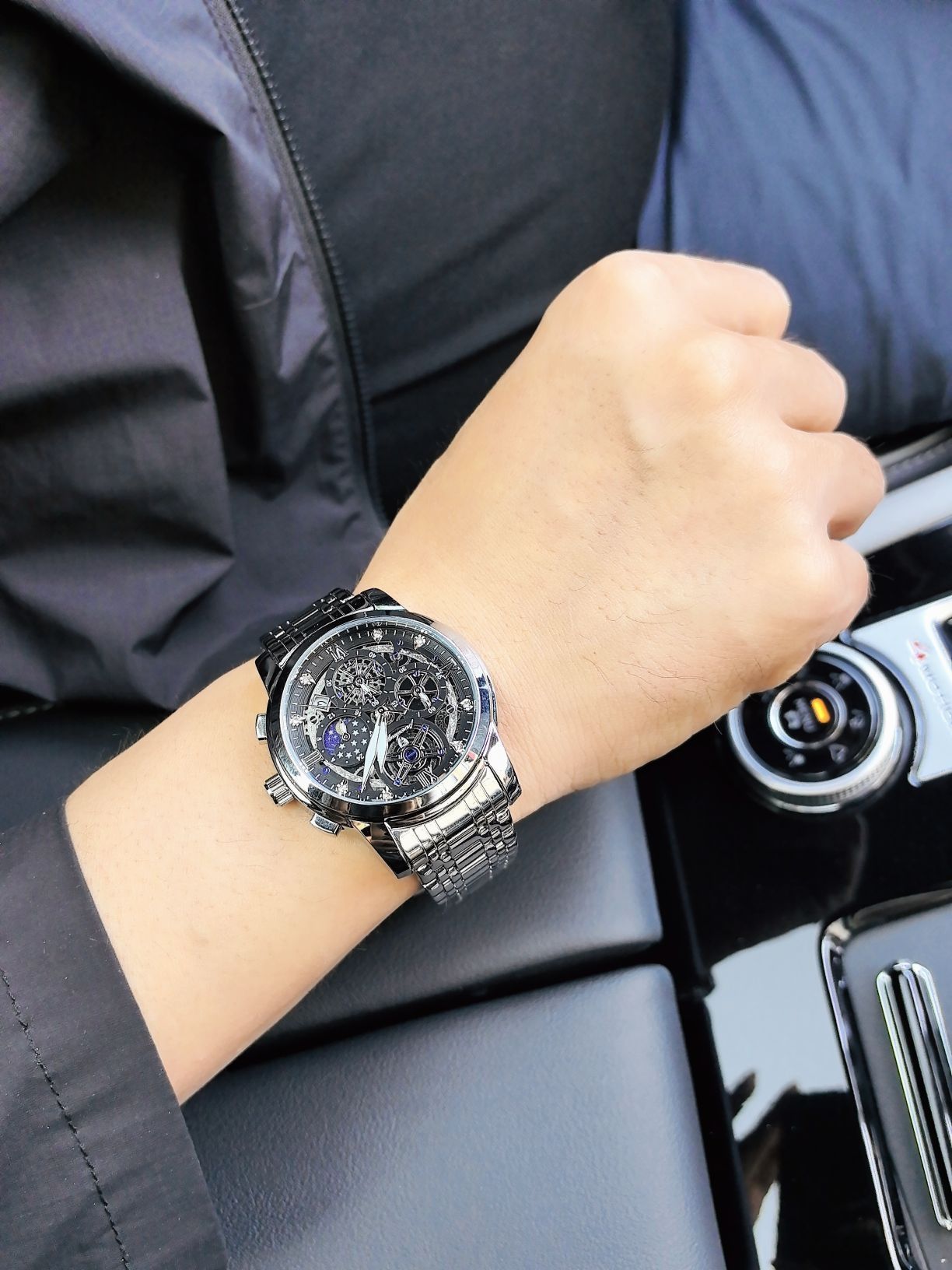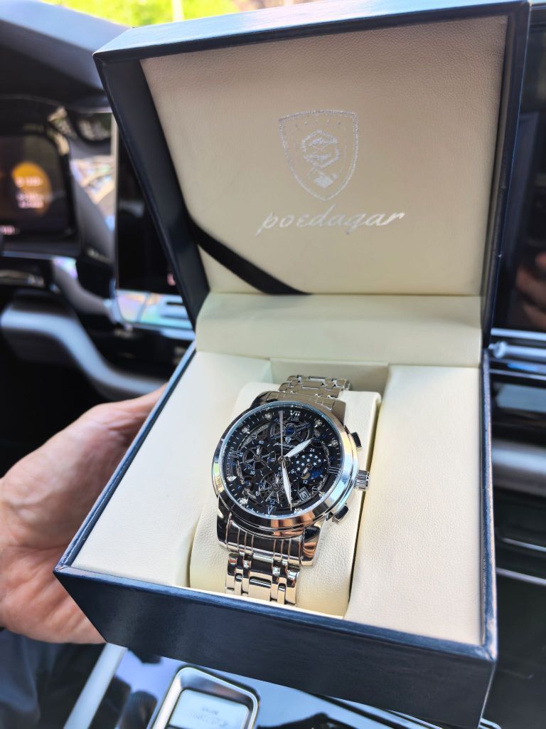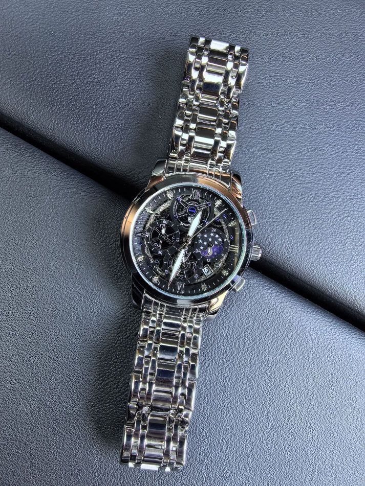 今天穿了件黑色防晒服 手上戴的是柏达茄男士腕表 表盘是镂空的 看上去就很有个性 带有昼夜显示就会很方便 精钢的表带很适合夏天 带久了也不会很闷热 礼盒包装送人自用都会很有面子 百元的价位也是性价比满满
