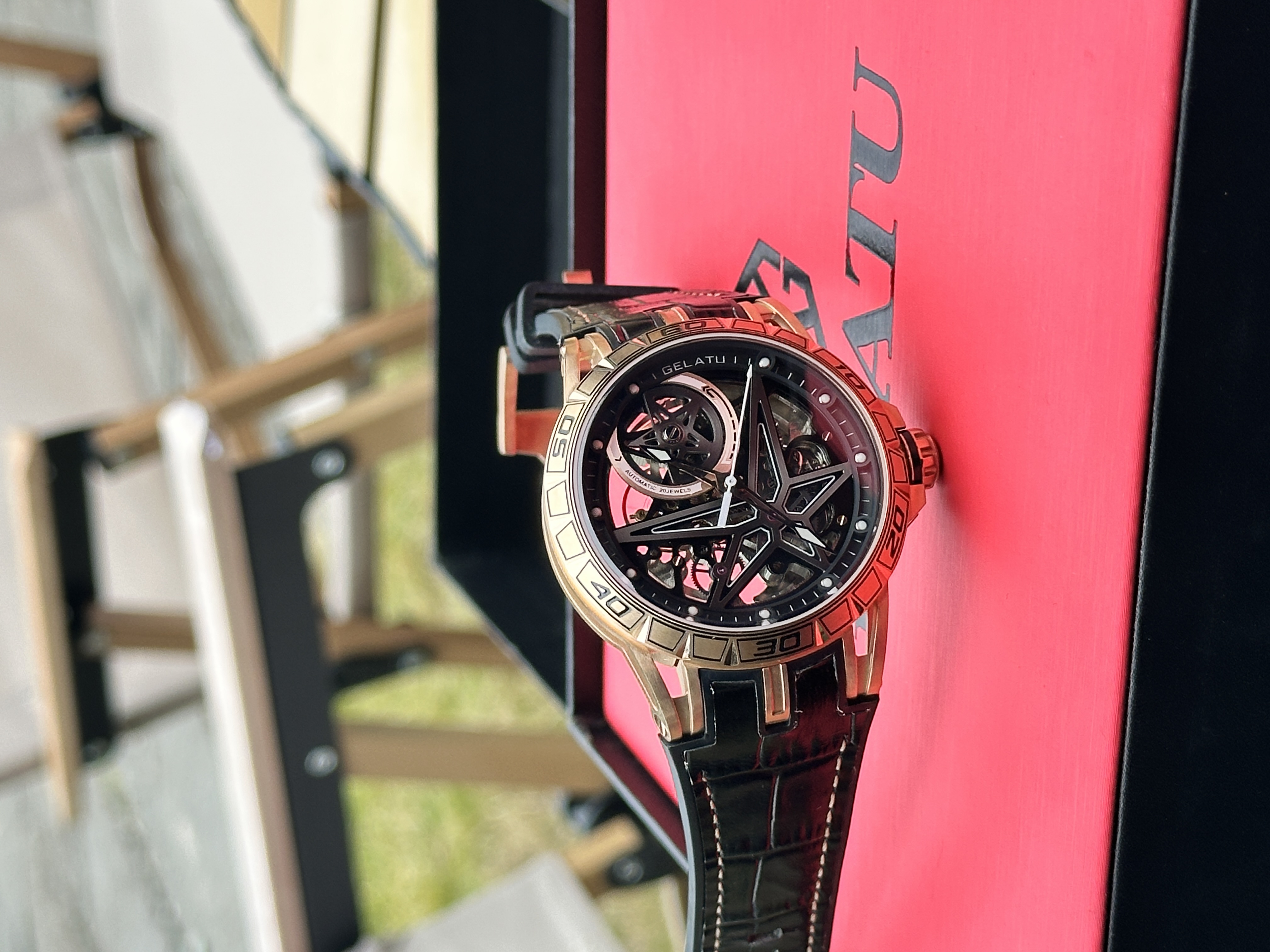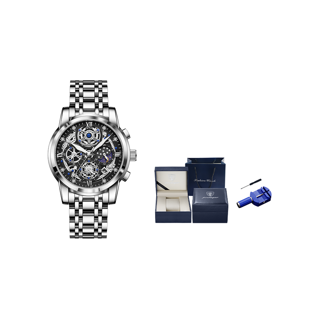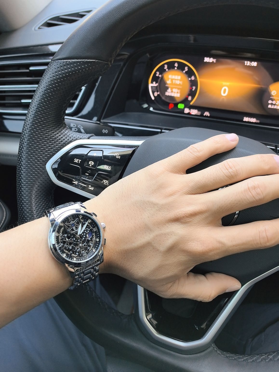 今天穿了件黑色防晒服 手上戴的是柏达茄男士腕表 表盘是镂空的 看上去就很有个性 带有昼夜显示就会很方便 精钢的表带很适合夏天 带久了也不会很闷热 礼盒包装送人自用都会很有面子 百元的价位也是性价比满满