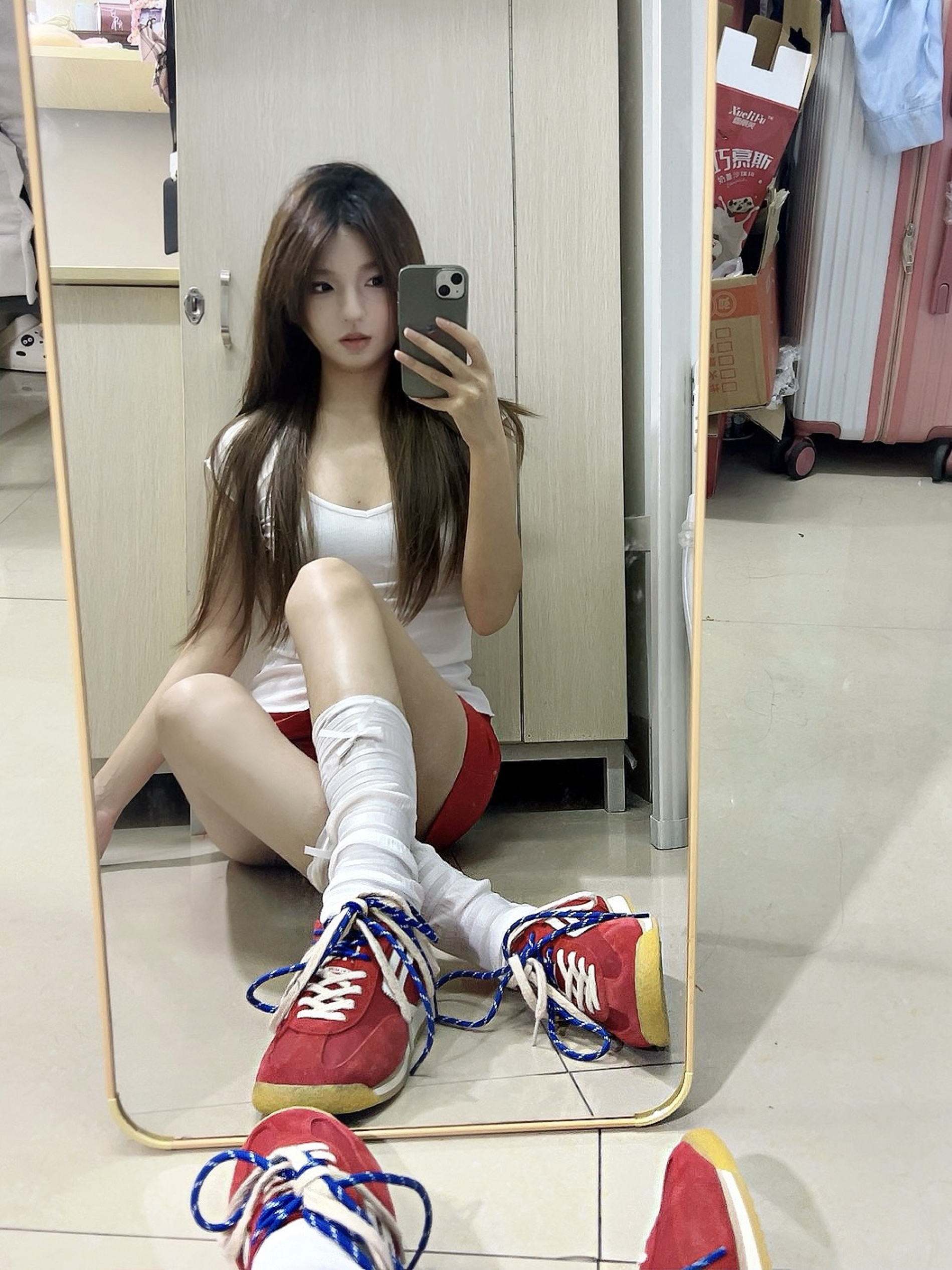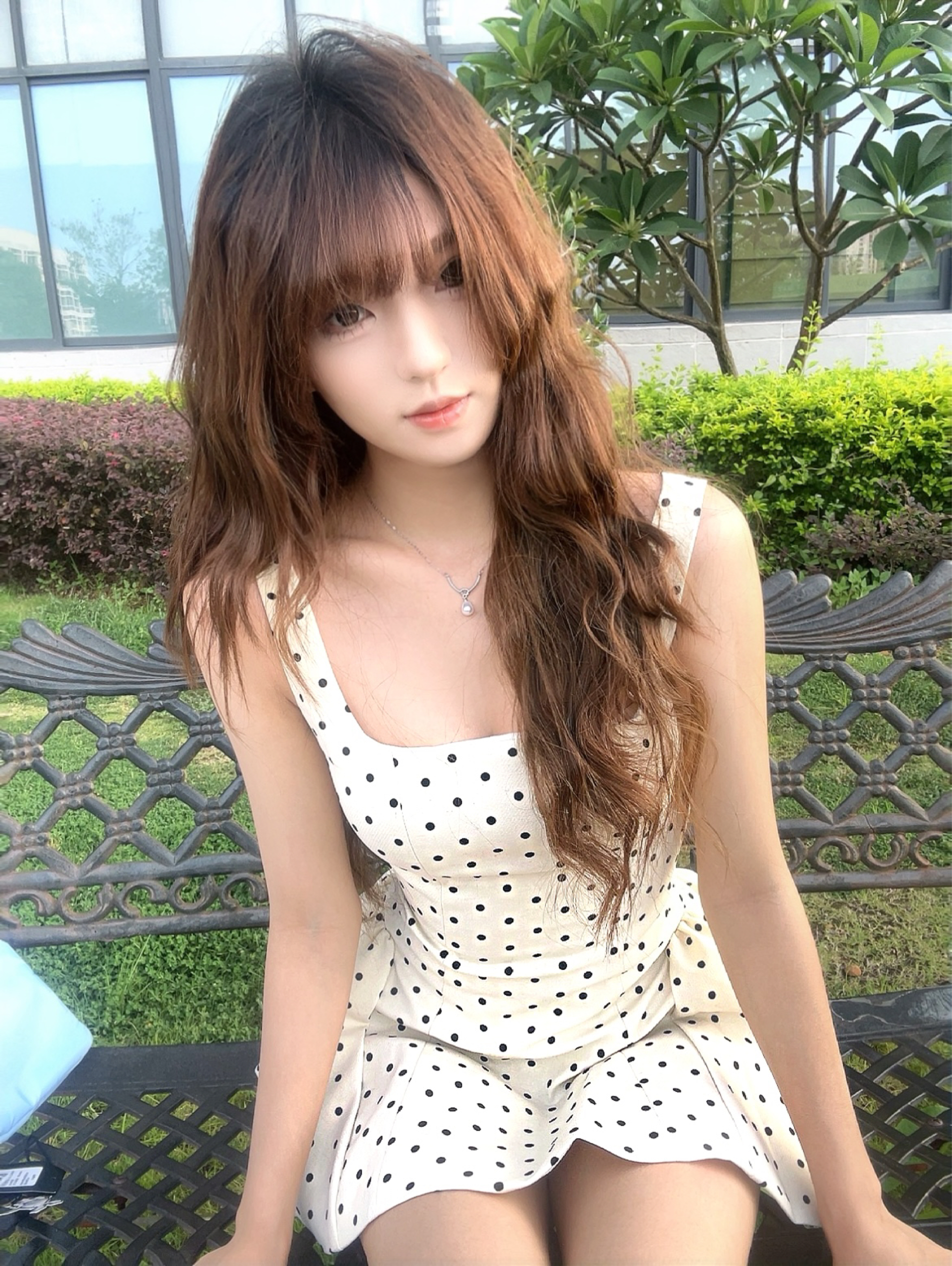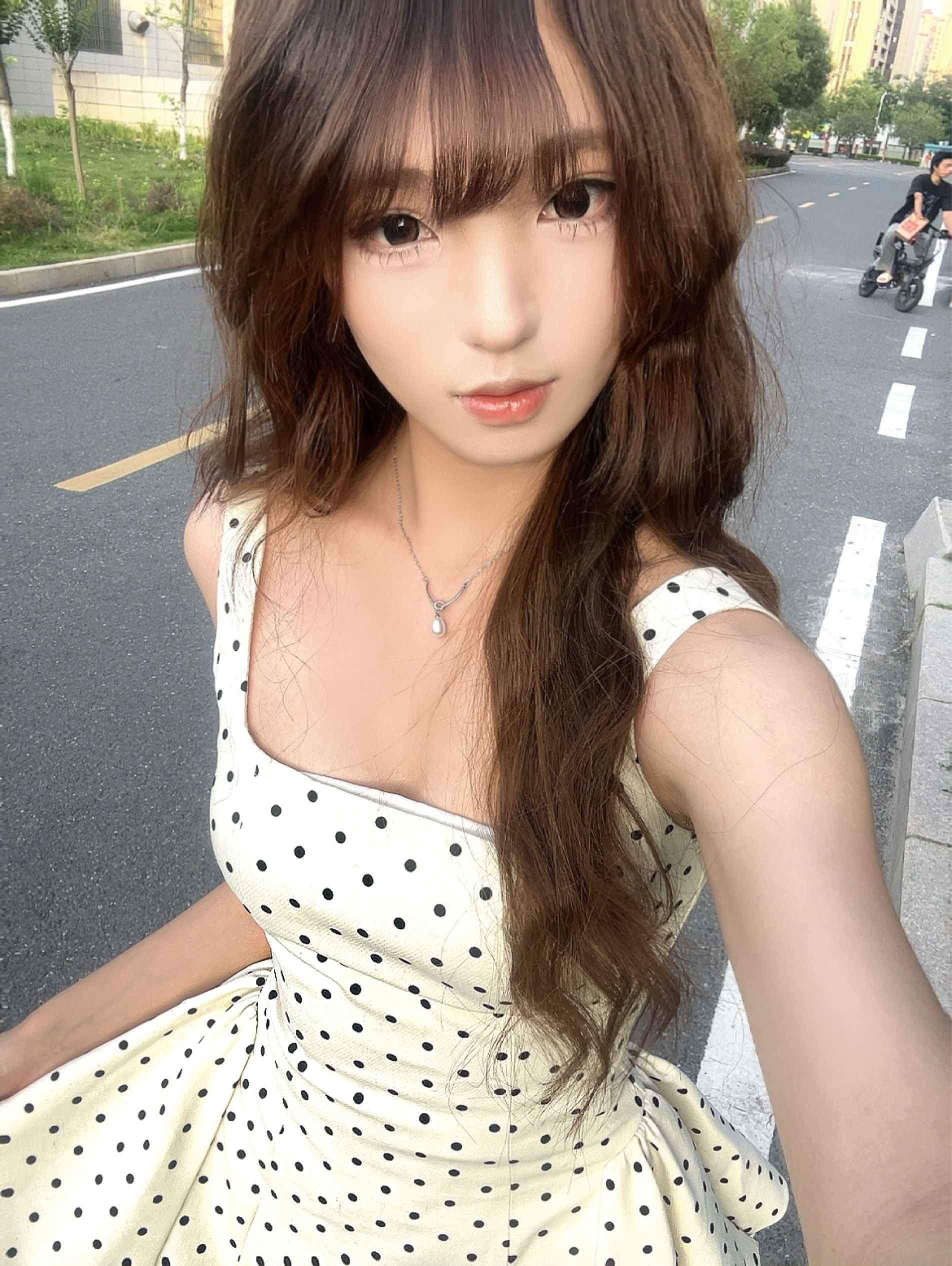 身高|体重:163/90 🧍♂️ 穿搭风格:千金风 👗:波点吊带 👟 鞋子:玛丽珍皮鞋 🎒配饰:珍珠项链