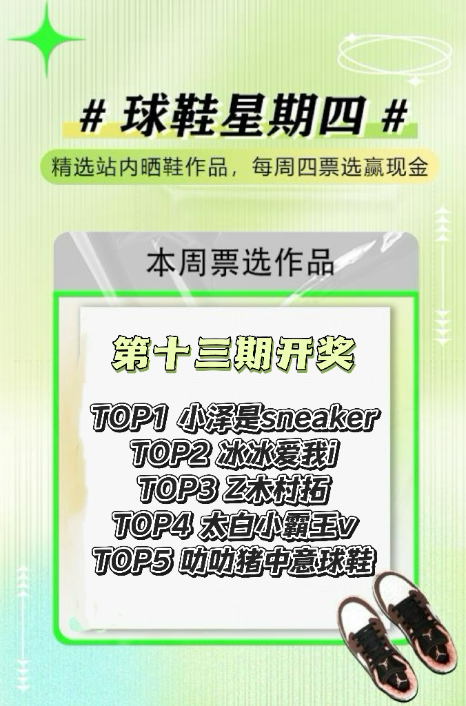 截至目前#球鞋星期四第11期已圆满结束,获奖结果新鲜出炉! TOP1 钱美丽不美丽 TOP2 太白小霸王v TOP3 努力向上的小张 TOP4 冰冰爱我i TOP5 柒叔爱拍鞋 👏恭喜以上获奖创作者! 🤗中奖用户可在APP内 现金:【我的】—【返现】 中查看! (现金将于1-7个工作日内到账) 本期活动圆满结束,再次感谢大家的积极参与!