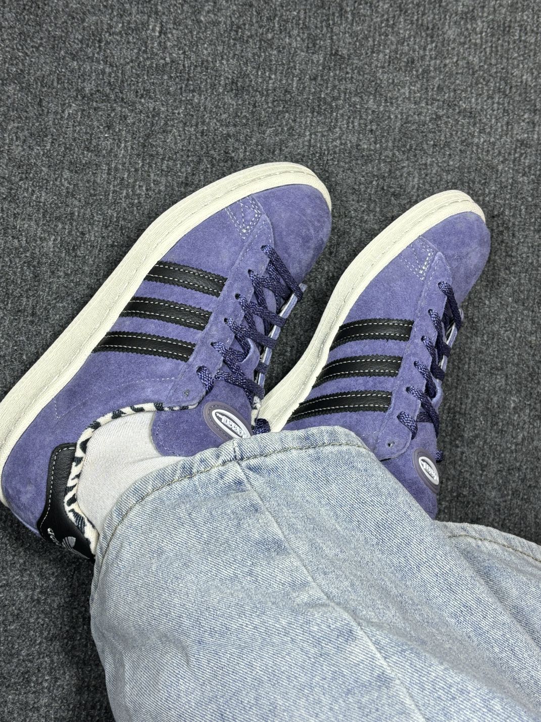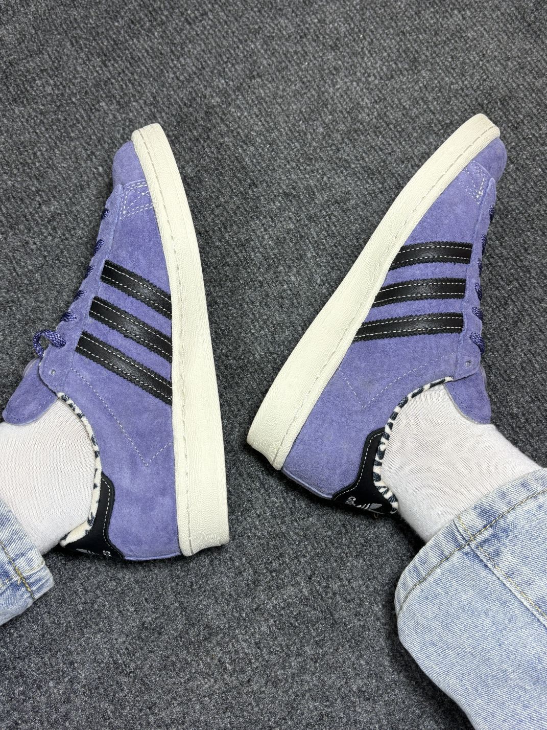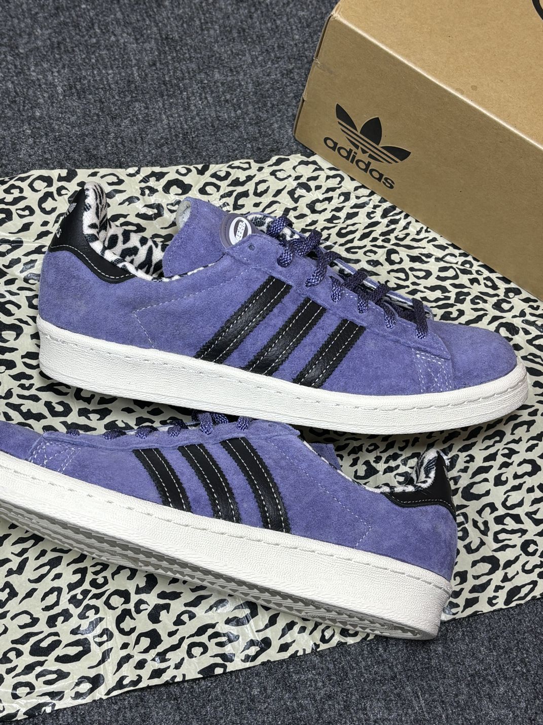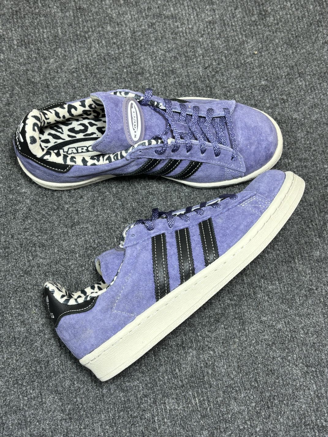 这双阿迪达斯板鞋到手有一阵了,来说说真实感受👟 麂皮紫色鞋面很特别,配黑色条纹,鞋里的豹纹内衬有点小个性,和牛仔裤搭还挺好看。脚感嘛,刚开始穿有丢丢硬,得踩踩才会软和些,日常走路、逛个街倒是能扛住。 不过缺点也得唠唠,麂皮材质是真难伺候,沾点灰、溅到水,肉眼可见的脏,清洁起来费老劲了😅 尺码我穿着稍有点偏大半码,得垫鞋垫才能稳当。还有这颜色,搭衣服得琢磨琢磨,不是啥风格都能适配,偶尔会纠结咋搭...