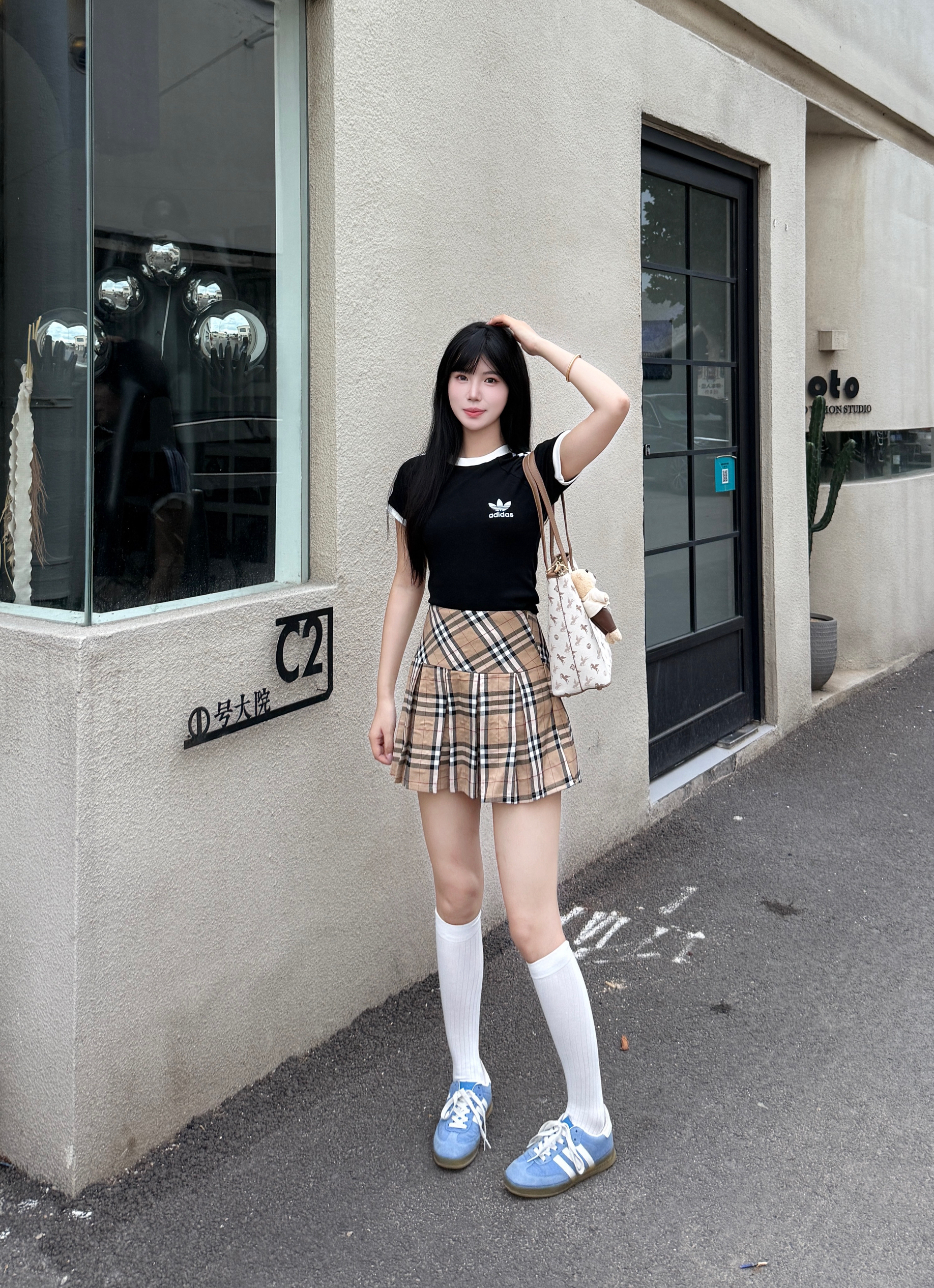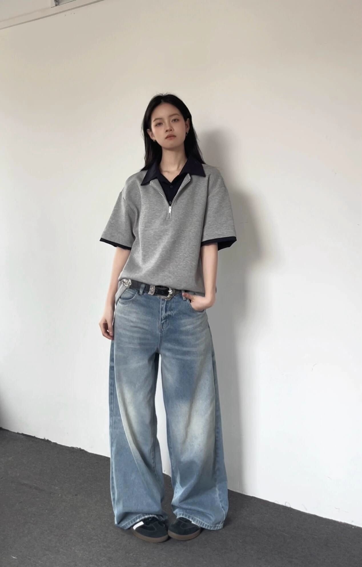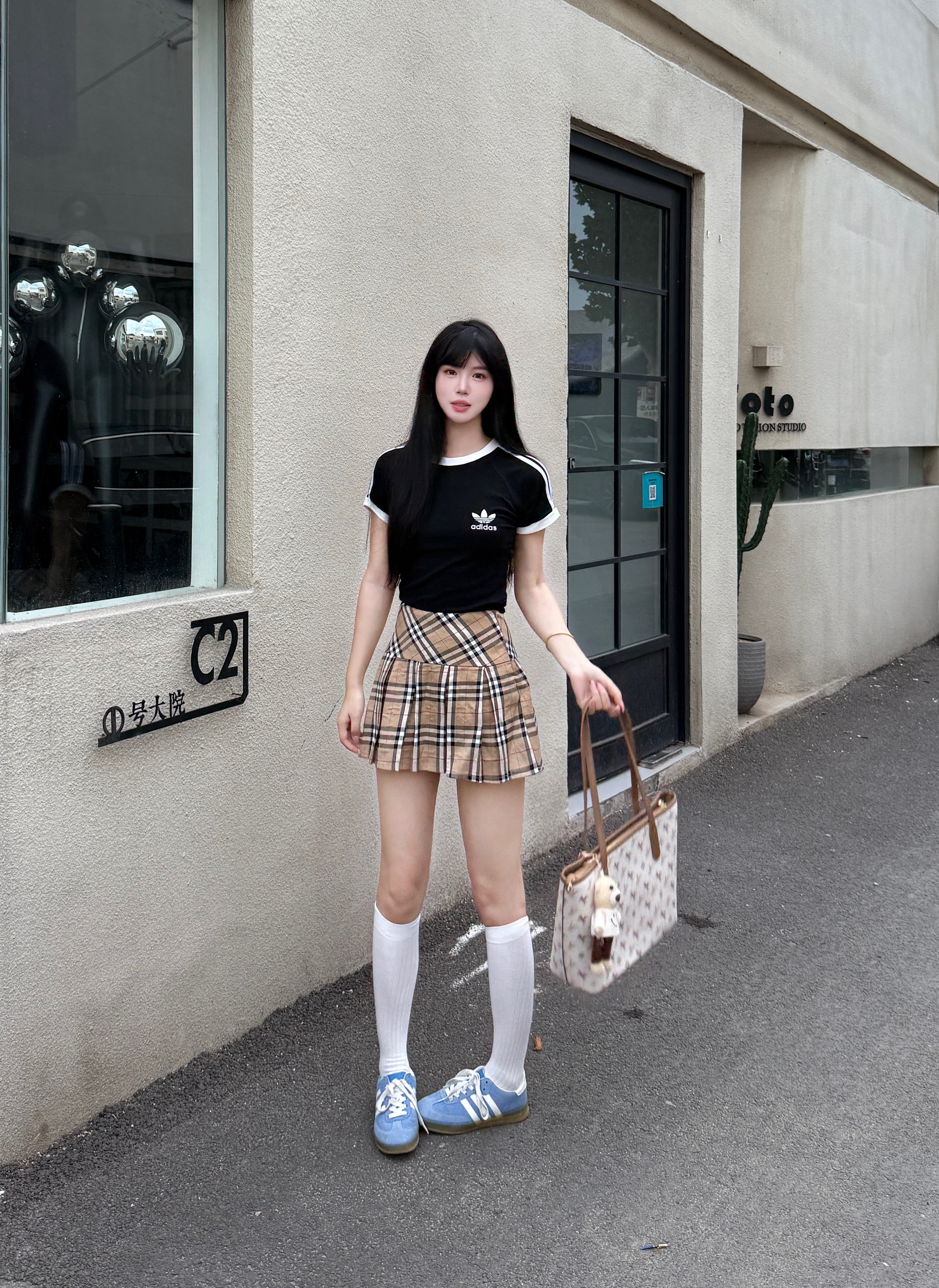 韩女都爱的韩系T恤衫 黑色搭配学院风短裙就很不错哦 再搭配一双经典德训鞋 这一套舒服又出片
