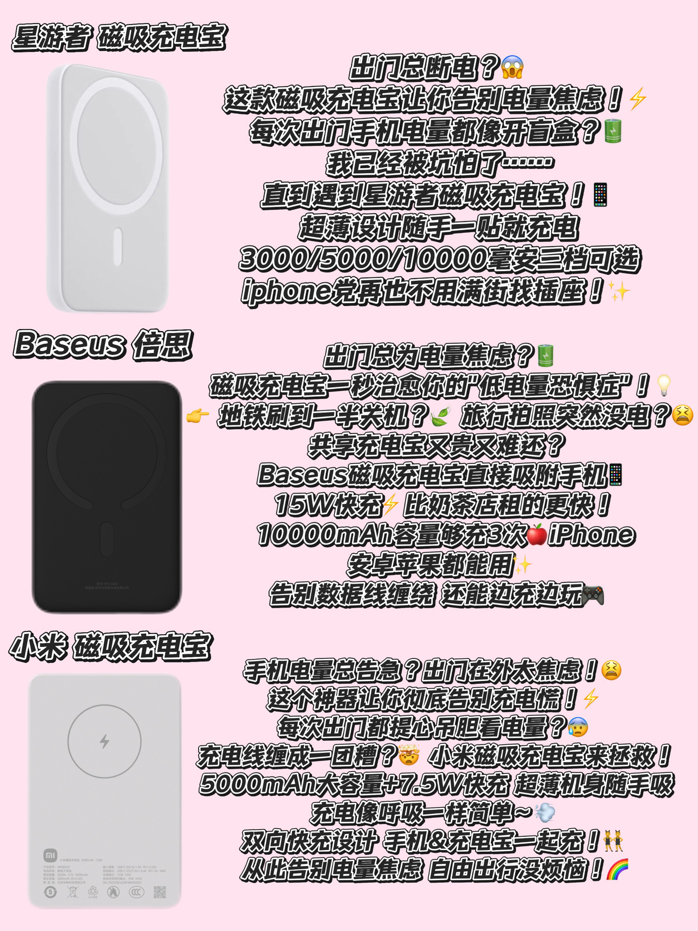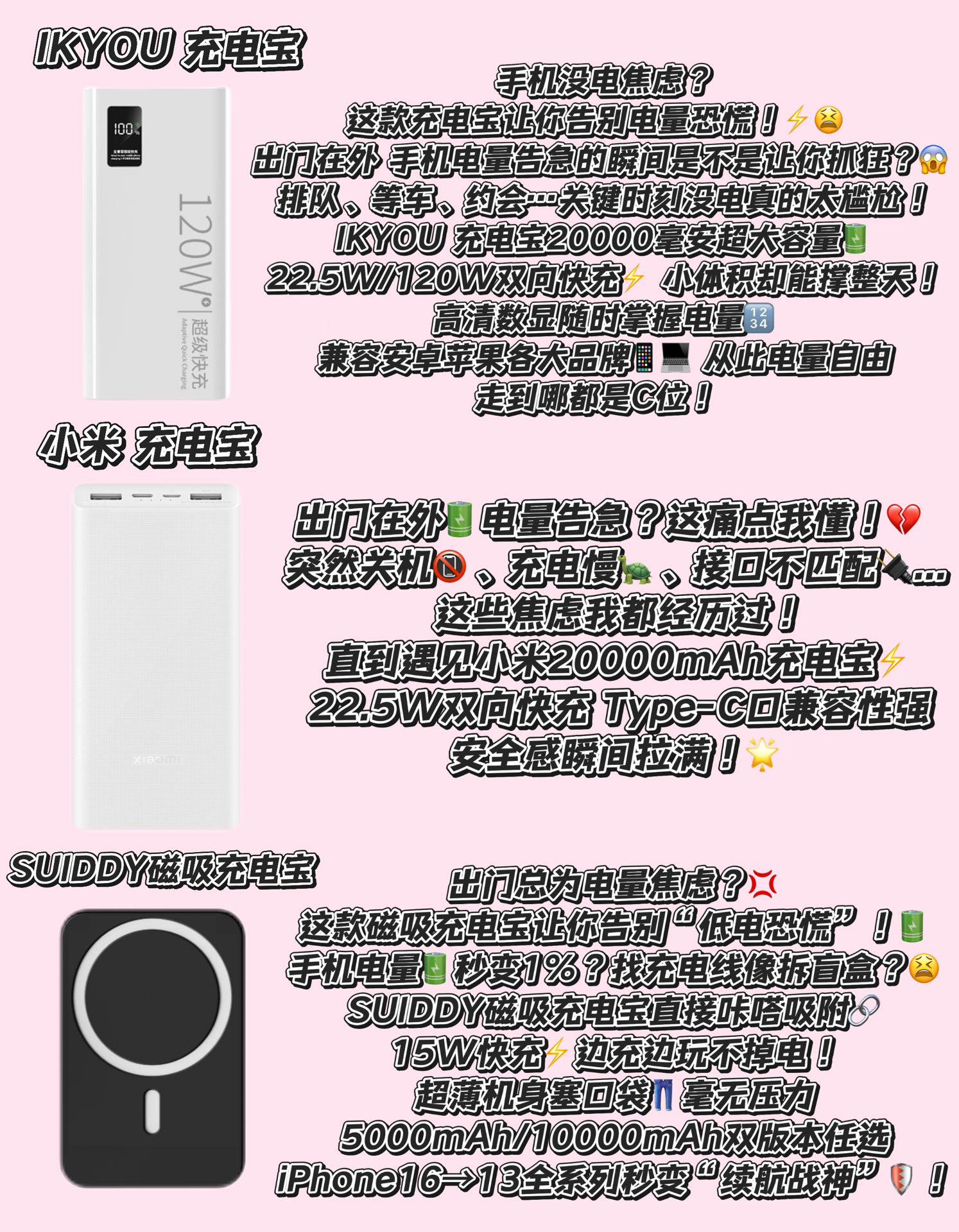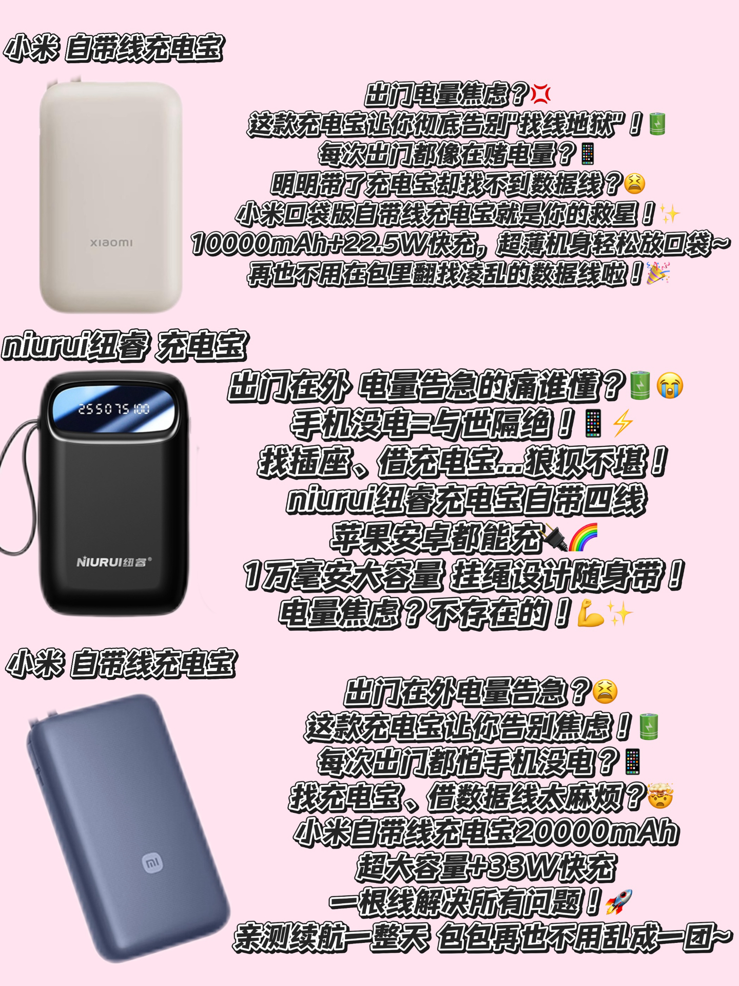 有没有遇到过这些崩溃瞬间?👉 出门逛街手机突然剩20%,扫码付款时直接关机…📵 出差高铁上追剧正嗨,电量告急找不到插座…😱 和闺蜜自拍到一半,手机黑屏错过C位…🤦♀️ 作为一个常年被电量PUA的职场人,我测评了18款网红充电宝,终于找到这些救命神器!✨ 🔥【三丽鸥萌系充电宝】颜值党看过来!10000mAh够充3次手机,12W快充不伤机,粉色库洛米印花直接少女心暴击!🎀 ⚡️【纽睿自带四...
