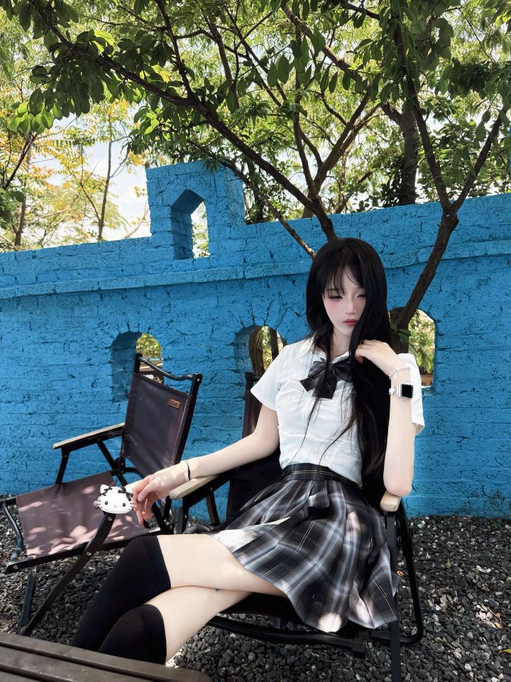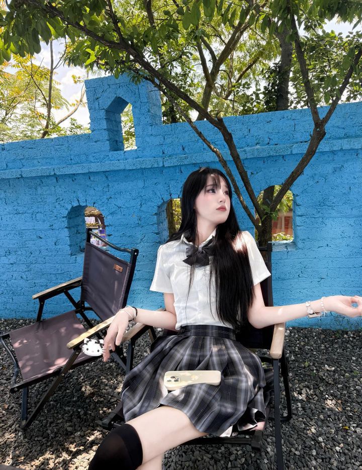 被蓝色围墙狠狠拿捏🌿 白衬衫+黑领结,配灰格裙+过膝黑袜,甜酷平衡刚刚好~ 清冷氛围拉满,像从漫画里走出来的学姐✨ 户外打卡穿这套,和蓝天绿树适配度100%,出片率直接拉满📸 黑甜女孩速码! #JK穿搭 #黑甜风 #户外拍照