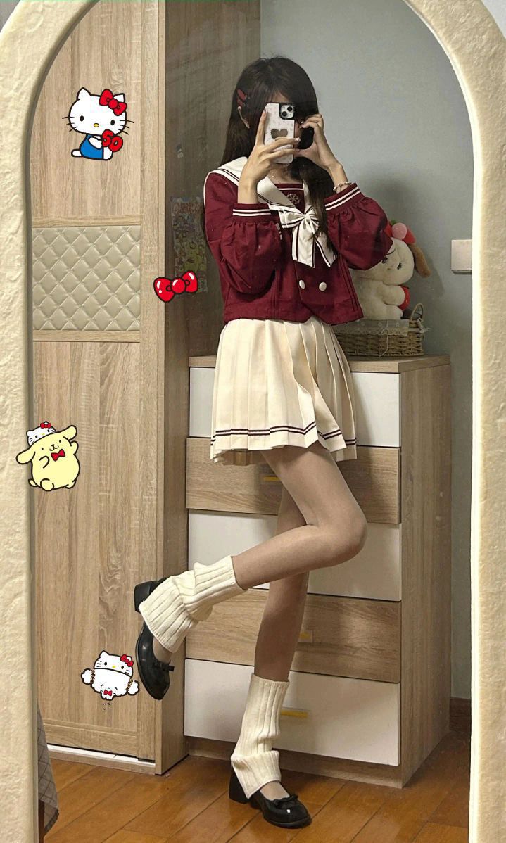 谁懂!这套jk穿搭把青春感锁死🔒 酒红水手服+奶白百褶裙,校供感拉满✨ 堆堆袜配小皮鞋,可爱到冒泡~ 居家自拍都像校园剧女主,发圈被问爆的穿搭,jk控速码! #jk穿搭 #校园风 #少女感