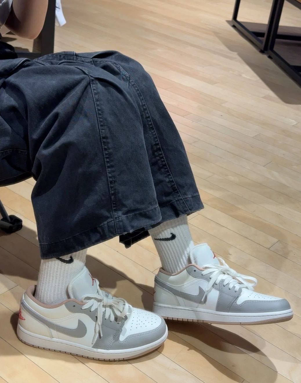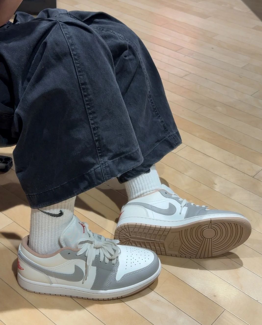 Nike这双灰白AJ1少年感拿捏得刚好 夏日少年感的氛围人这双鞋给你灰色系真滴绝 白灰 米色的皮革拼接百搭又耐看红色刺绣点缀~精致感拉 满满一点奶呼呼的卡其色与鞋底卡其色相呼应低饱和 灰白拼接卡其鞋底,红色刺绣小logo是亮点,低调但有 细节。皮革柔软,上脚基本无磨合期。鞋底防滑纹路 适合日常穿着,浅灰拼接奶呼呼,低帮蹦哒超轻松穿 去逛gai被追着问链接