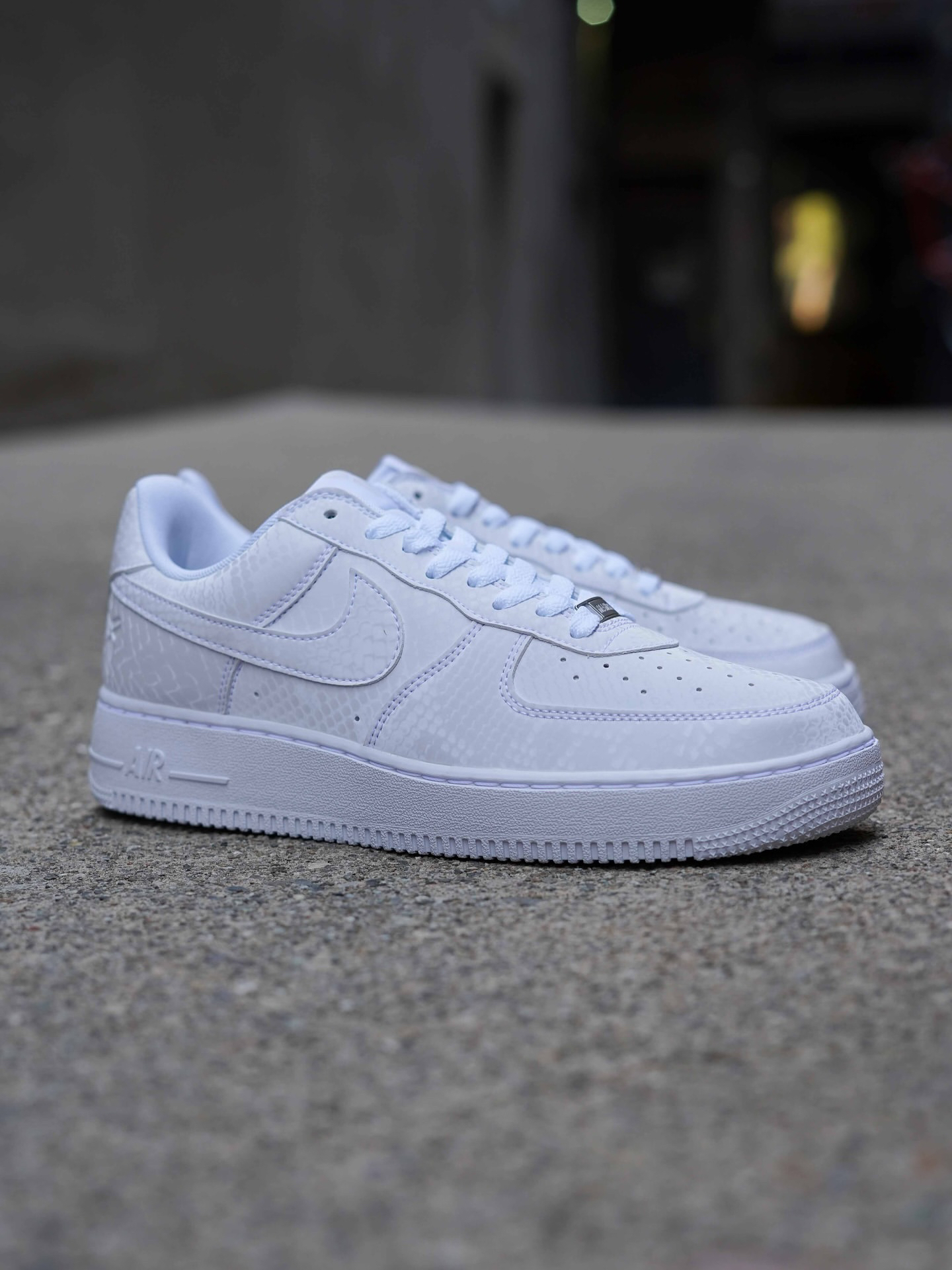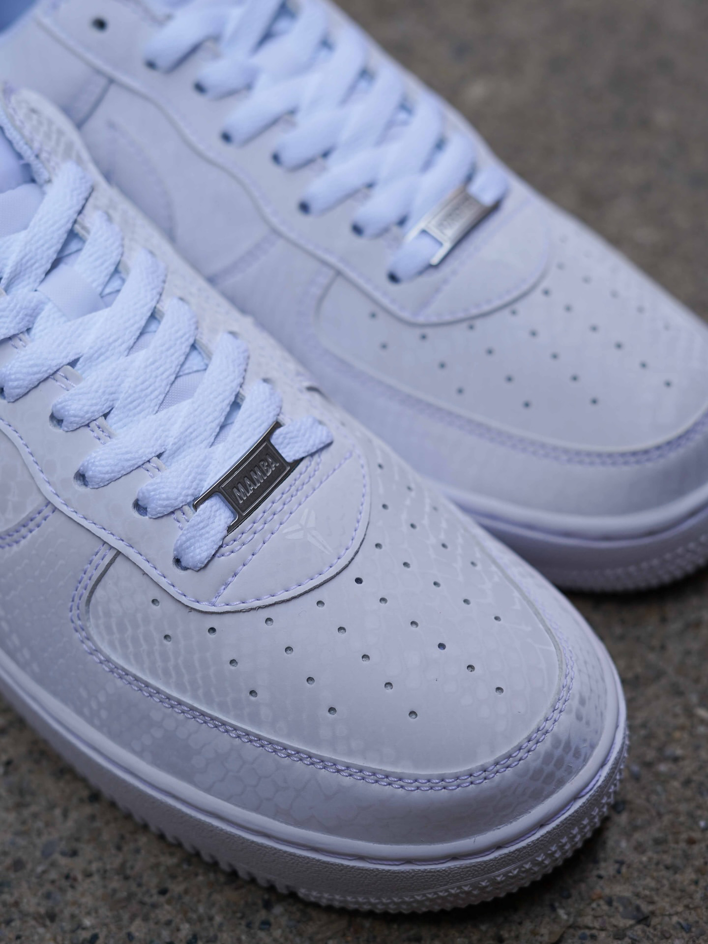 这双纯白色的Kobe AF1乍一看没有什么特别的,和普通的纯白AF1看上去基本一样。但是当你拿在手上仔细观察时,会发现鞋身上布满了科比的元素——全鞋身的蛇鳞纹、后跟的824和科比Logo、鞋头的Mamba铭牌......十分适合喜欢科比的鞋迷收藏🐍