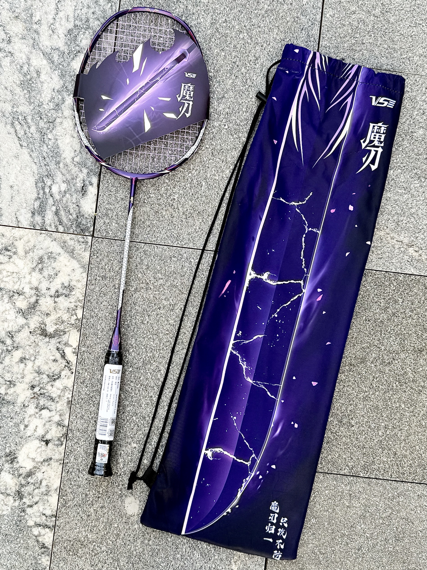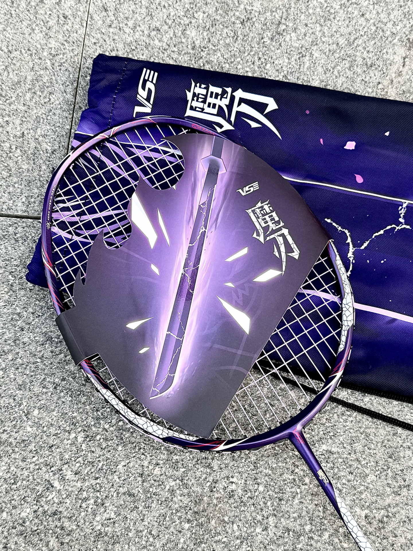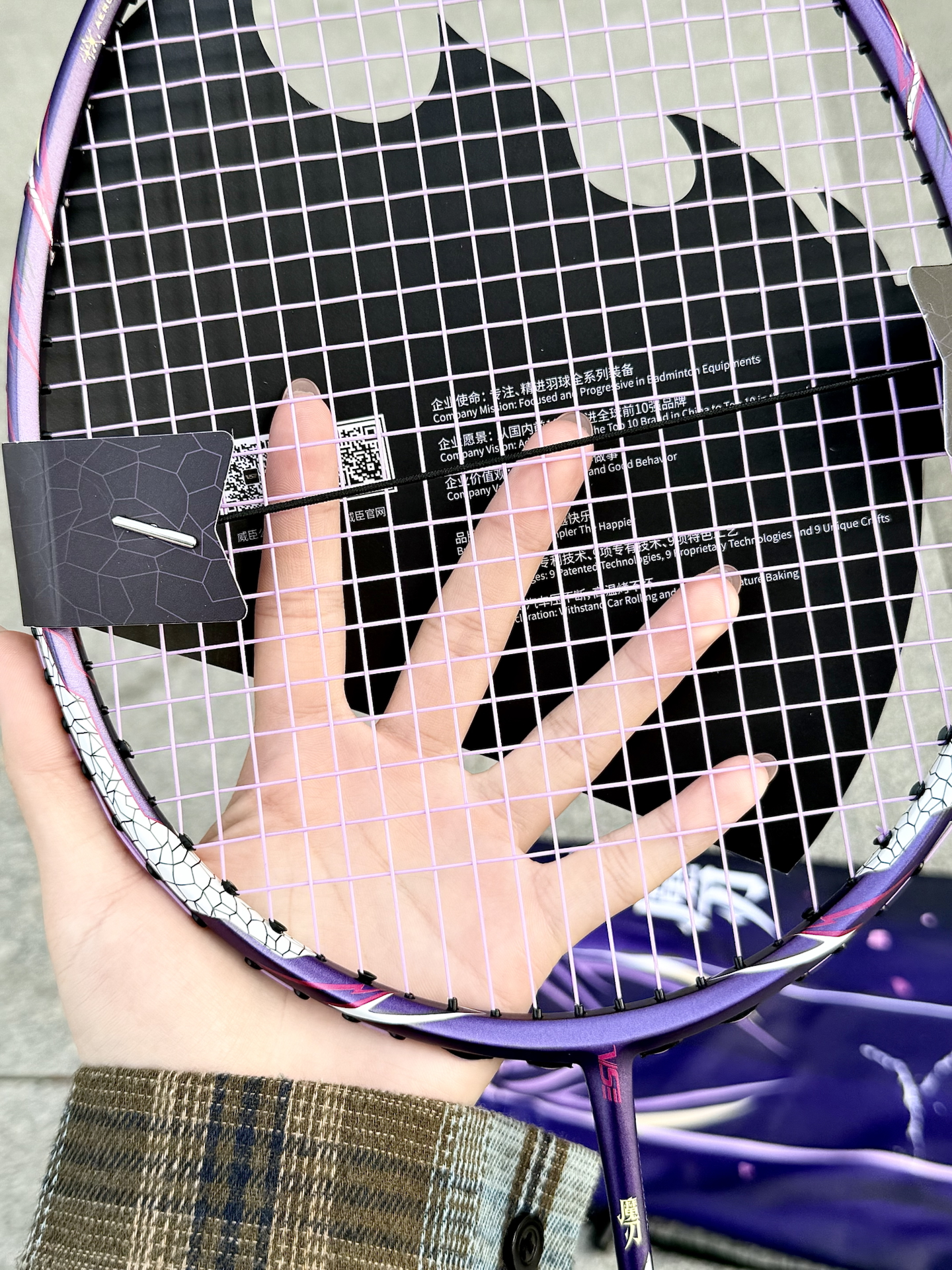 看好多人推荐威臣魔刃羽毛球拍😉,紫色那款颜值确实绝~ 它对新手很友好💪。我在犹豫入它还是买个更进阶的。 有用过的小伙伴说说它耐用度咋样吗? (配图:同款手部近景照一张、拍包近景照一张、拍包放脚边近景照一张) 。