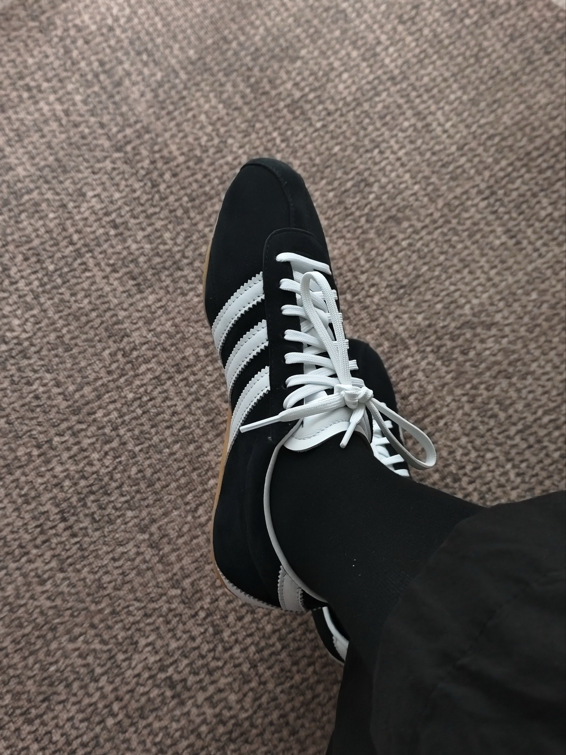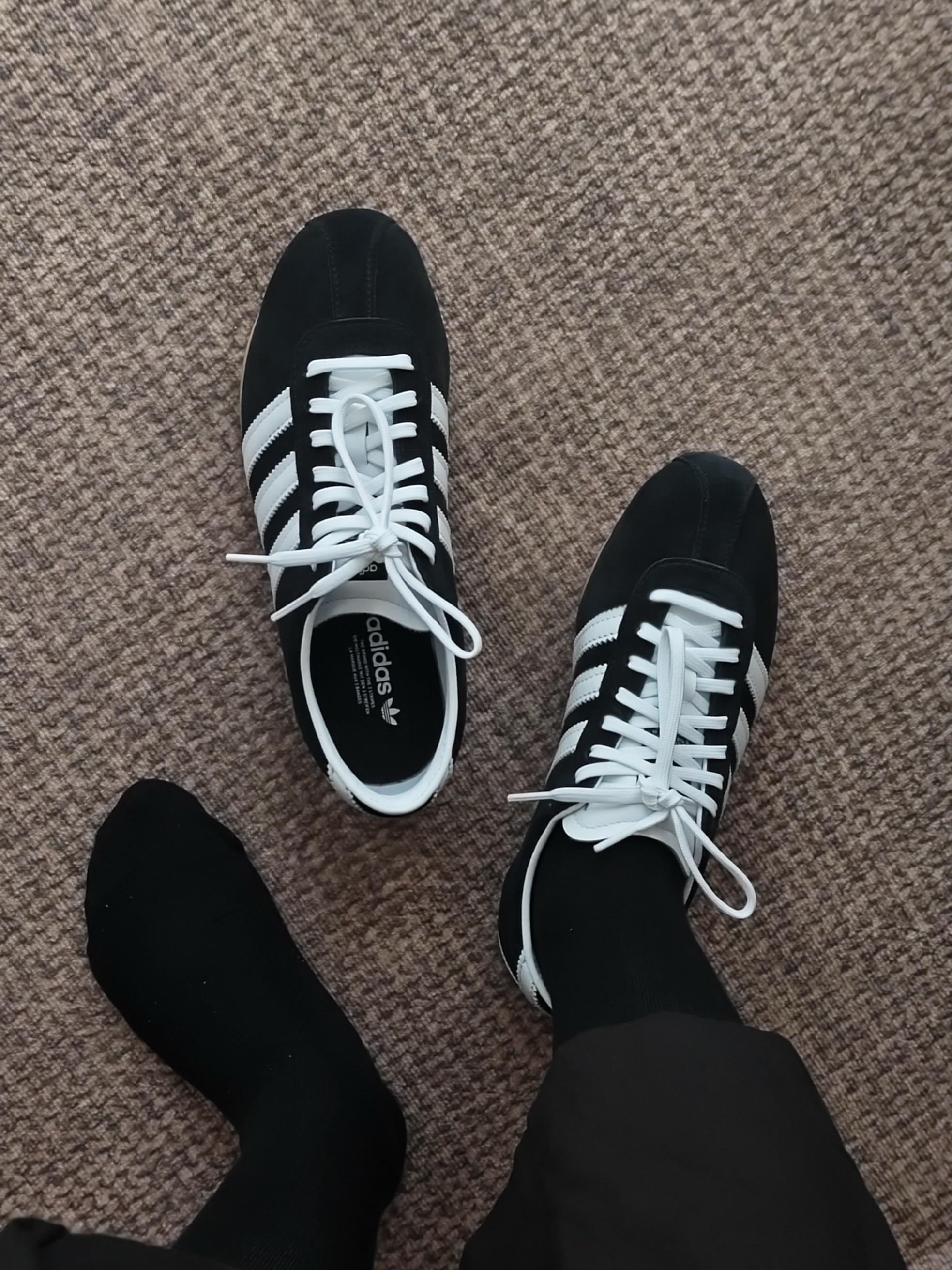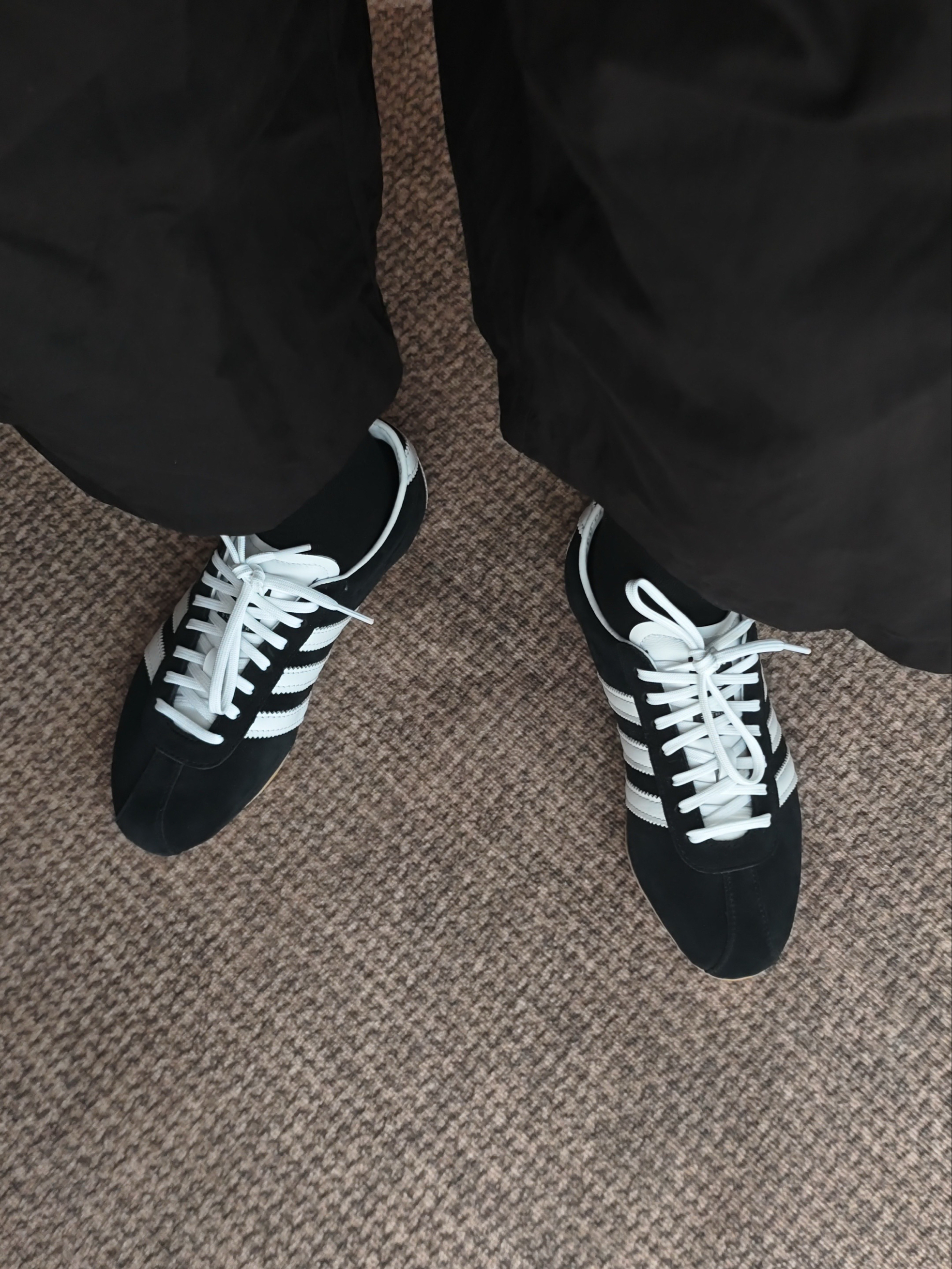 说是7月,其实是6月最后一天买的一双Adidas Tokyo,到底入手了多少薄底鞋啊🥺。这双鞋子穿上视觉效果太好看了啊,黑色特别酷。鞋身偏修长,很适合搭配七分裤八分裤这种,男生女生穿都OK。薄绒的鞋面,质感还是不错的,大家感兴趣的话也可以去看看其他的配色,价格还挺好的。