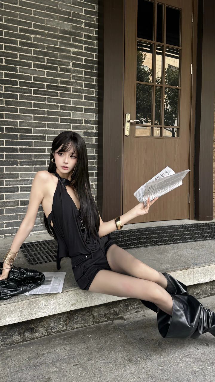 被追问的街头松弛感穿搭来啦🔥 纯黑挂脖上衣+短裤,性感与酷感拉满~搭配透肉丝袜+阔腿靴,慵懒又时髦✨ 手拿报纸凹造型,砖墙门前随手拍,都是“街头时髦精”既视感📸 想slay整条街,这套公式直接锁死,松弛又炸场💥 #街头穿搭 #酷飒风 #松弛感 #时髦精