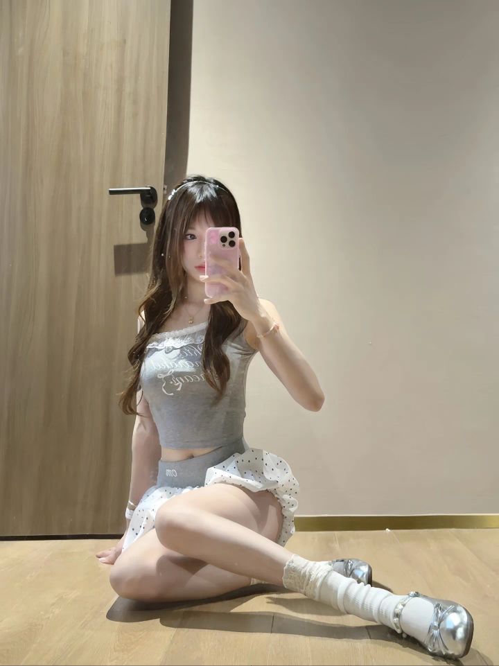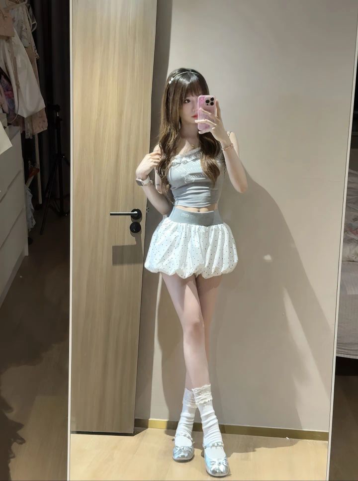 被问爆的居家甜妹公式来啦✨ 浅灰单肩背心+波点蓬蓬裙,纯欲感拉满~蕾丝袜+蝴蝶结小鞋,可爱到跺脚!宅家自拍穿这套,秒变迪士尼在逃公主👑 日常出街也适配,甜妹DNA狠狠动了💗 #宅家穿搭 #甜系少女 #蓬蓬裙 #日常出片