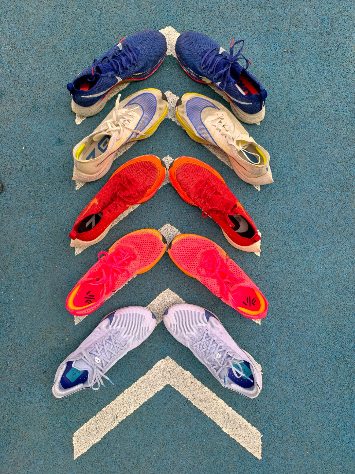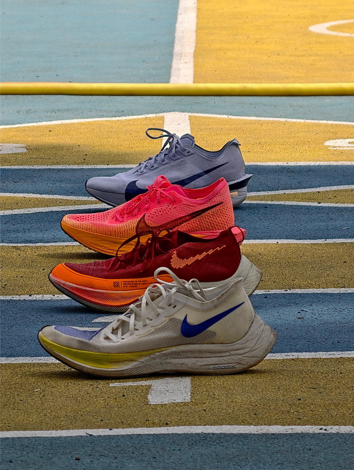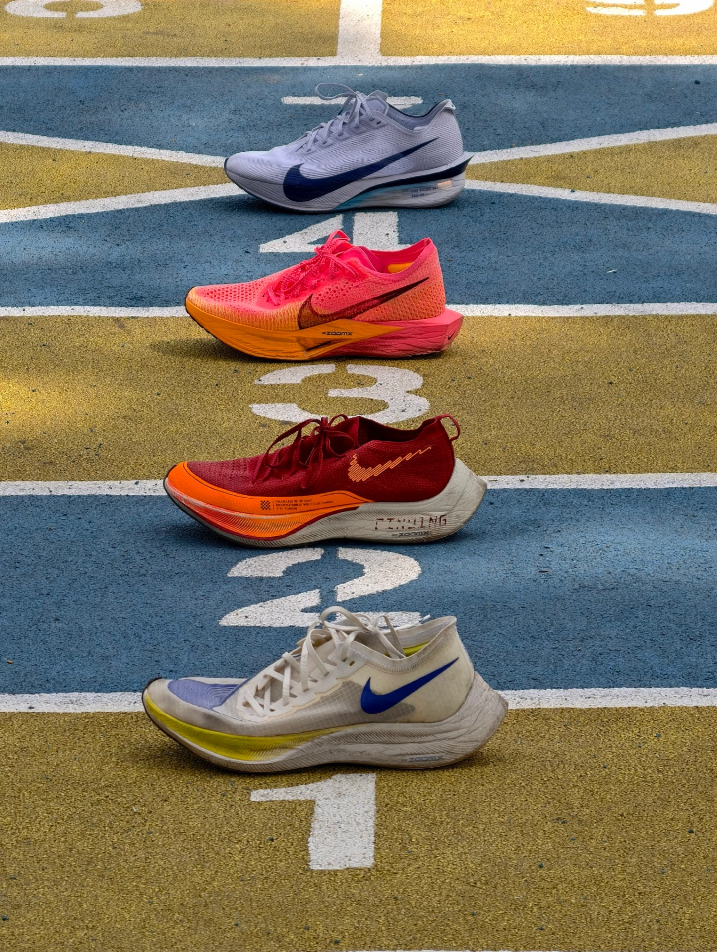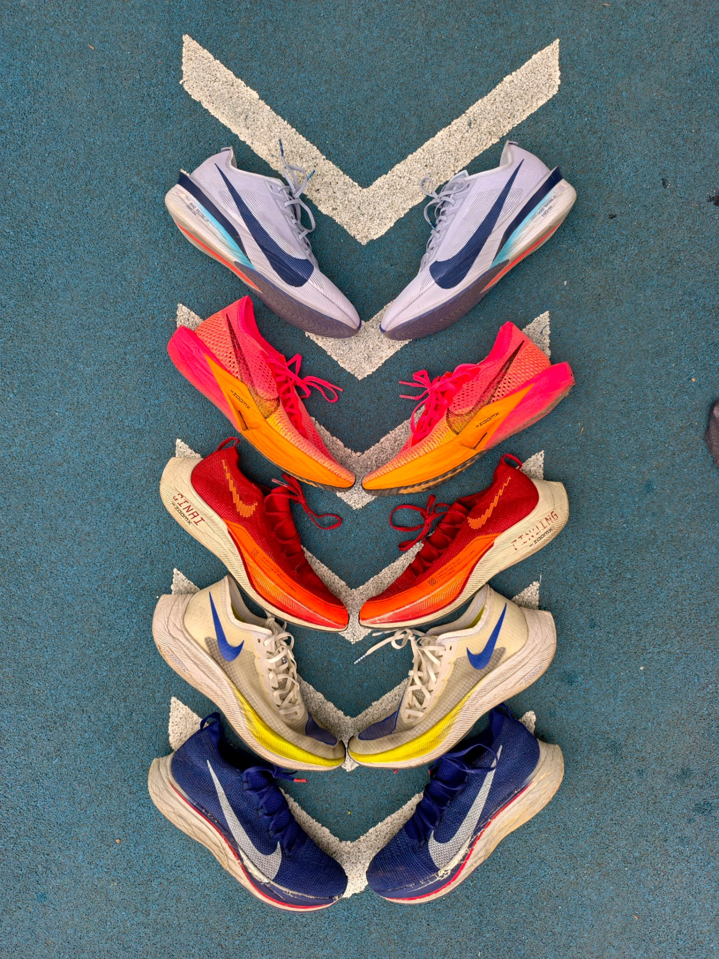#跑鞋全家福 从2018年发布的vapor fly 4%fk开始, 一直到2025年的vapor fly 4 收集齐了这个细节的5代跑鞋 也完整的体验了这个系列的变化 性能最满意的是vapor fly 1代 最难驾驭的是vapor fly 4% 而最新一代的vapor fly 4 责变得不够顶级。更像是强度长距离跑的跑鞋 也更适合半马比赛使用 同时这里面还有个隐藏彩蛋,大家发现了吗?