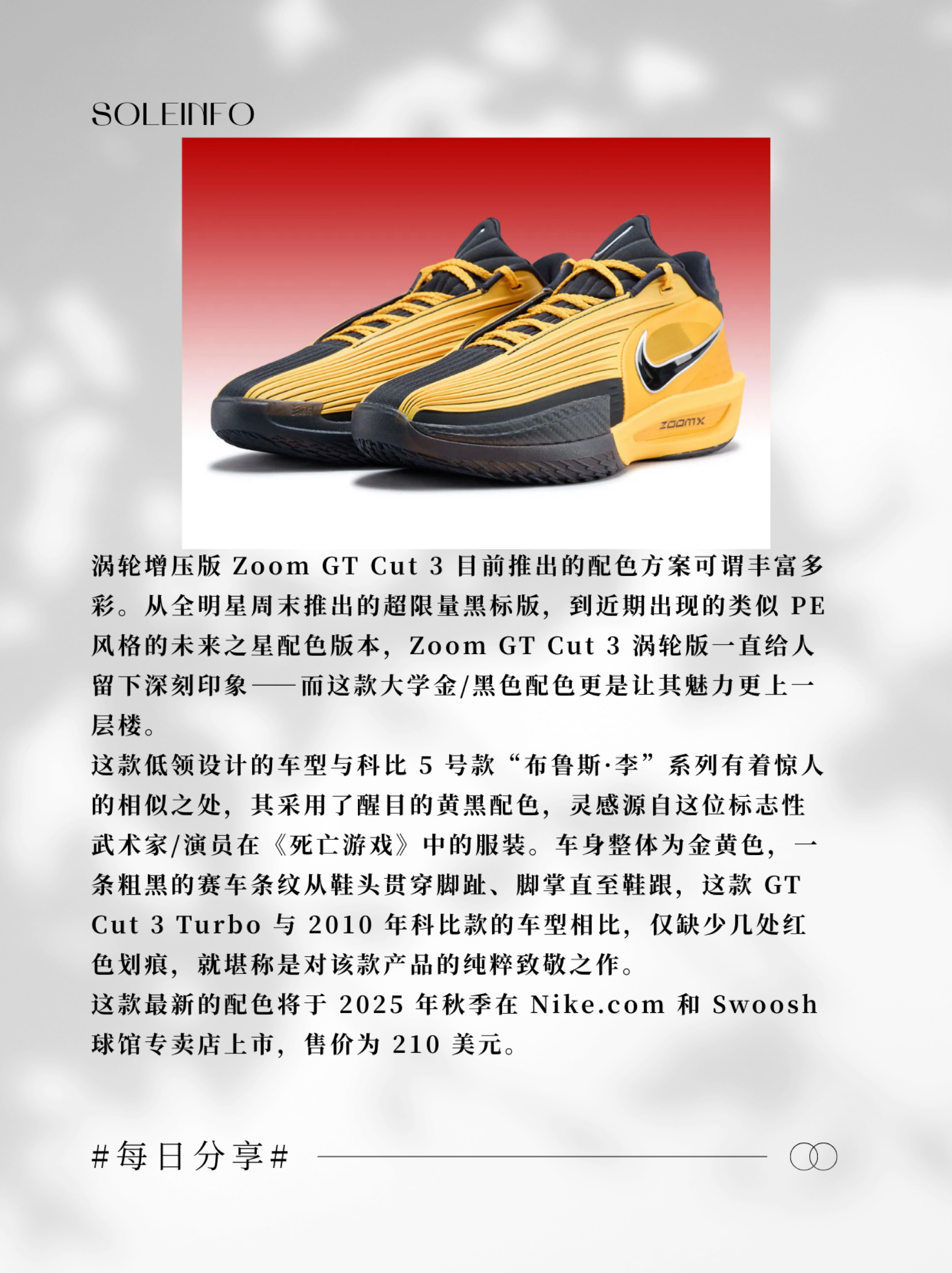 【Nike Zoom GT Cut 3 Turbo Bruce Lee】,由用户 Soleinfo 分享,来自福建。这是一篇来自识货社区的真实用户分享笔记。