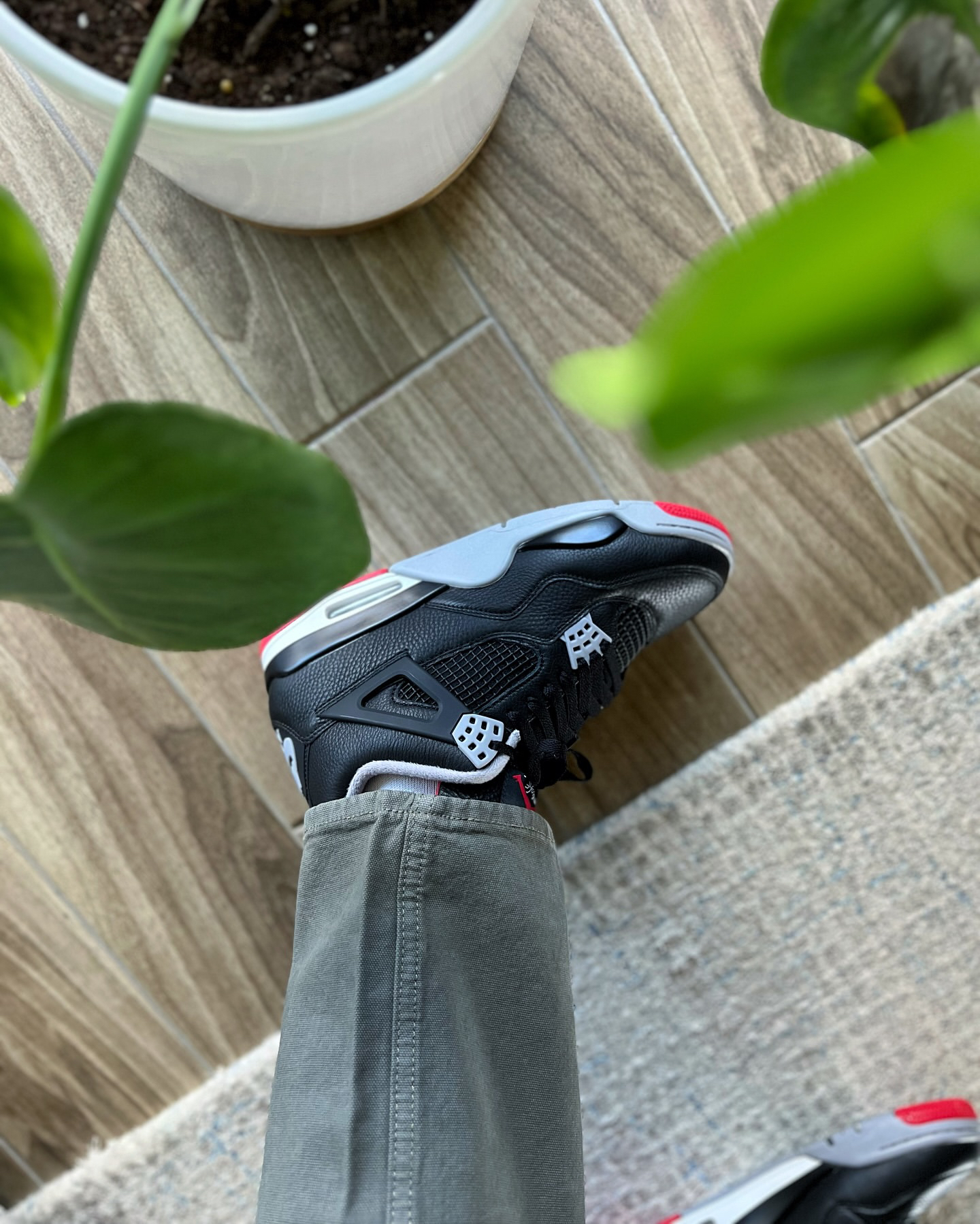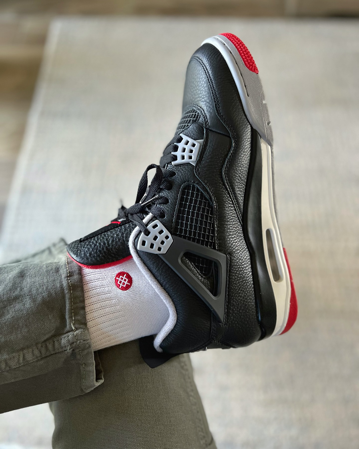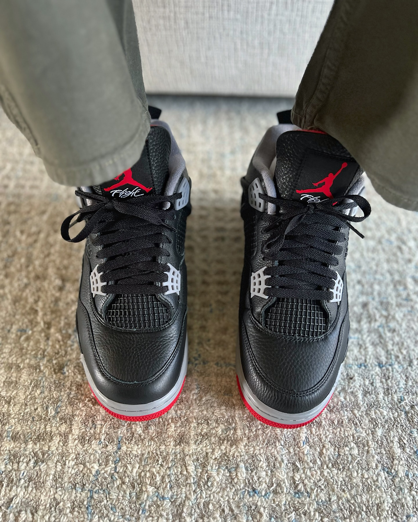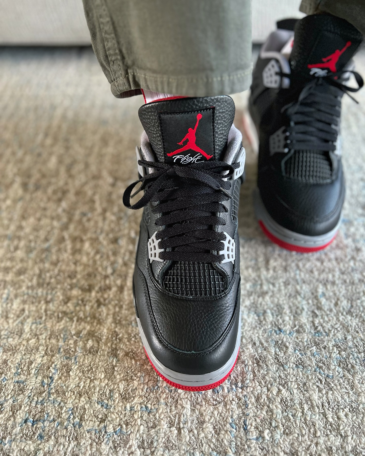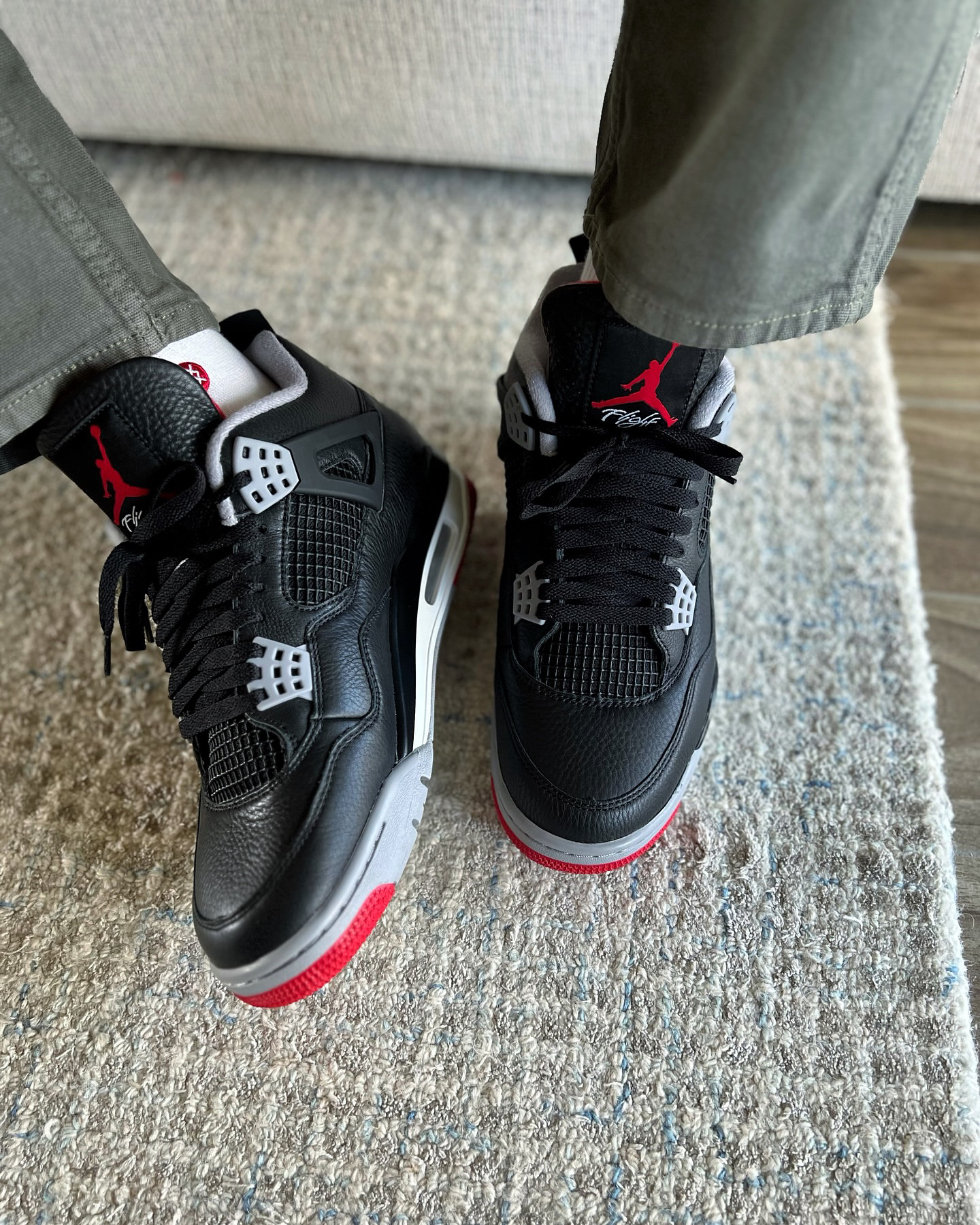 AJ4 Bred Reimagined鞋身由元年的麂皮更换为了牛皮革,更加耐脏好打理,唯一缺点就是鞋型仔细看没有麂皮版那么精致,不过上脚的话可以忽视🥰