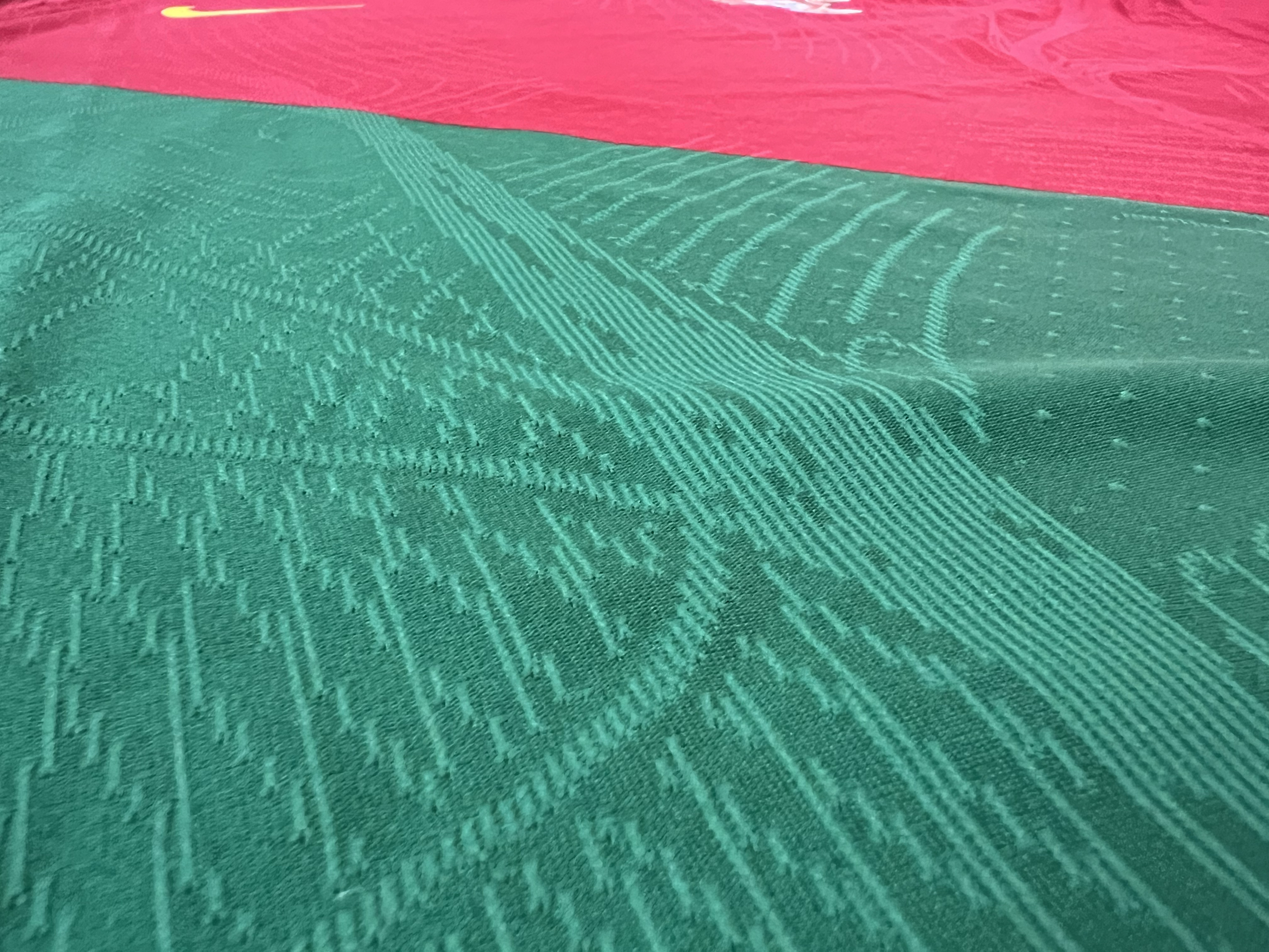 #开箱一耐克 #葡萄牙球衣 入手葡萄牙🇵🇹2022卡塔尔世界杯主场球员版! 设计:个人认为这款是葡萄牙乃至全世界最具创意、把less is more发挥至极致的设计。把球衣球裤看做一个设计整体,经典酒红和绿色被整块地斜切在球衣黄金分割位置,球裤全绿。暗纹形似树木,主要集中在绿色部分。球衣的队徽和钩子logo均是烫印。版型:亚版XL码,泰国🇹🇭产,宽松,喜欢修身的朋友可以买小一码。质感:面...
