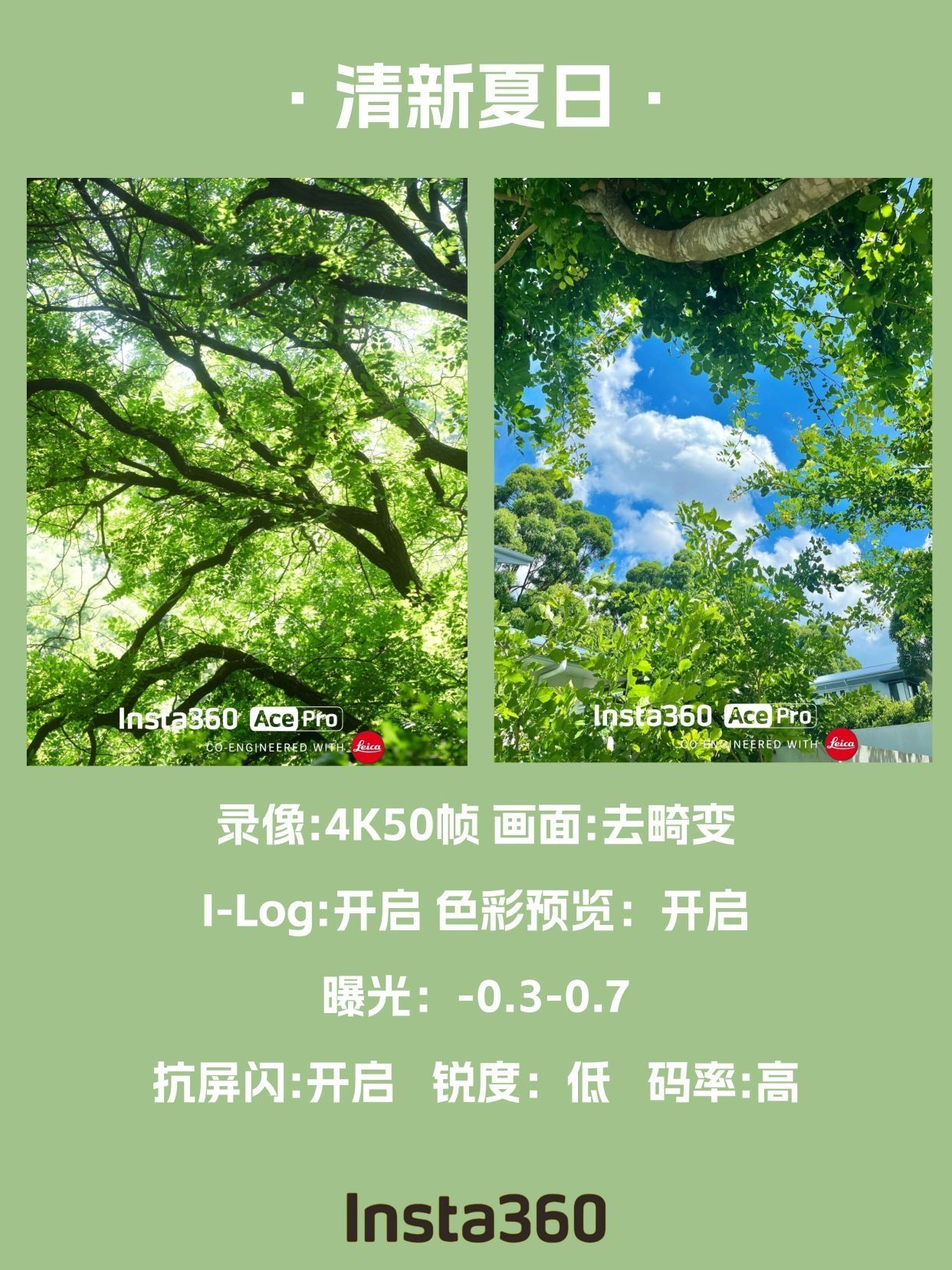 博主为大家整理了影石acepro2 六个万能公式 1⃣️冷白皮氛围人像 2⃣️旋焦花朵 3⃣️清新夏日 4⃣️氛围夜景 5⃣️复古街景 6⃣️氛围雨天 ✨清新夏日需要log还原!! 宝子们快收藏起来吧,从此秒变专业摄影师哦! 再也不用为不出片而烦恼啦! 现实明暗光线均有不同,可自由调节参数哦!